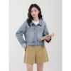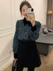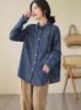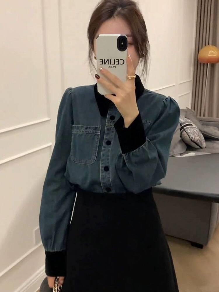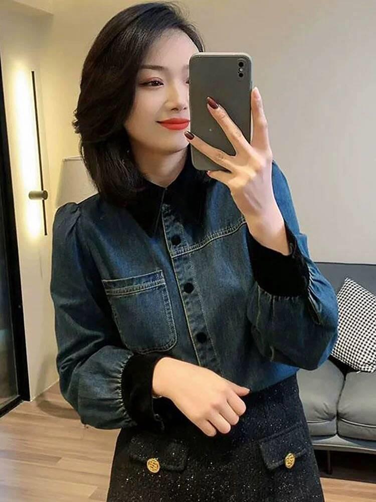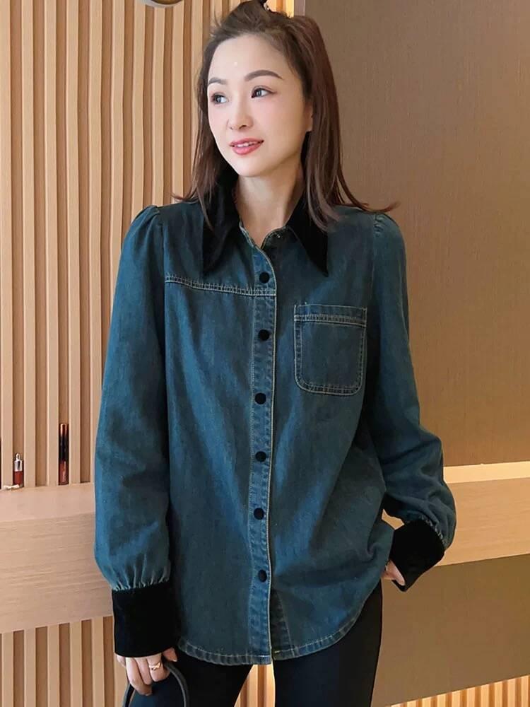 Camisa vaquera con forro polar para mujer, manga larga, primavera y otoño 2024, nueva moda, camisa apilada de color en contraste, top informal holgado