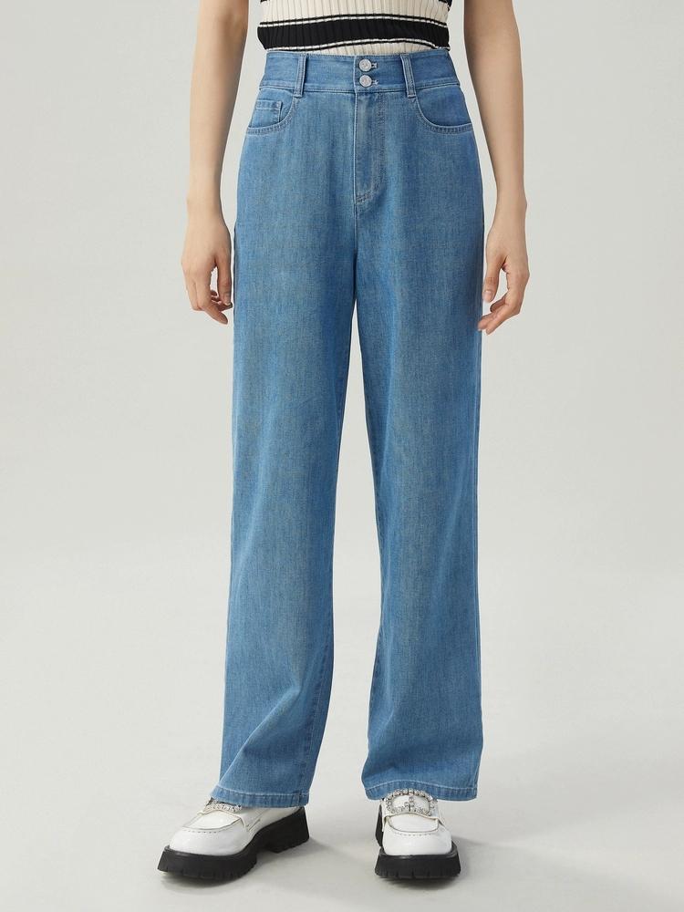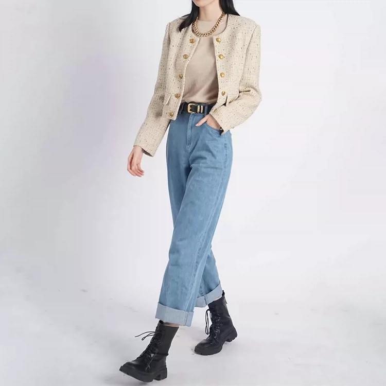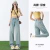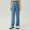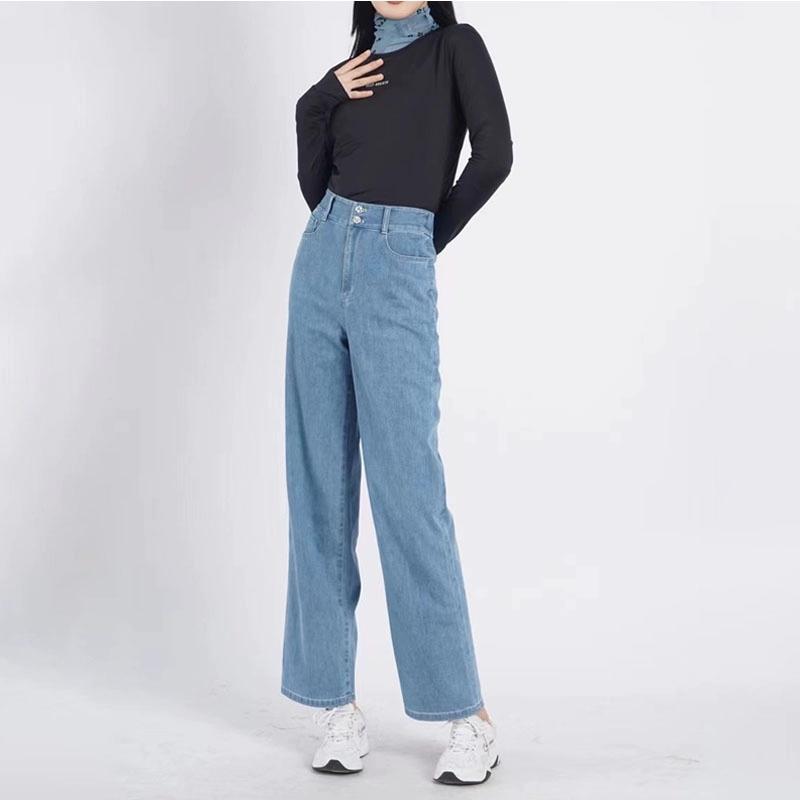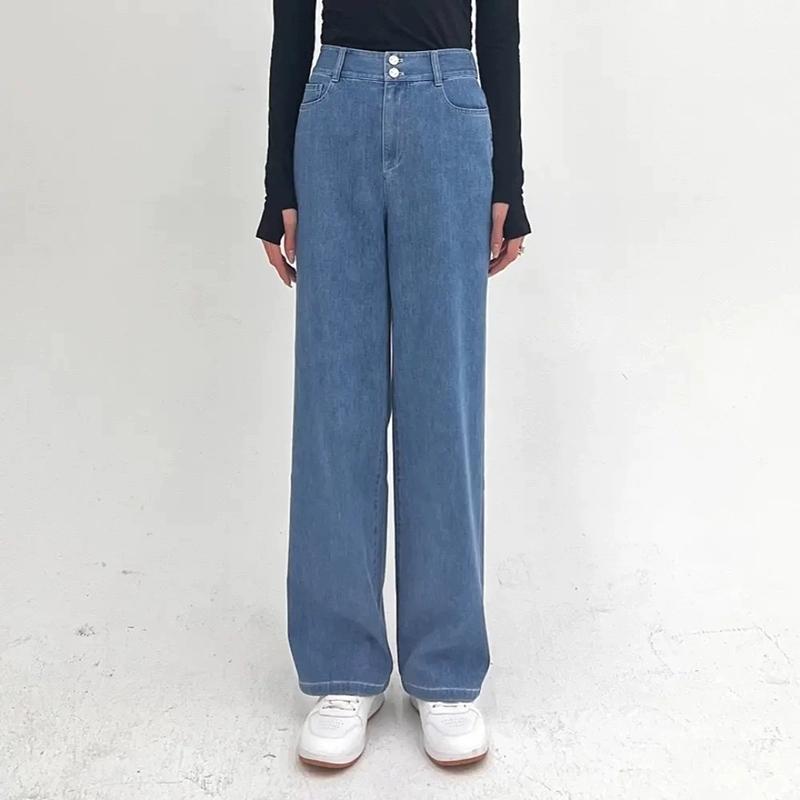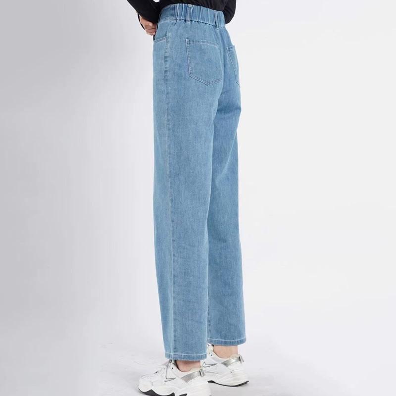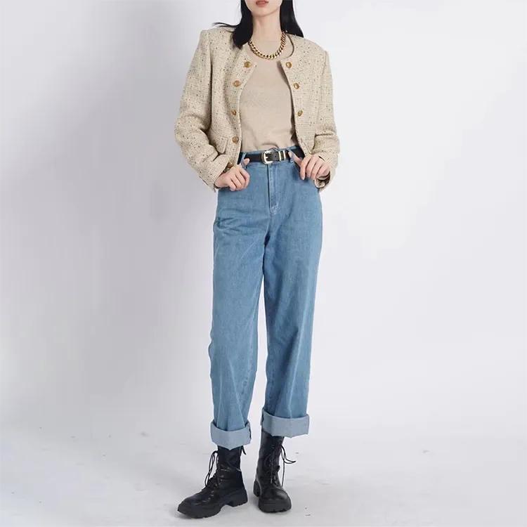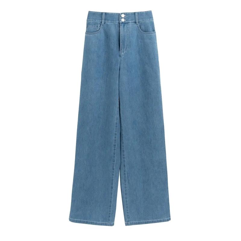 Descuento comercio exterior otoño 2024 casual elástico cintura alta dos botones pantalones rectos de pierna ancha jeans banana para mujer