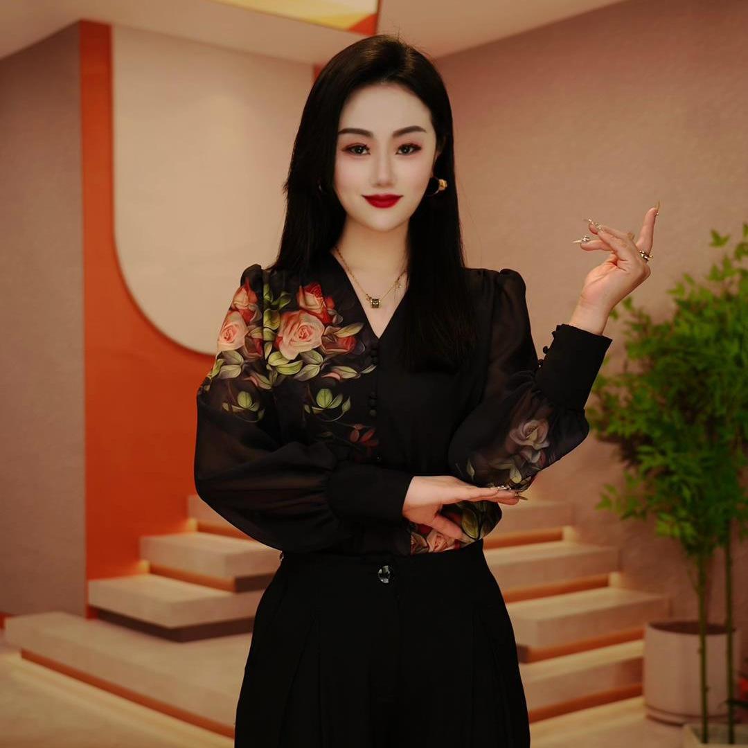 Camisa estampada de estilo occidental de moda para mujer, nueva camiseta de primavera 2024, camiseta de mujer de manga larga con cuello en V, top adelgazante de temperamento versátil para mujer