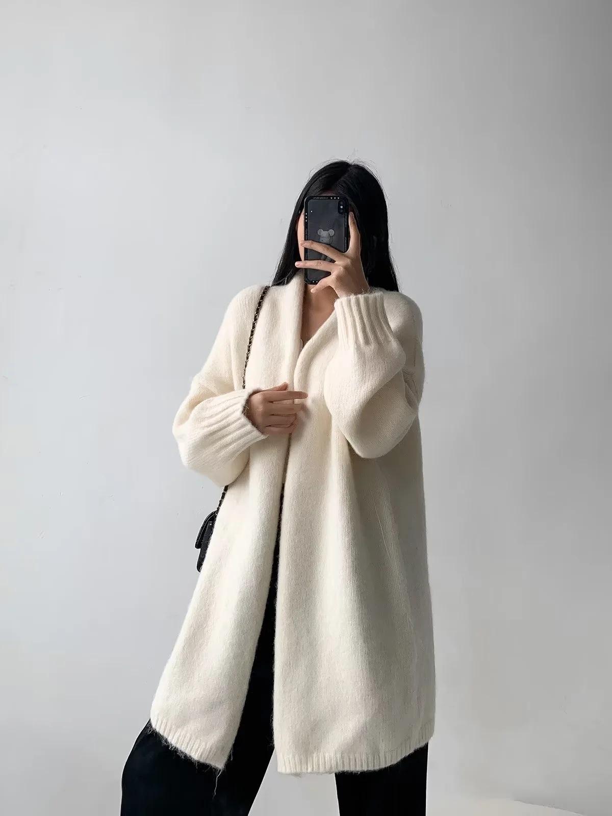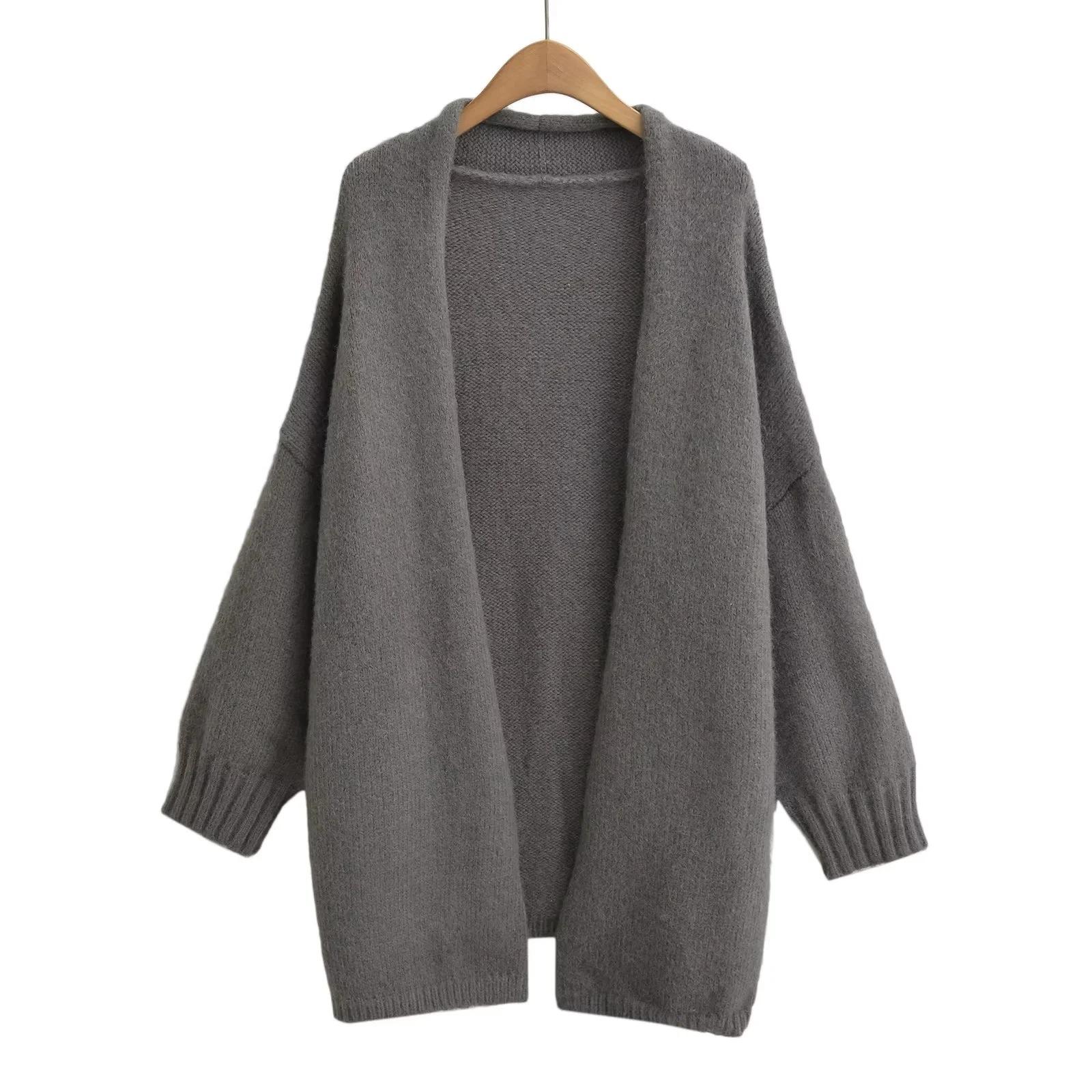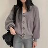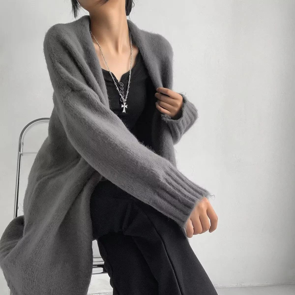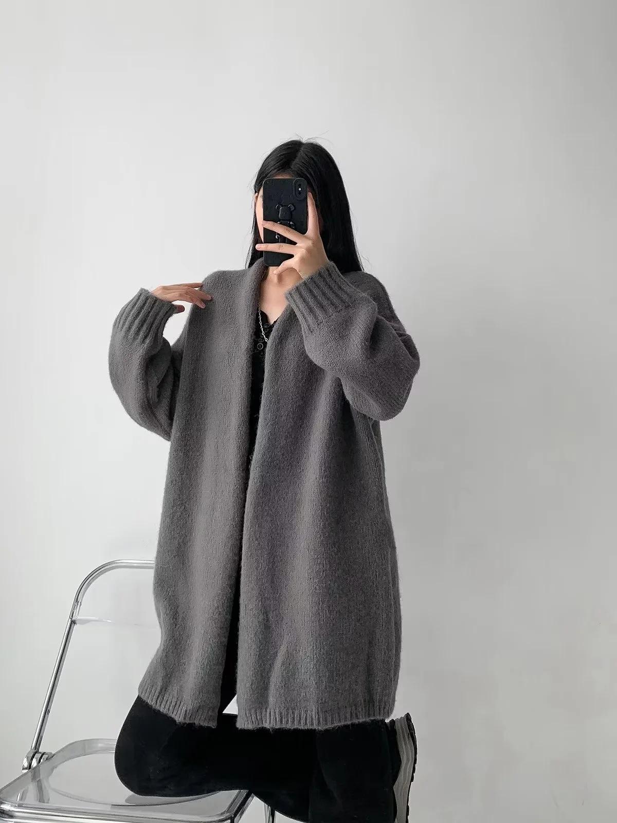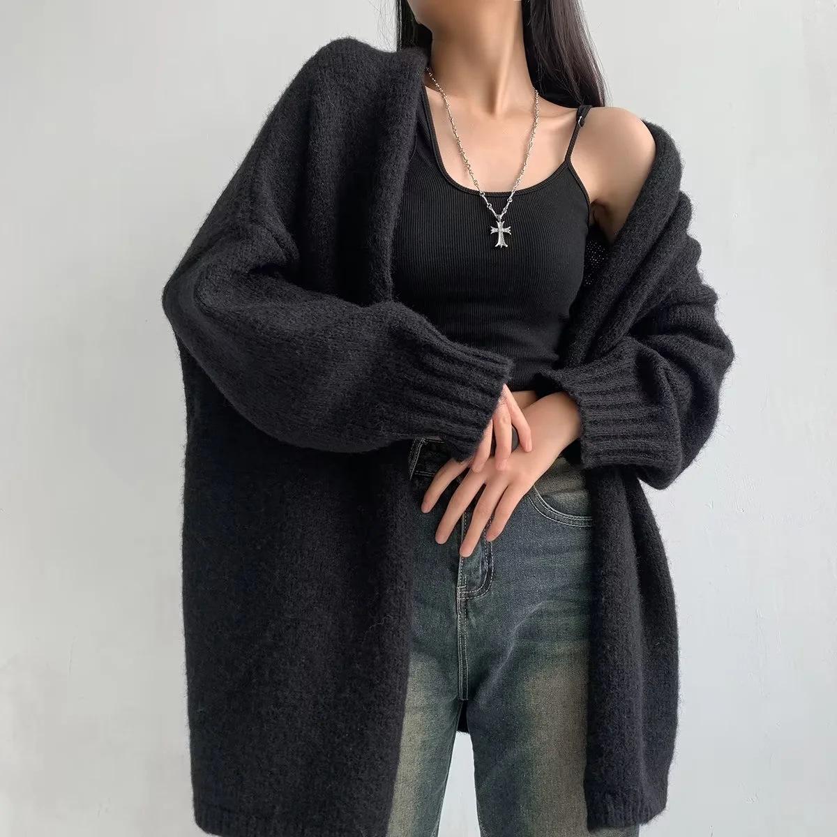 Chaqueta Suéter Retro de Largo Medio con Manga Farol para Mujer Otoño e Invierno Nuevo Abrigo Exterior Estilo Holgazán Cárdigan de Punto Suelto