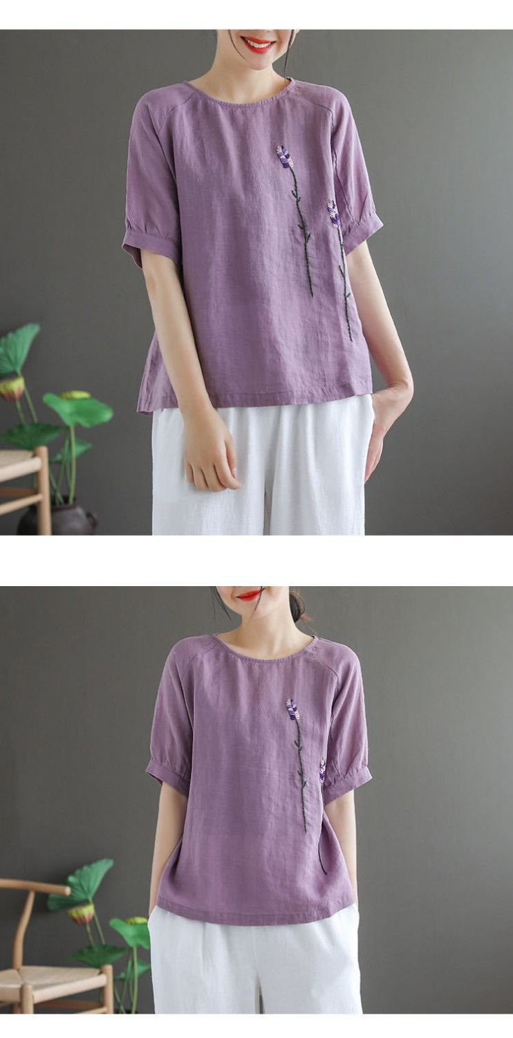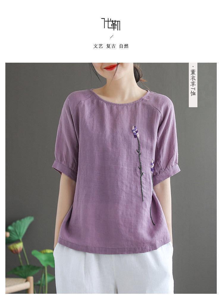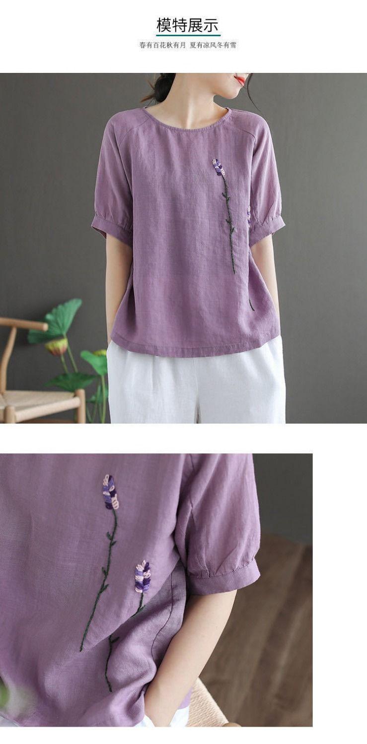 Camiseta de manga corta con cuello redondo de algodón y lino con bordado de flores retro artísticas para mujer, top holgado de talla grande a juego de verano para mujer.