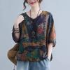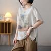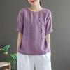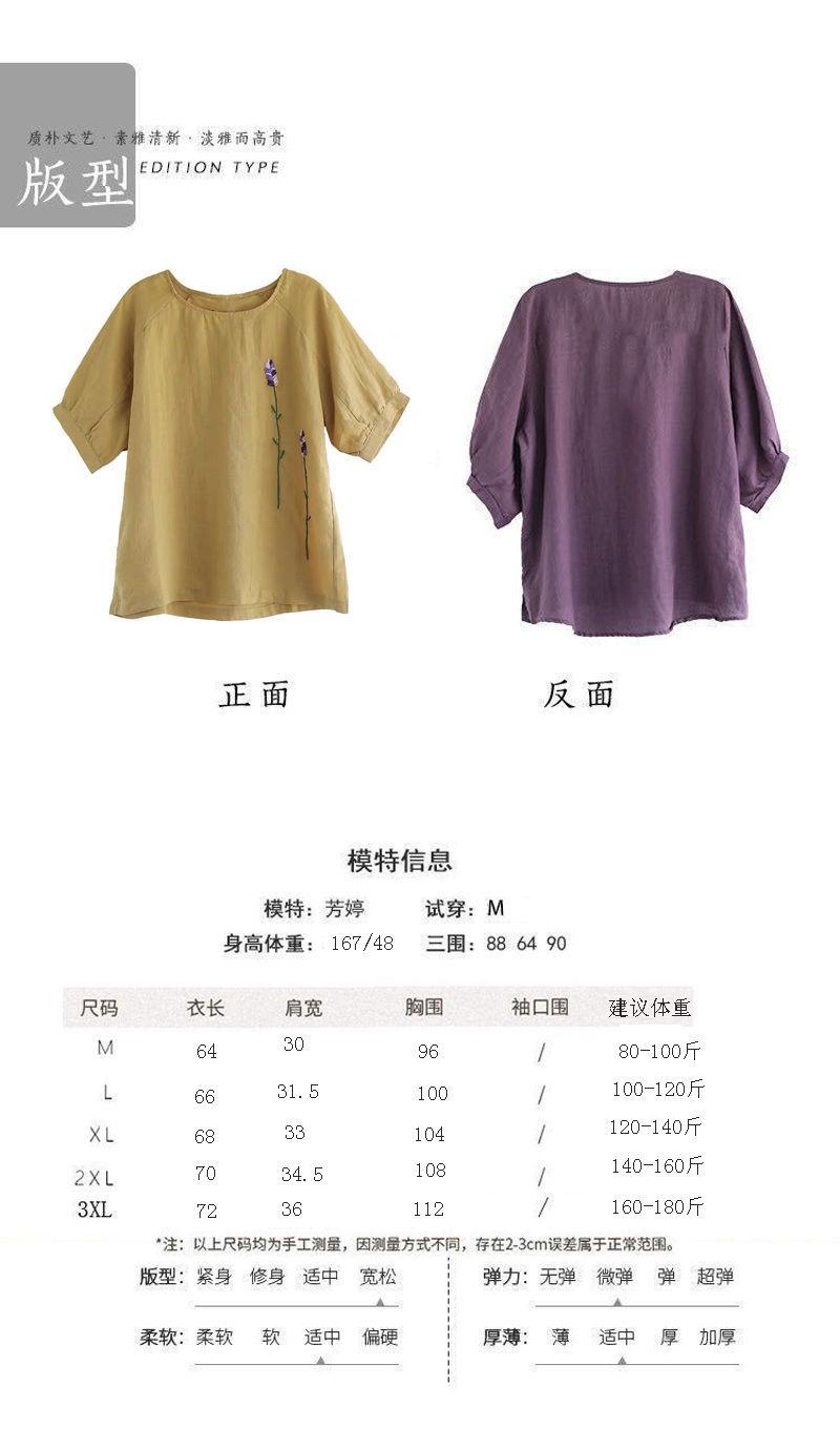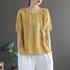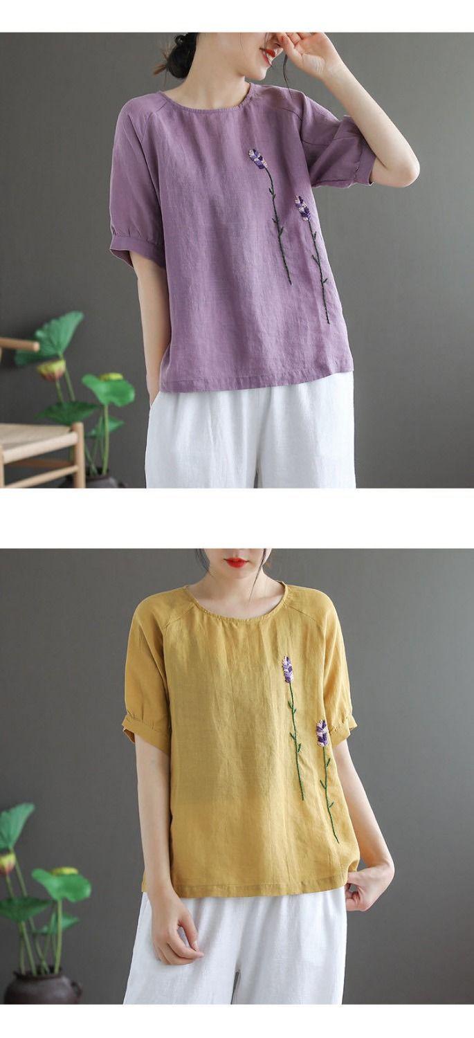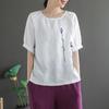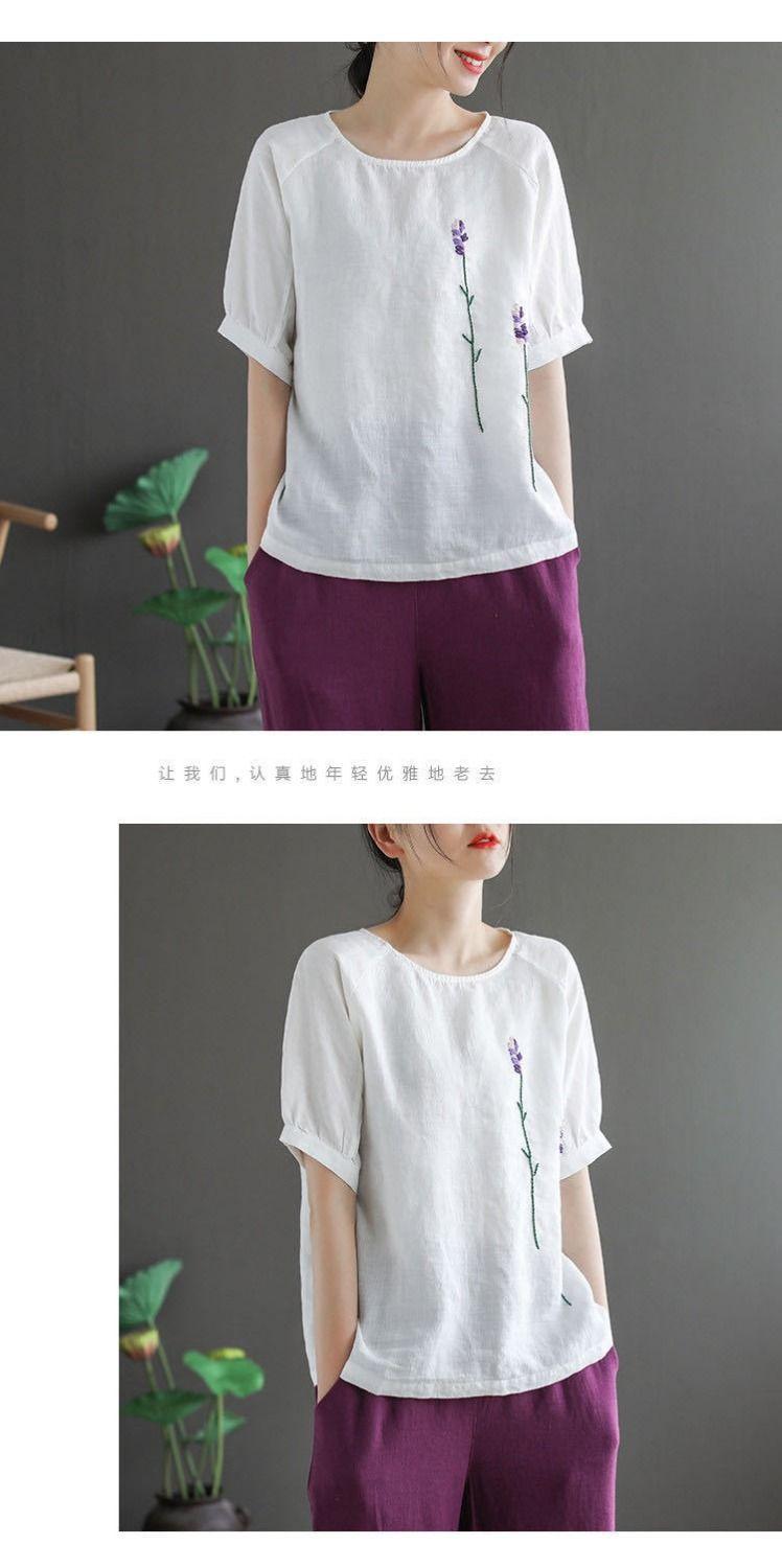 Camiseta de manga corta con cuello redondo de algodón y lino con bordado de flores retro artísticas para mujer, top holgado de talla grande a juego de verano para mujer.