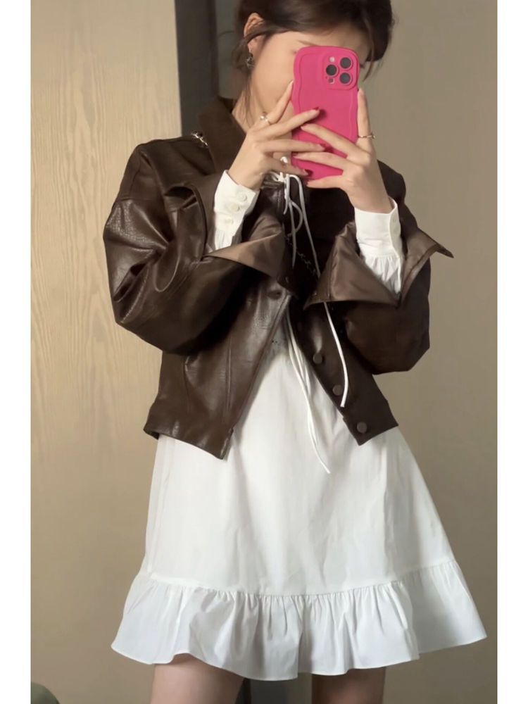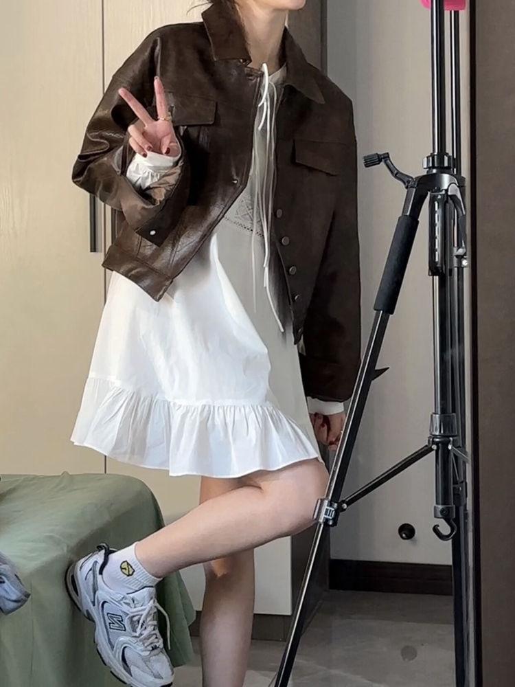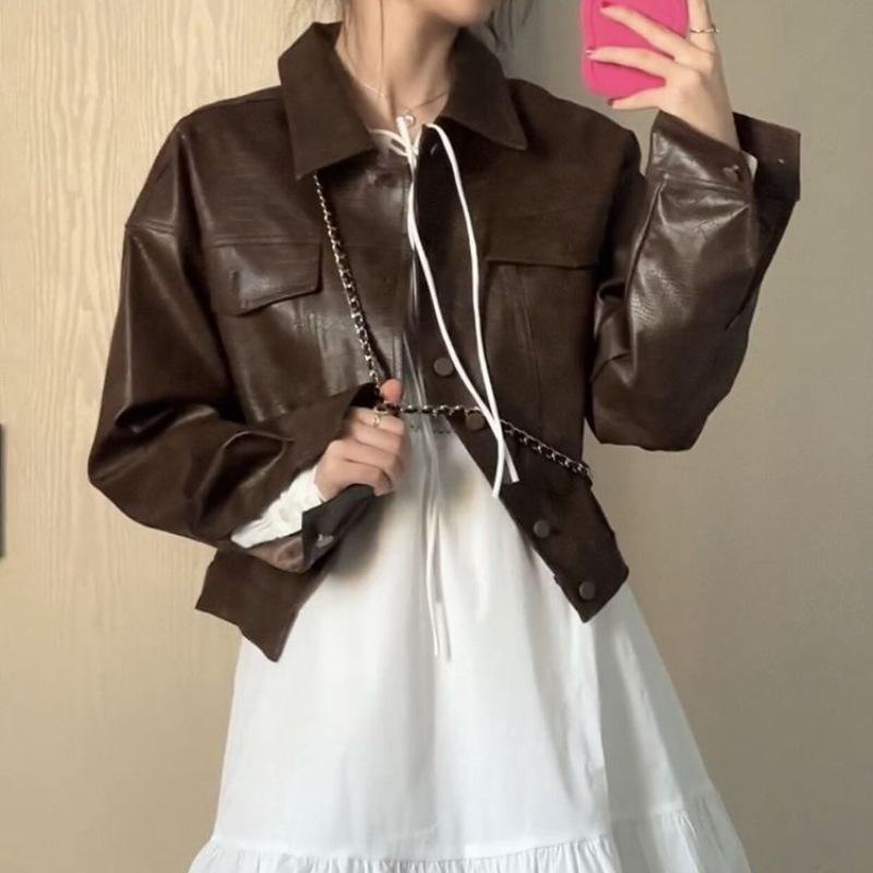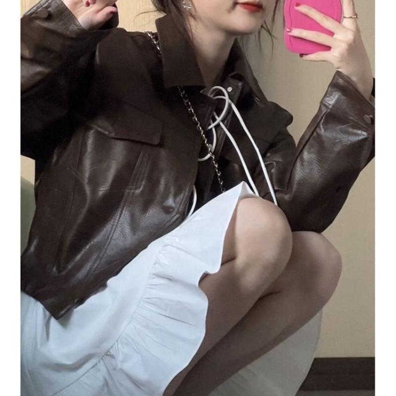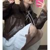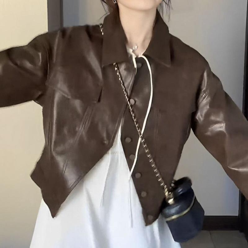 Chaqueta de Cuero para Mujer 2025 Primavera y Otoño Nueva Motocicleta Corta Marrón Diseño Retro Americano Chaqueta de Cuero Pu