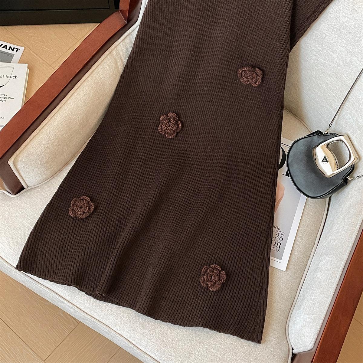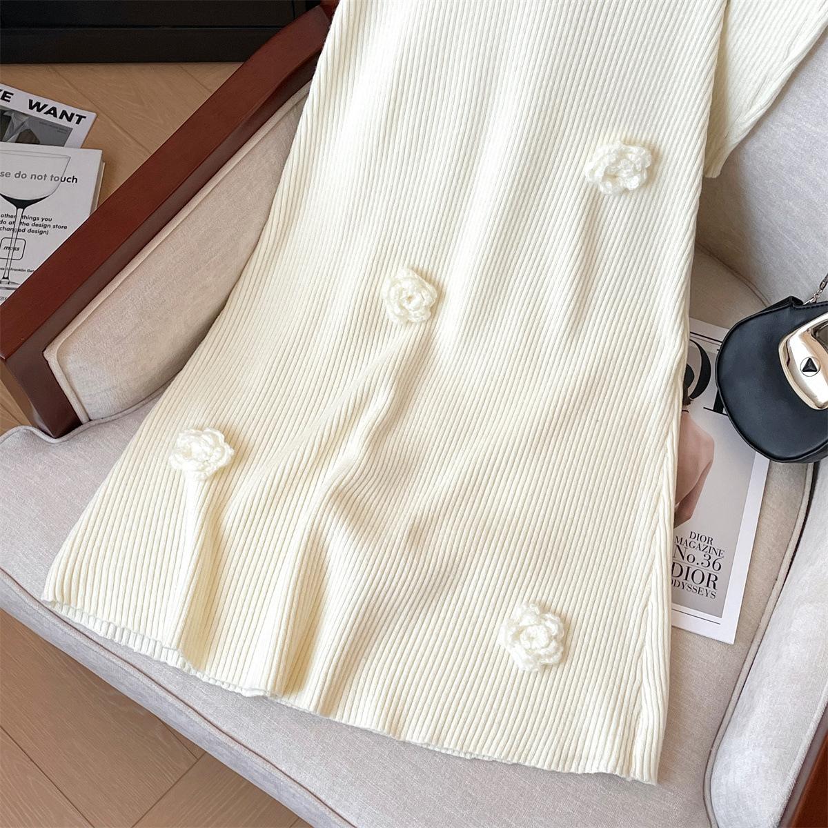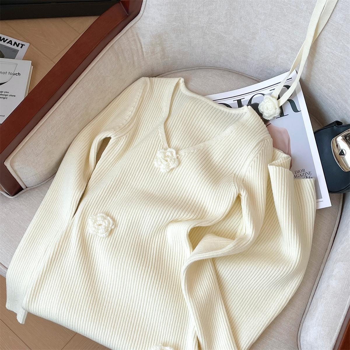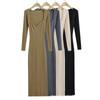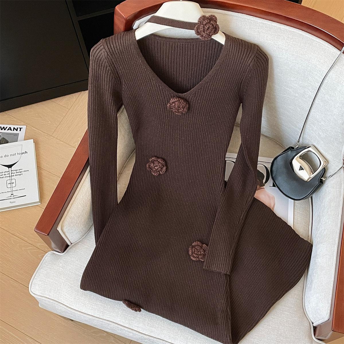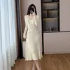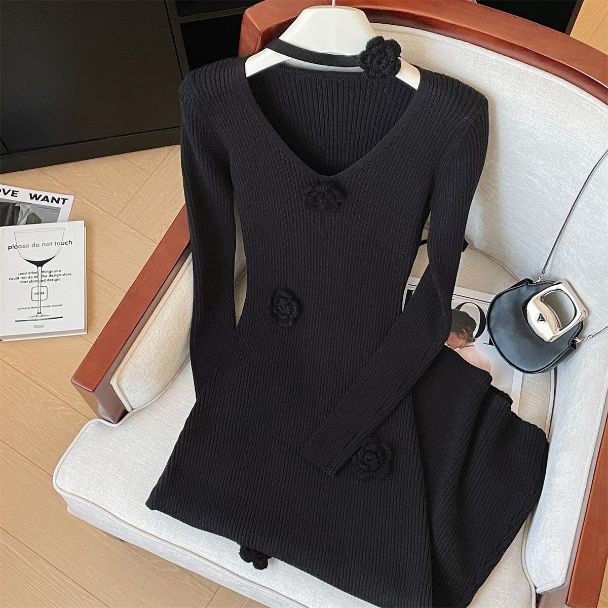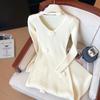 Foto real de dulce vestido de punto con cuello en V para mujer 2023 otoño e invierno nuevo fondo delgado falda de cola de pez larga sobre la rodilla