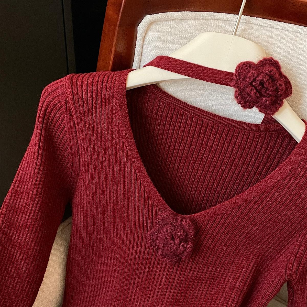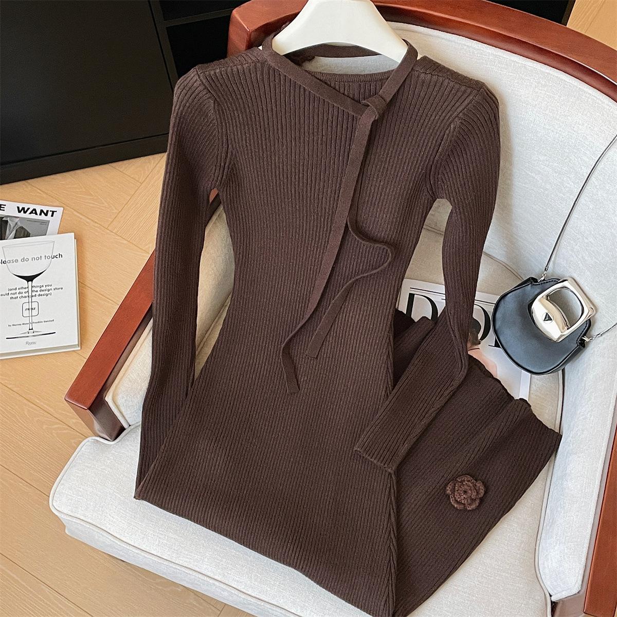 Vestido de punto con escote en V dulce de tiro real para mujer otoño e invierno 2023 Nuevo vestido de cola de pez ajustado con fondo largo sobre la rodilla