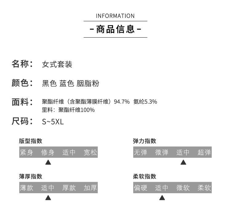 Black suit, Rouge Powder Suit, Blue suit, Black dress, Rouge powder dress, Blue Dress, Black suit + black dres...