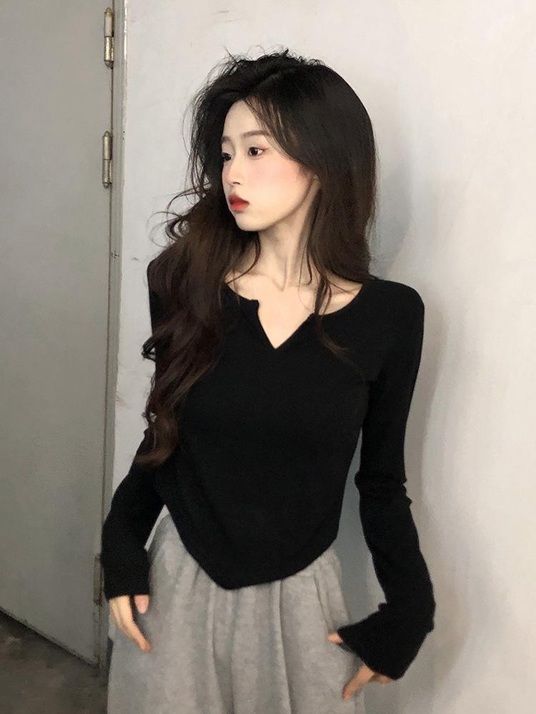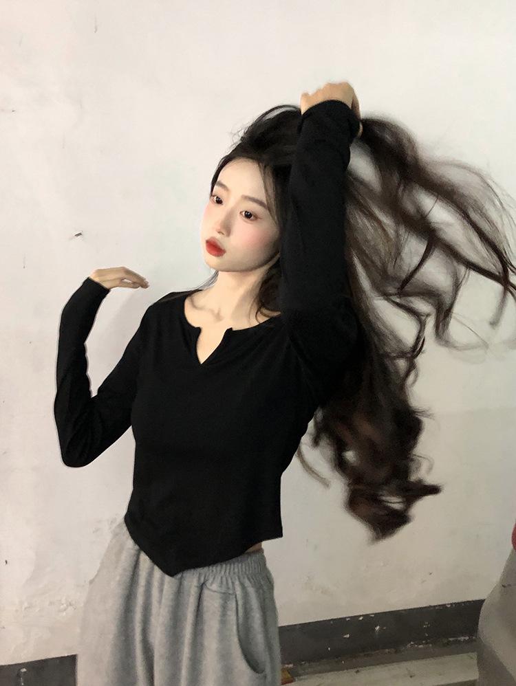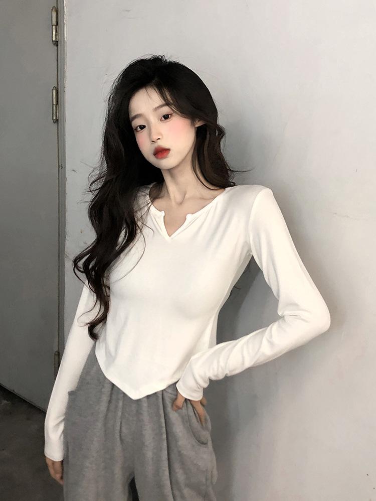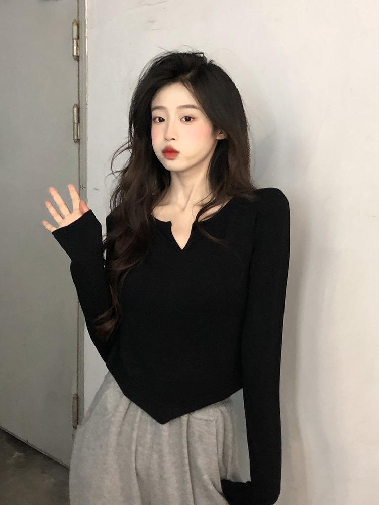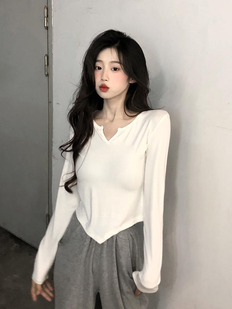 Playera Irregular de Manga Larga para Mujer Primavera 2025 Nuevo Estilo Coreano Estilo Puro Lujuria Nicho Chica Slim Corta Top de Fondo