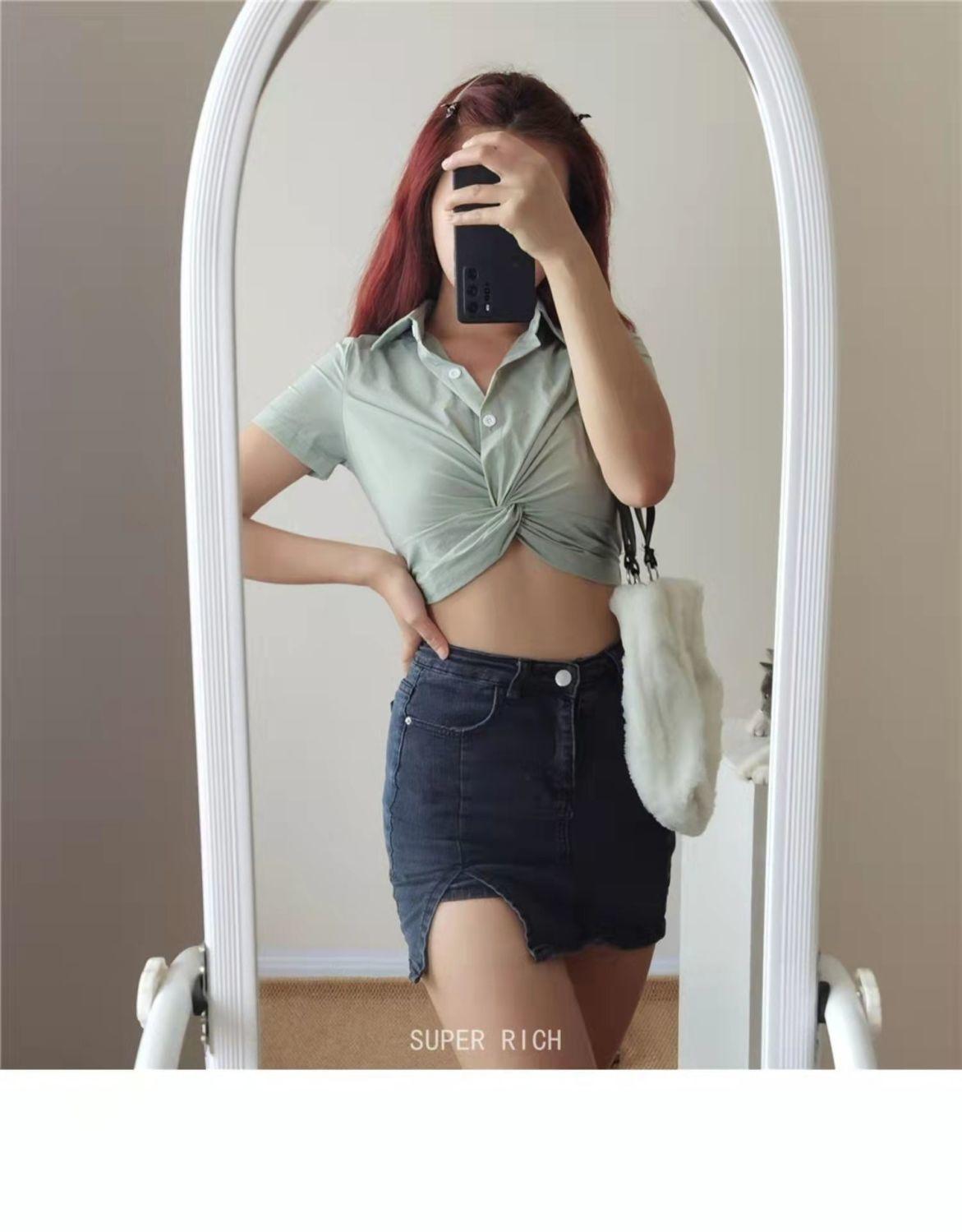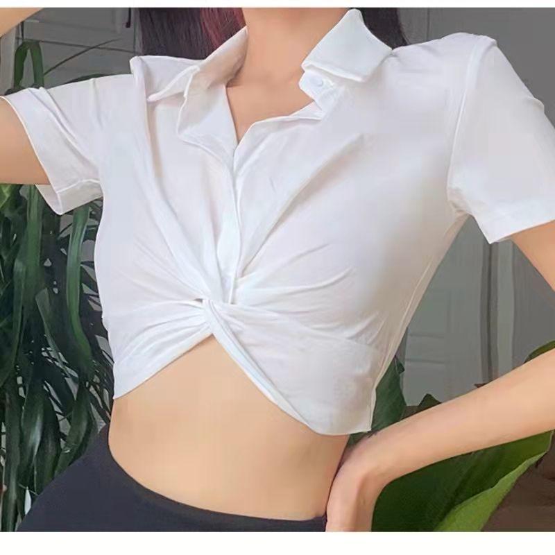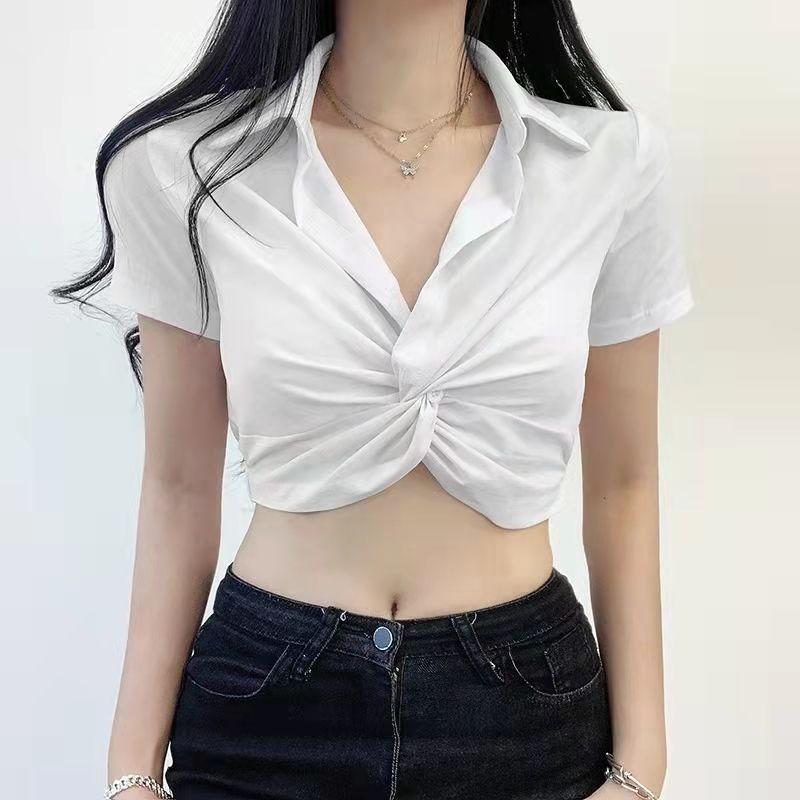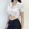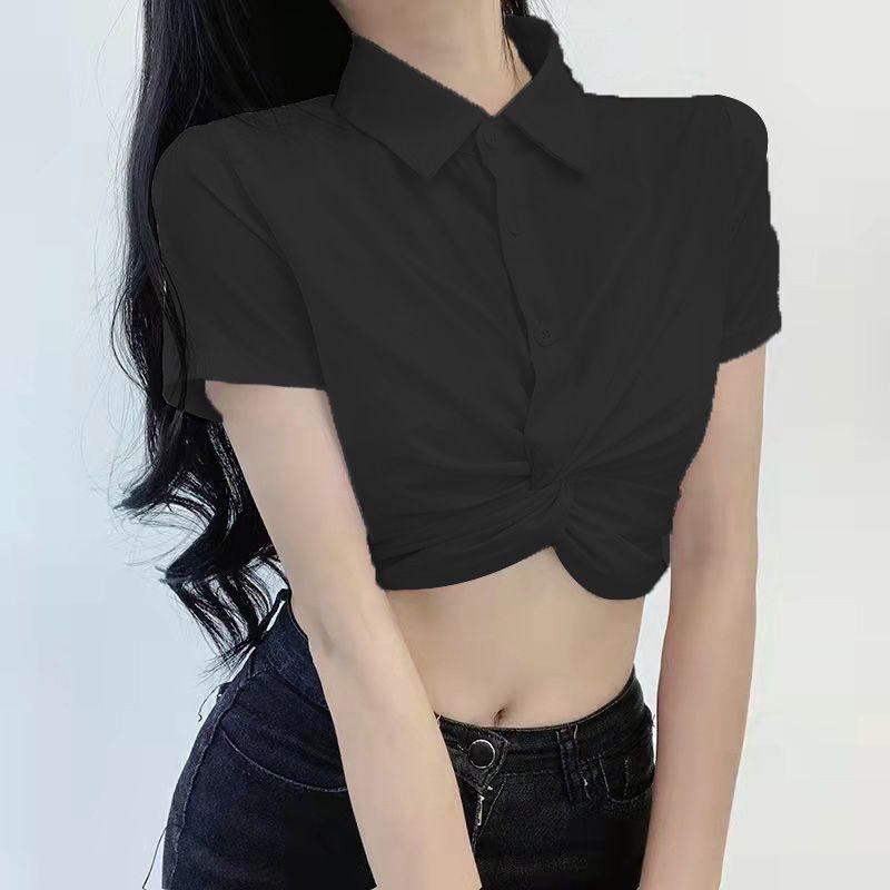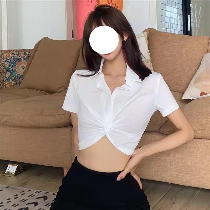 Camisa de cuello polo con giro retro versátil de estilo coreano de primavera y verano, camiseta corta ajustada con botones y cuello en V, camiseta Bm de moda.