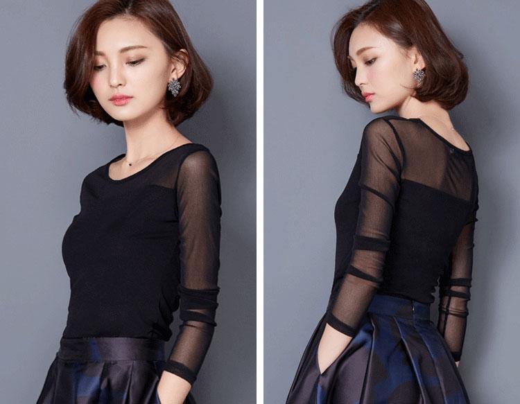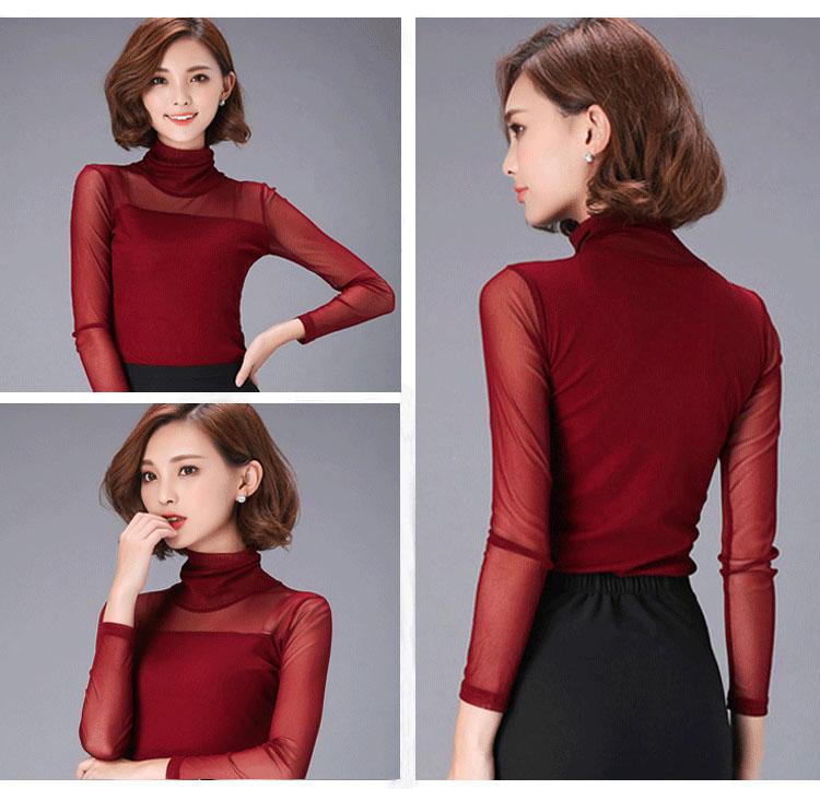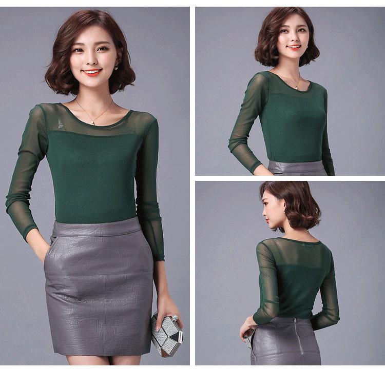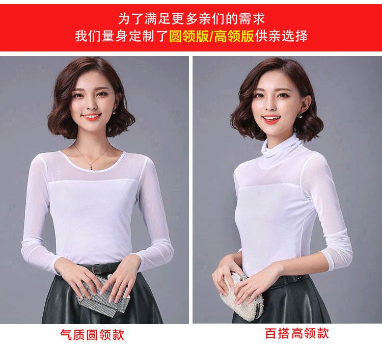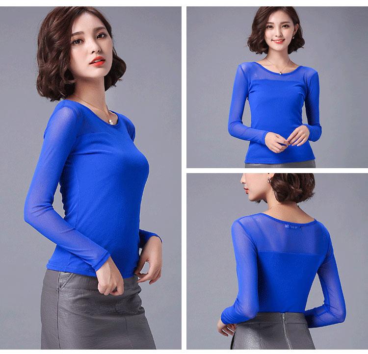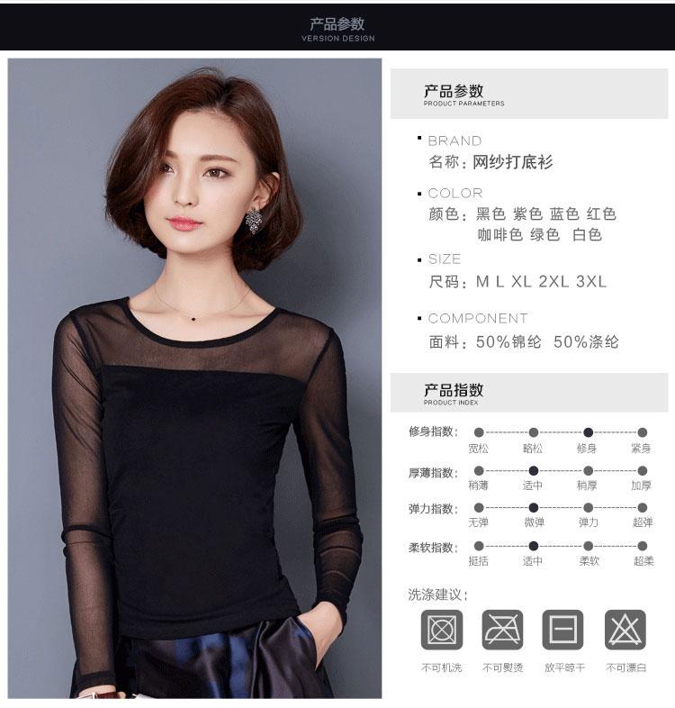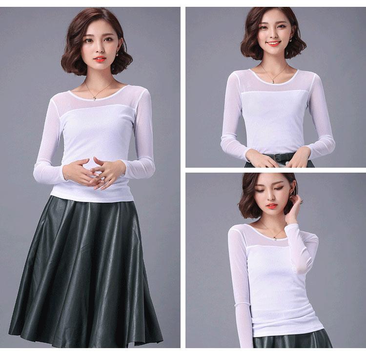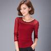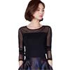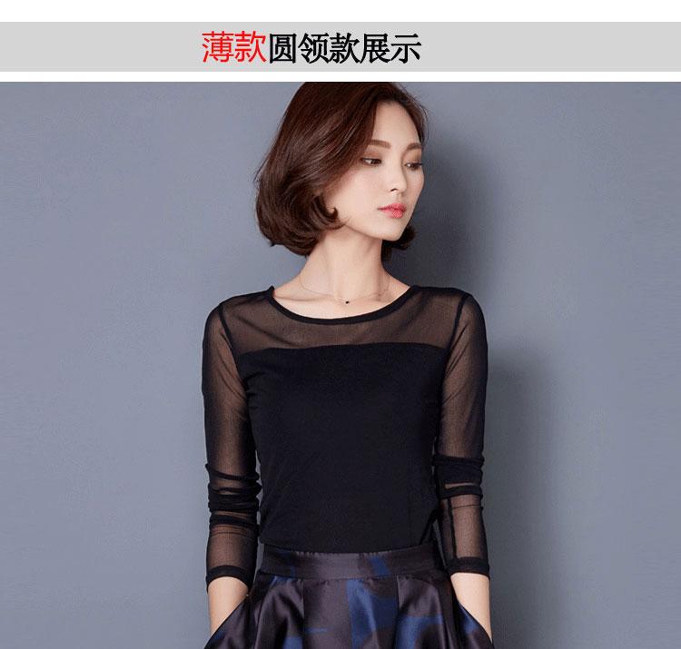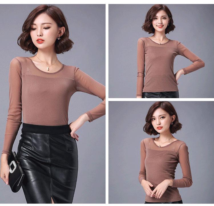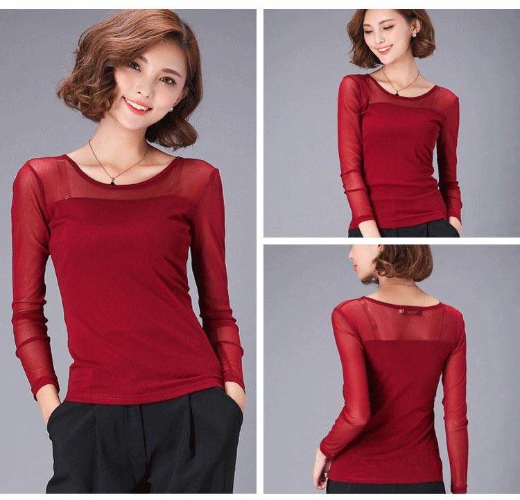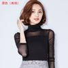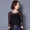 Camisa de encaje con cuello redondo de talla grande y corte entallado para primavera y otoño, camiseta de malla con parte inferior, camiseta de manga larga para mujer, prenda exterior que combina con todo.