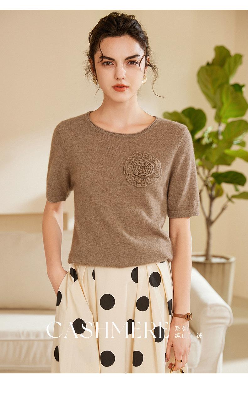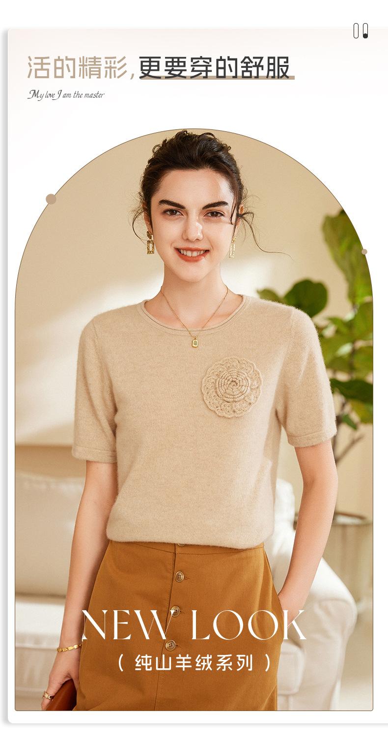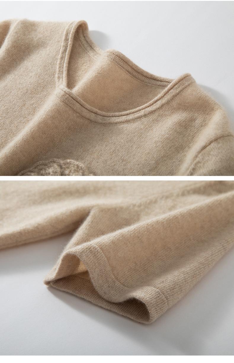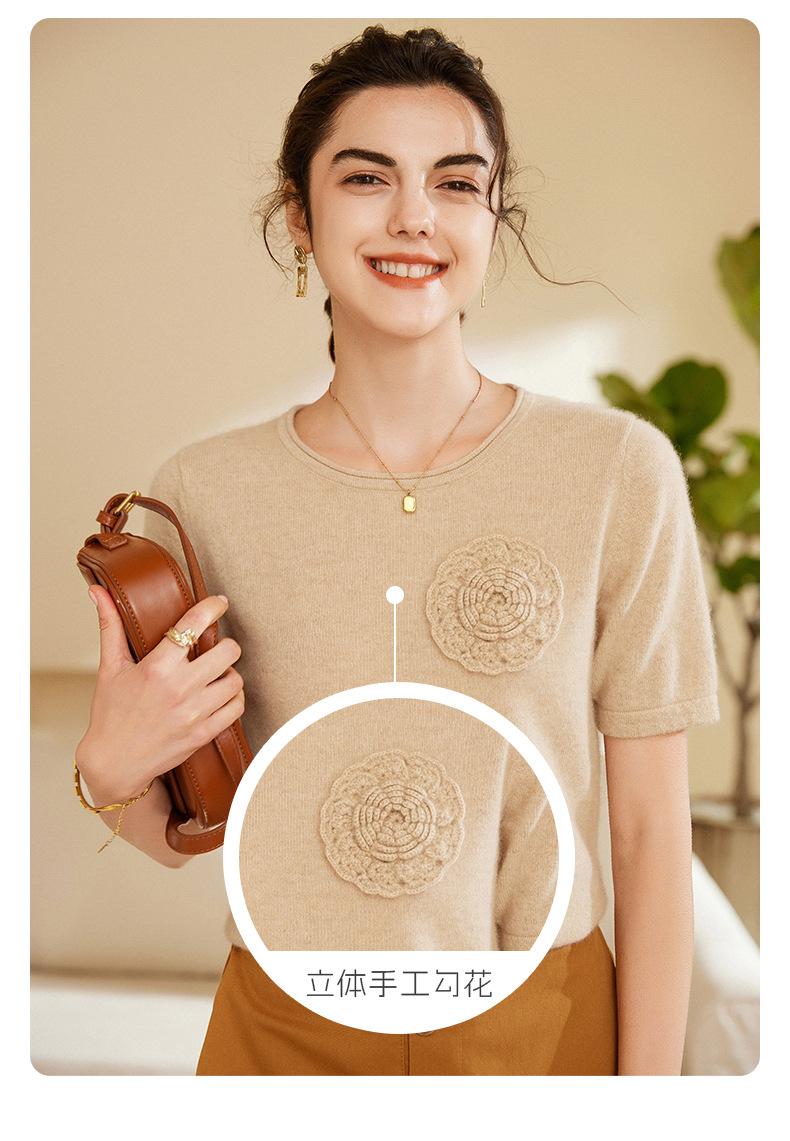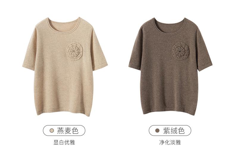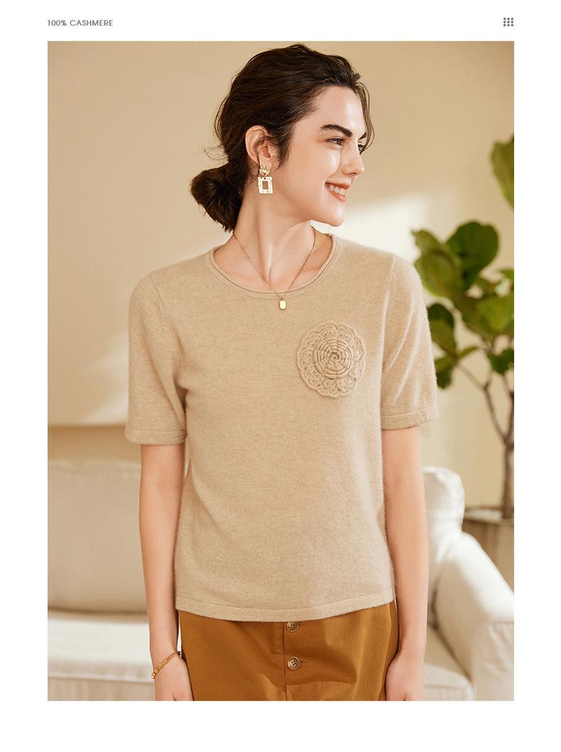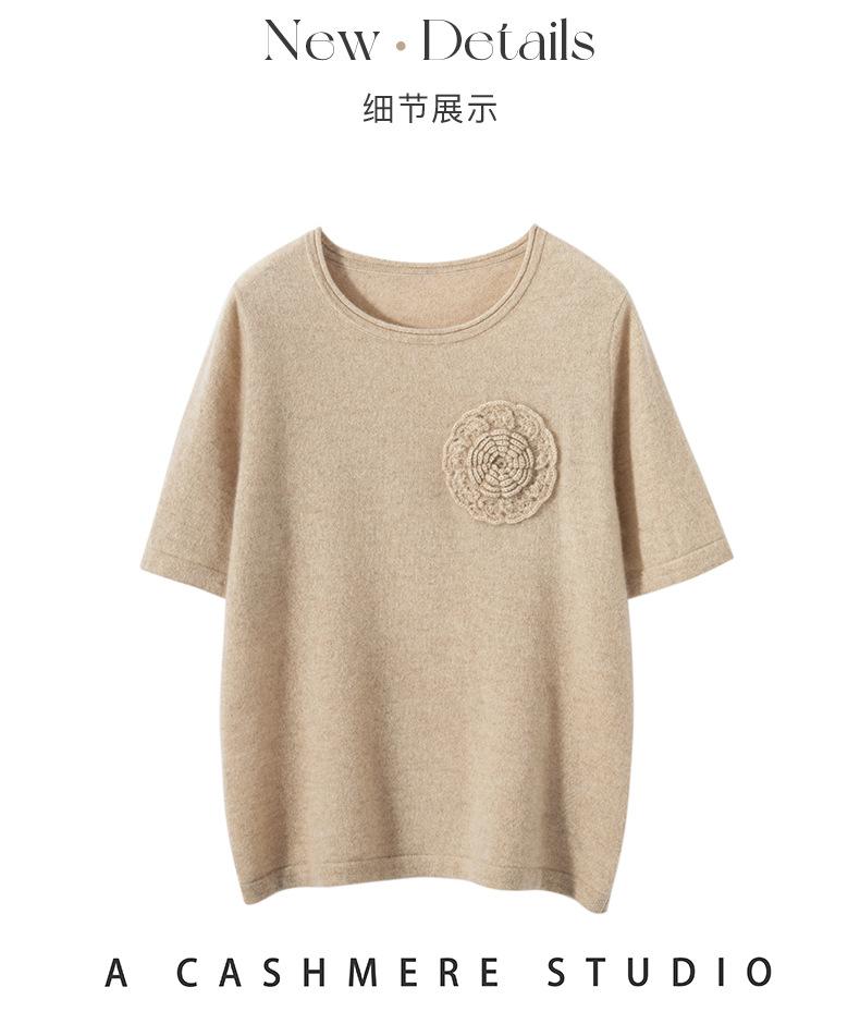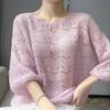 Suéter de Cachemira 100% Pura de Cuello Redondo Tejido a Crochet de Manga Corta para Mujer Otoño e Invierno 2024 Nuevo Color Puro Manga Tres Cuartos Suelto