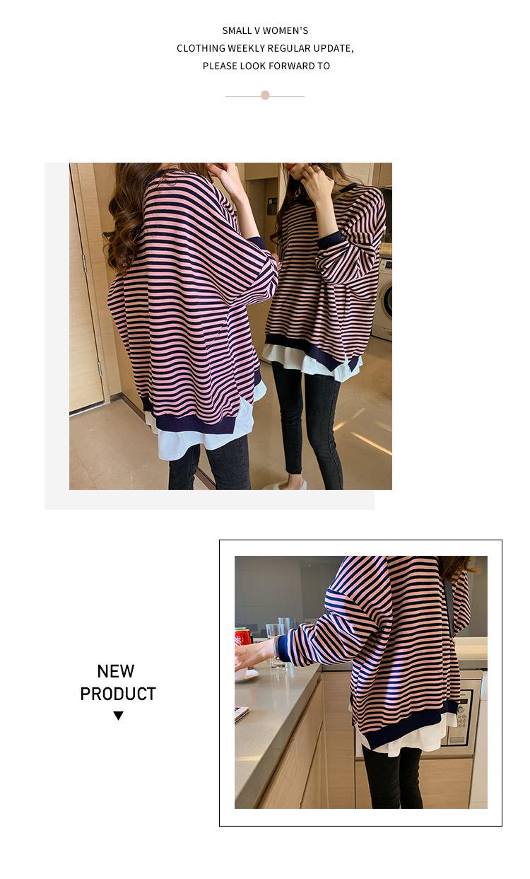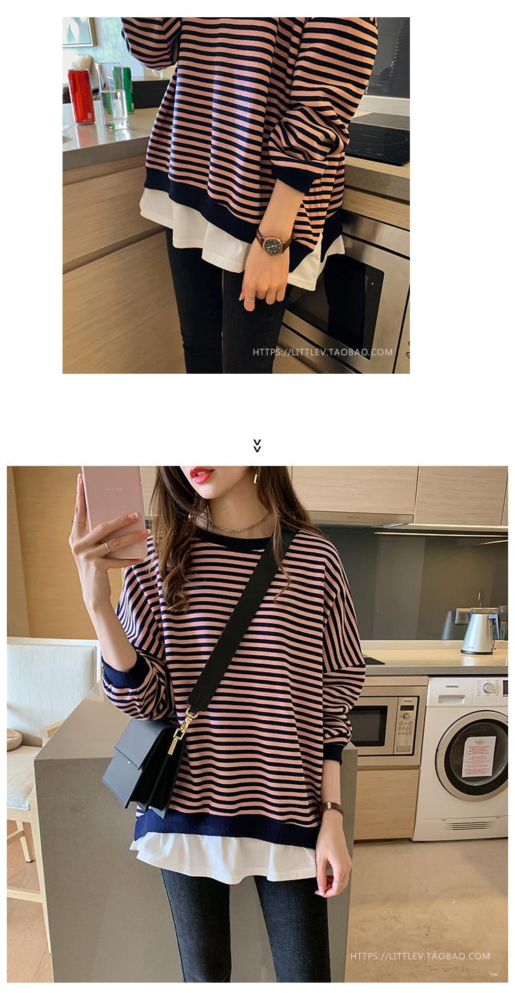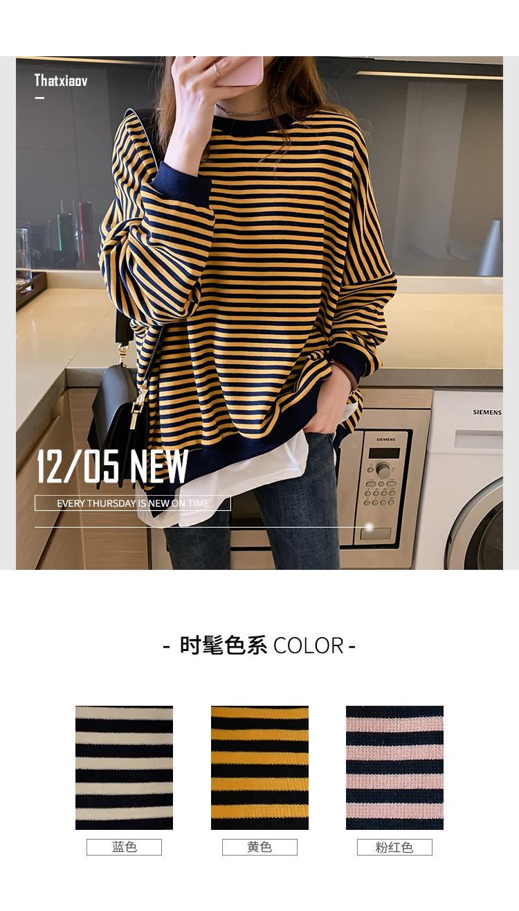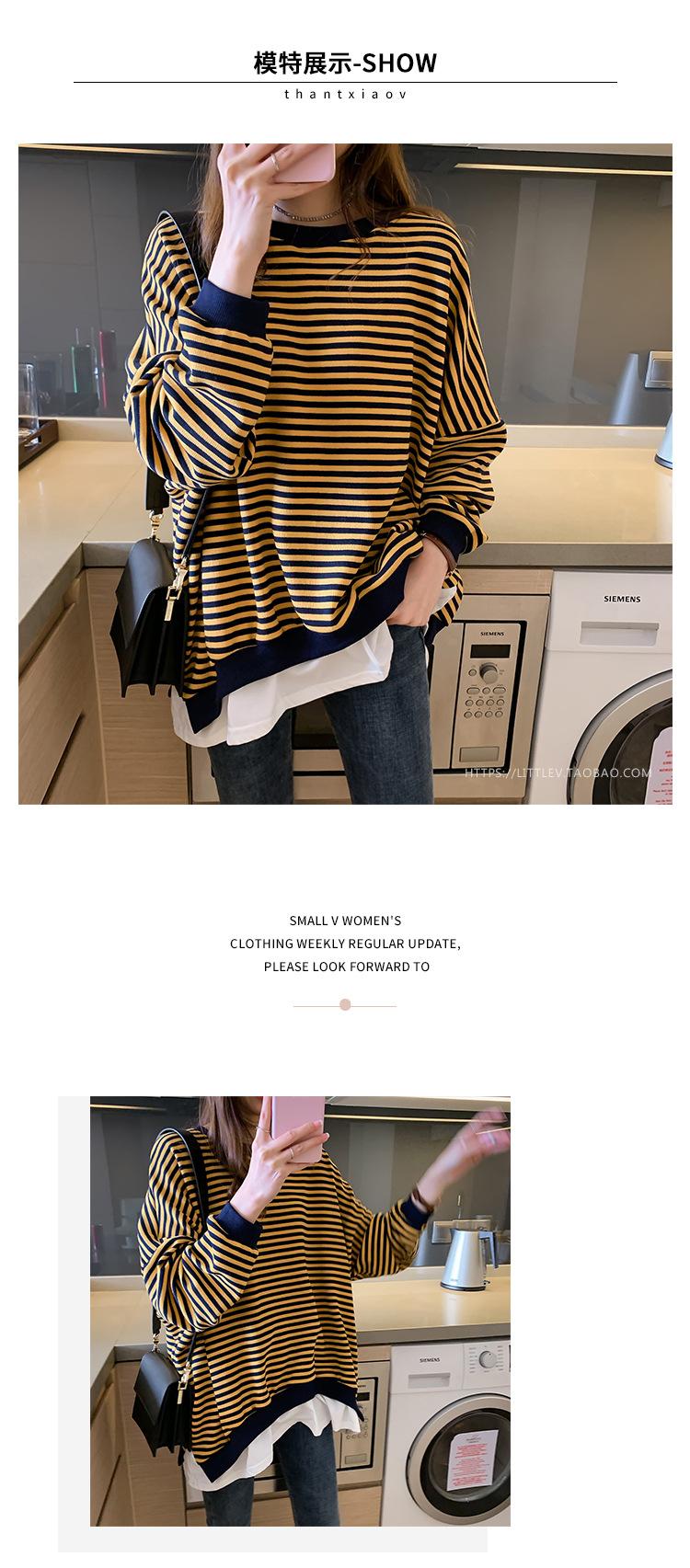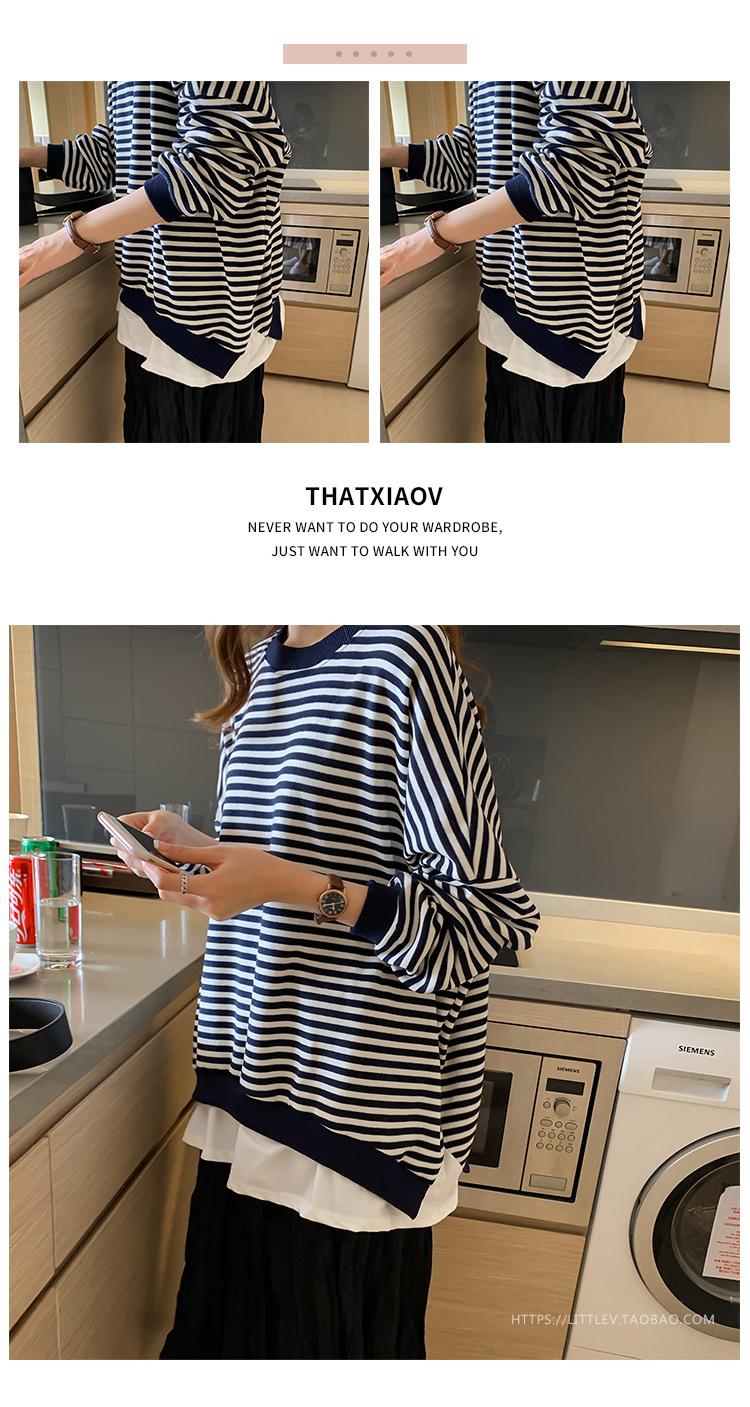 2024 Nuevo Estilo Hong Kong Retro Chic Sudadera Rayada Falsa de Dos Piezas para Mujer Manga Larga Cuello Redondo Top Chaqueta Casual