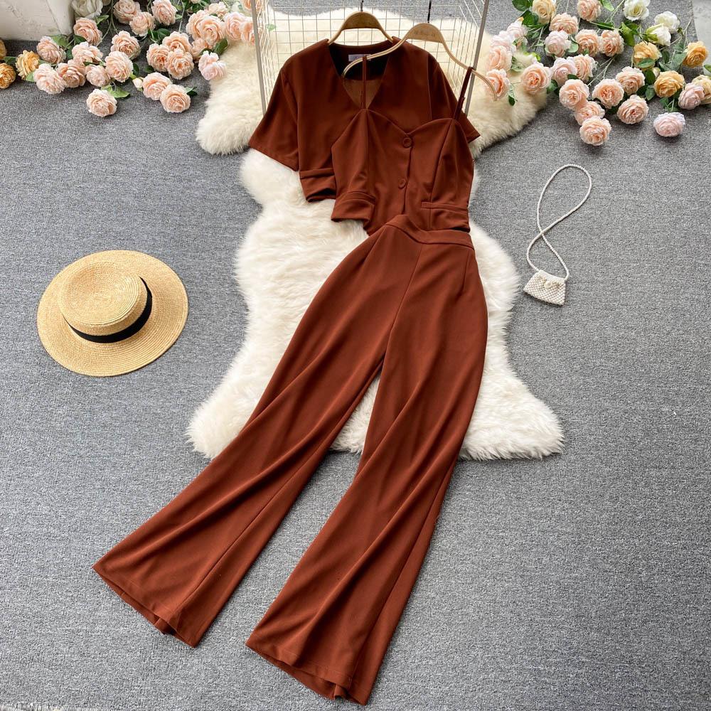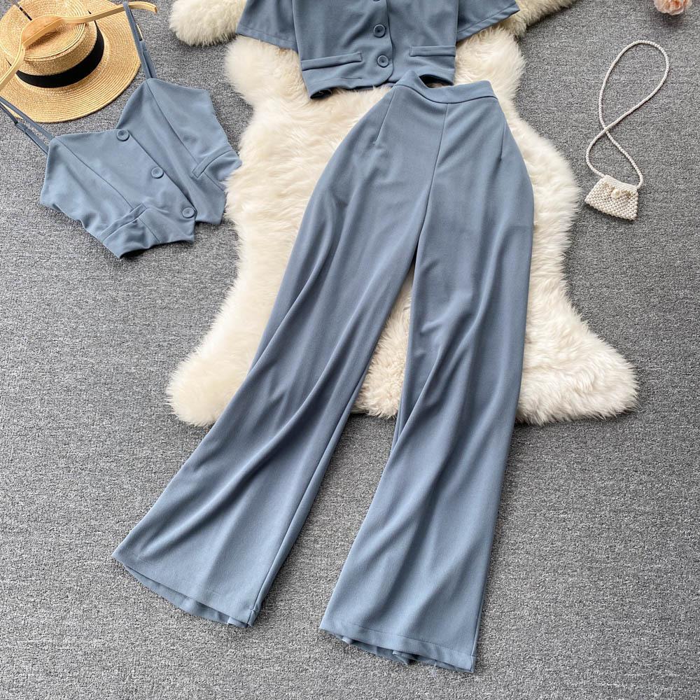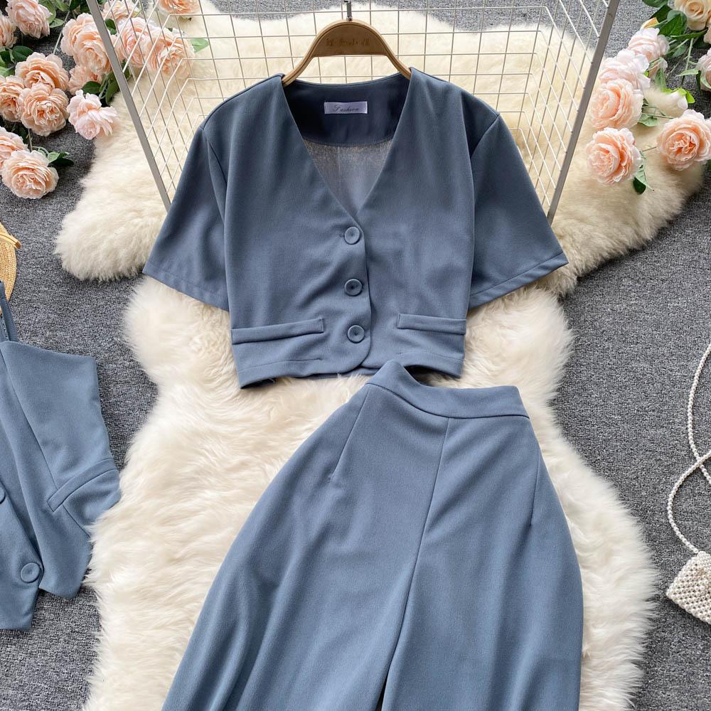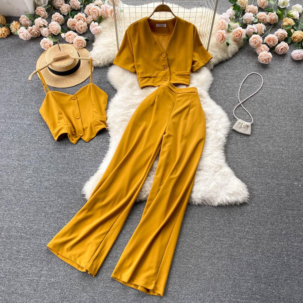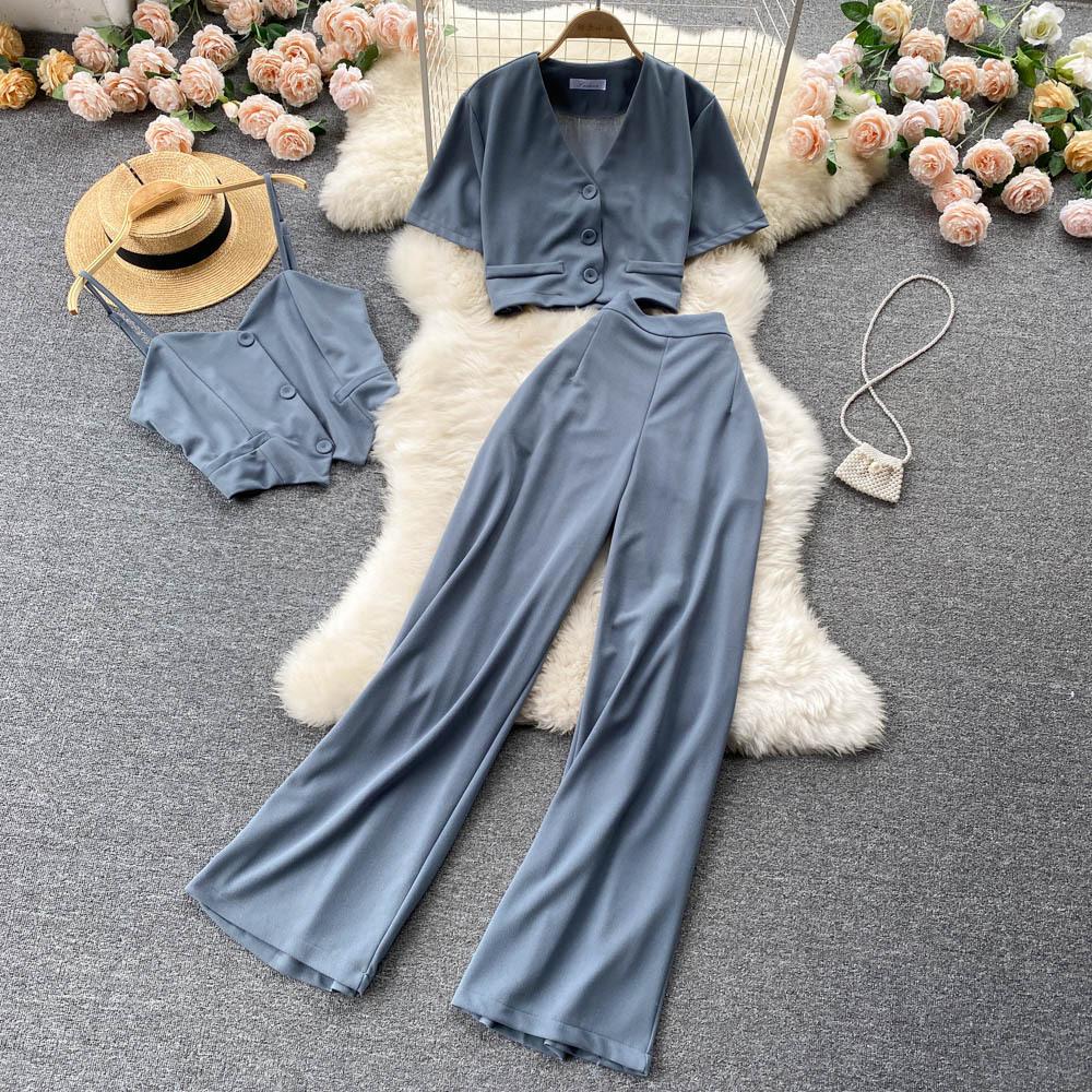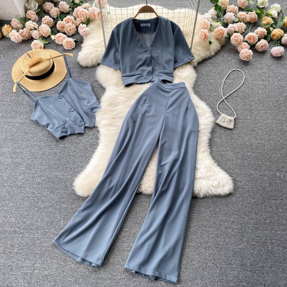 Traje de moda coreana para mujer, camisola de verano, camisa corta con cuello en V, abrigo, pantalones de pierna ancha de cintura alta, conjunto de tres piezas