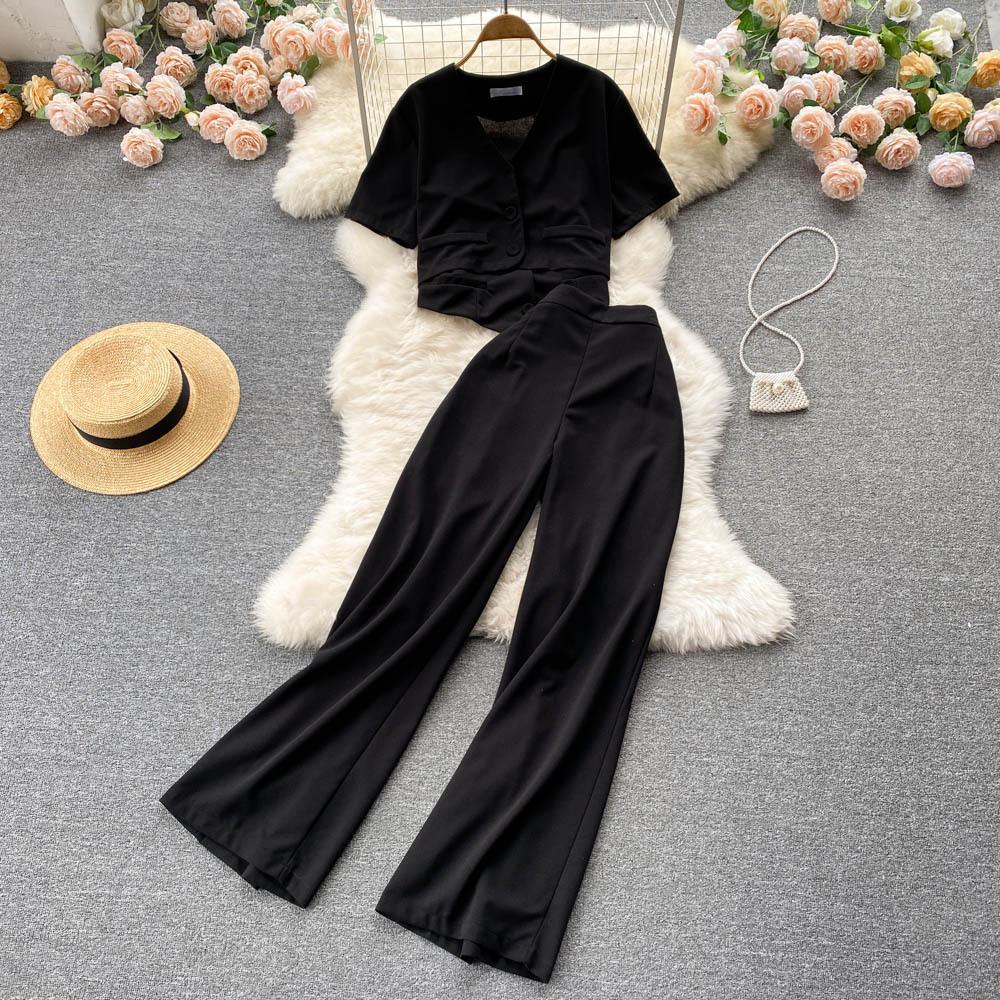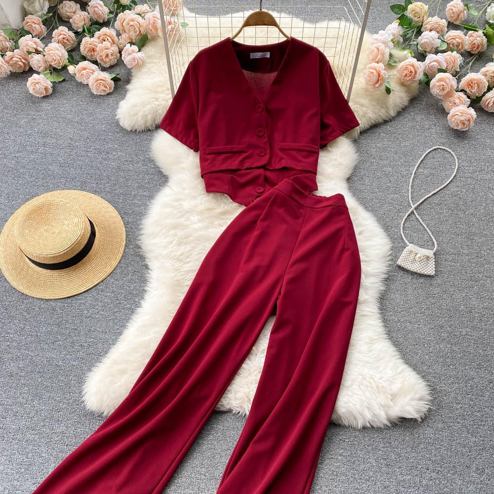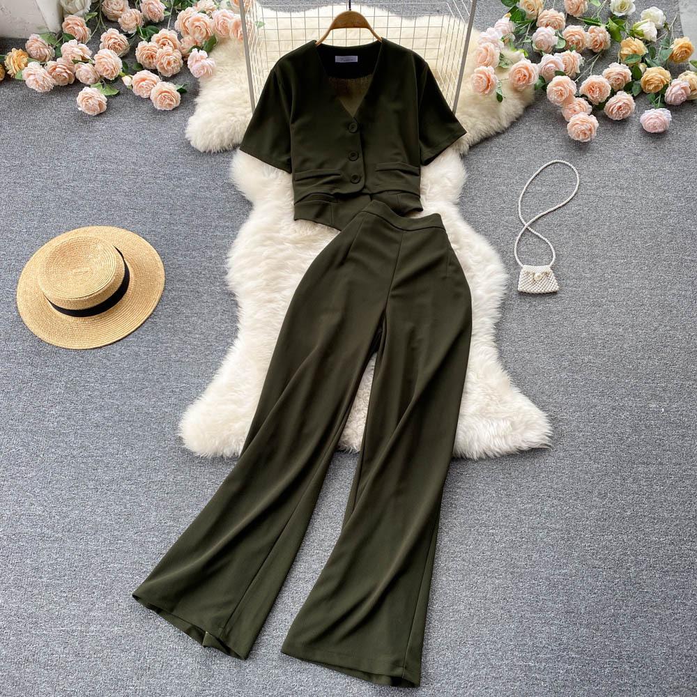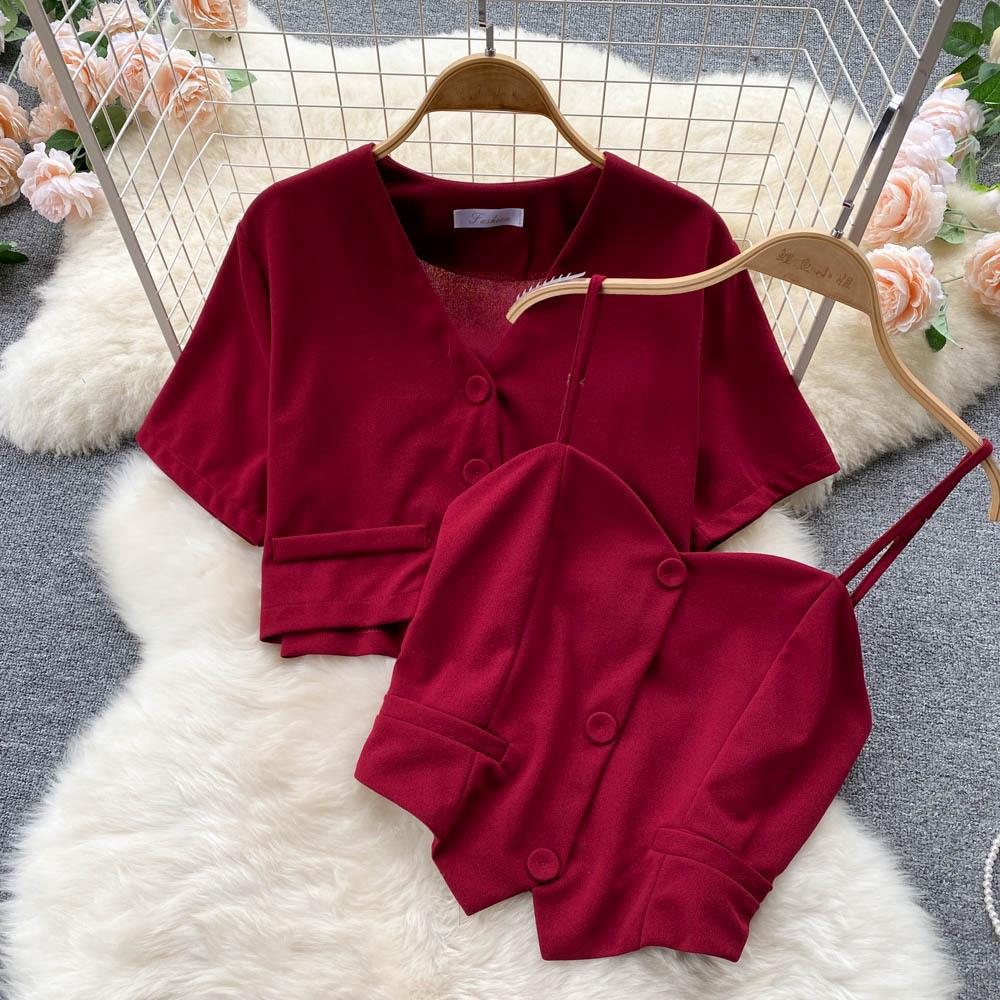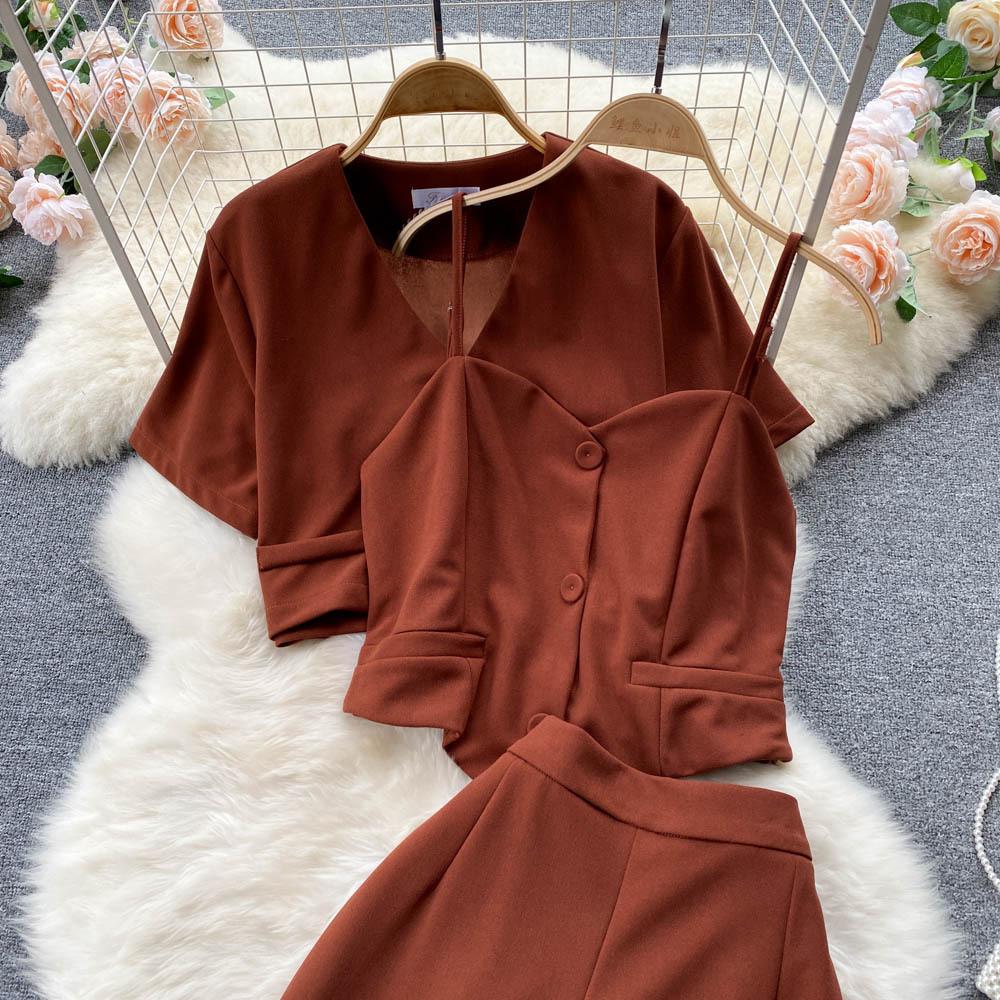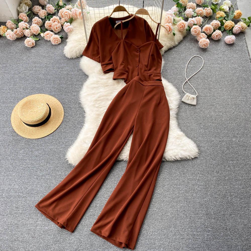 Traje de moda coreana para mujer, camisola de verano, camisa corta con cuello en V, abrigo, pantalones de pierna ancha de cintura alta, conjunto de tres piezas