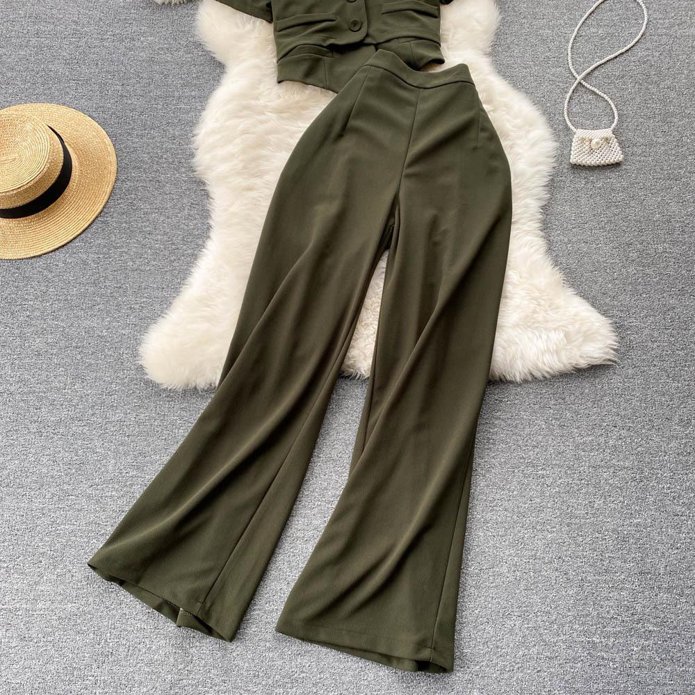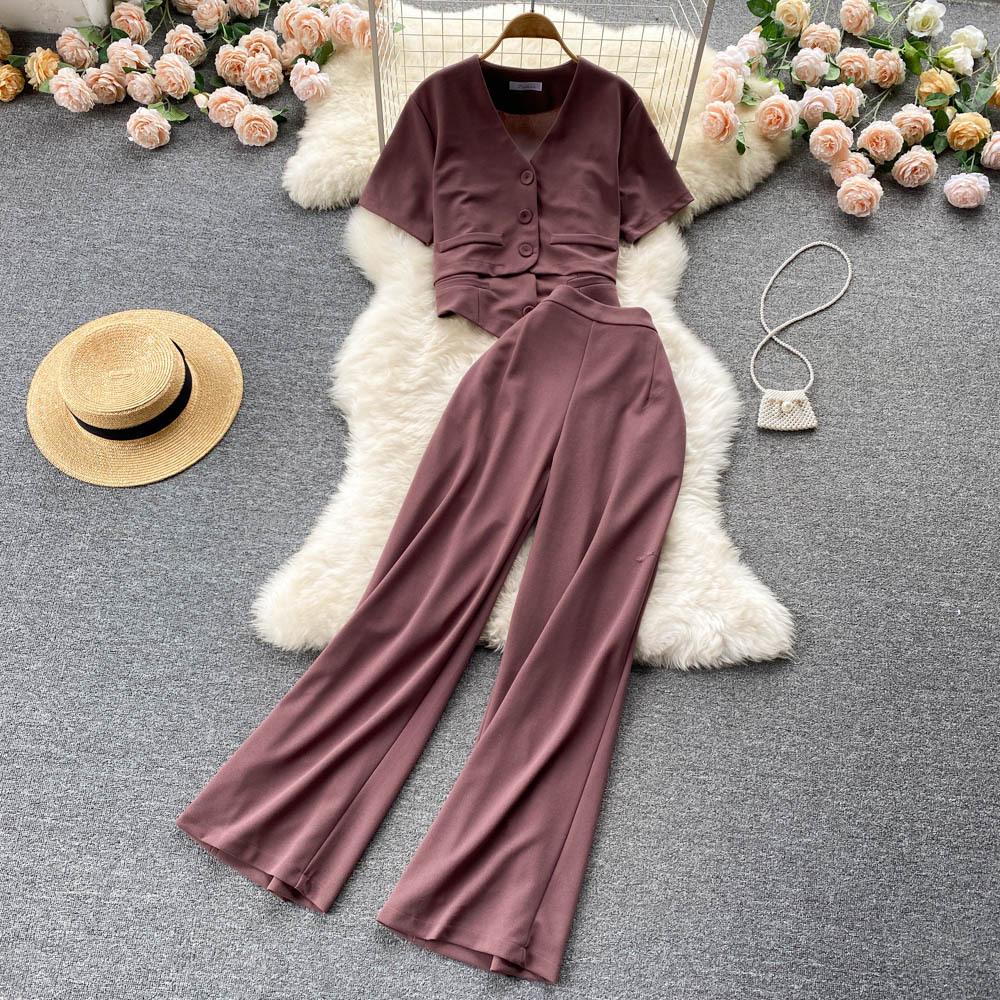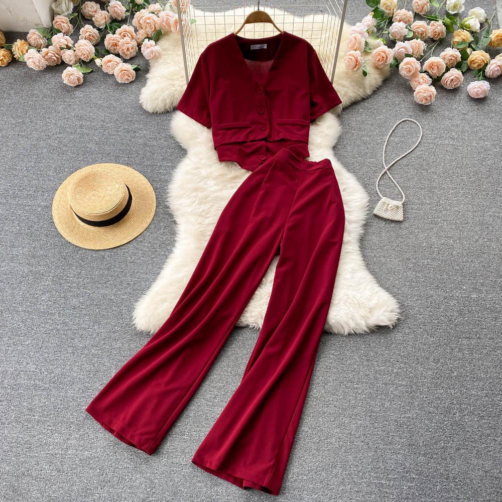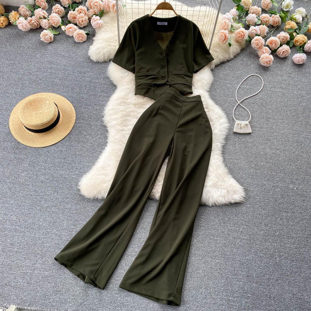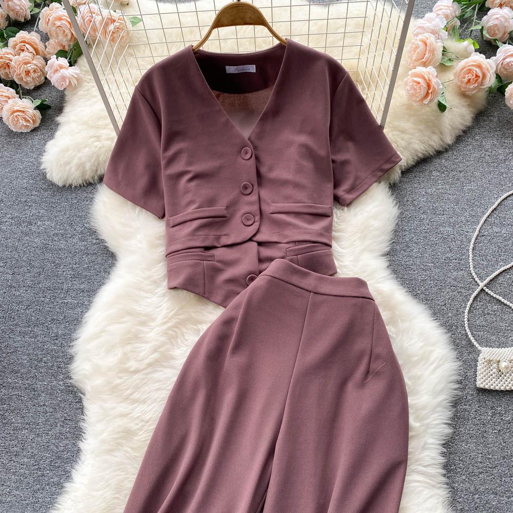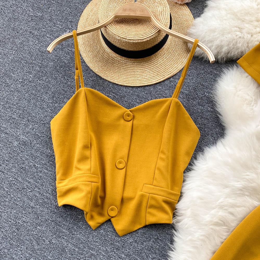 Traje de moda coreana para mujer, camisola de verano, camisa corta con cuello en V, abrigo, pantalones de pierna ancha de cintura alta, conjunto de tres piezas
