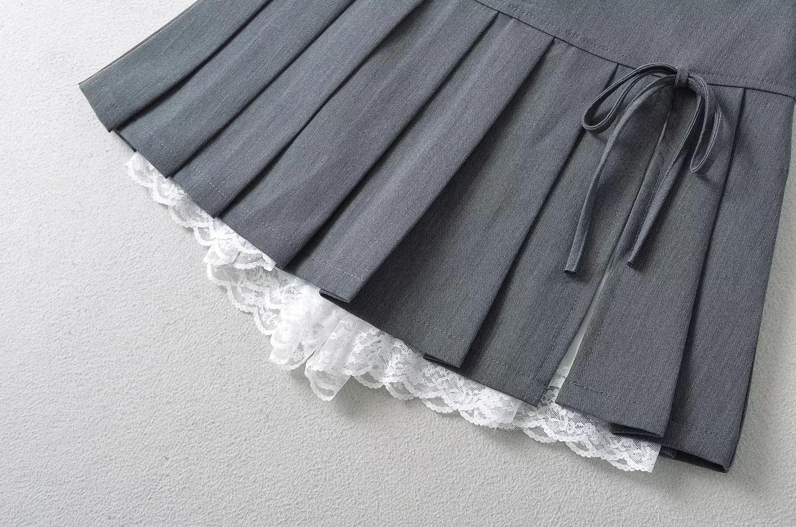 Falda de Encaje con Lazo Estilo Universitario para Mujer Verano Cintura Alta Adelgazante Anti-transparente Plisada Línea A
