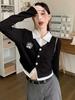 Suéter de punto preppy de dos piezas falsas para mujer, otoño e invierno, corto, negro con costuras, corte slim, cuello polo, top tipo cárdigan americano