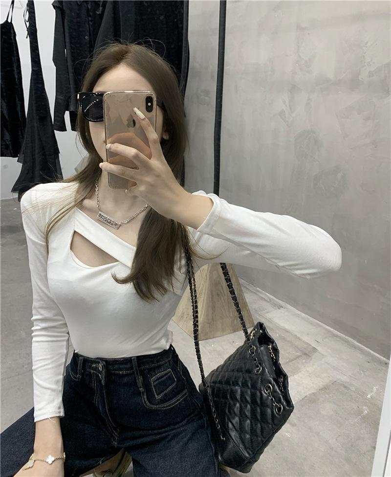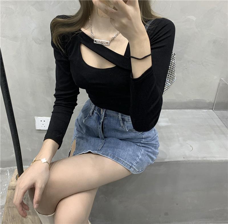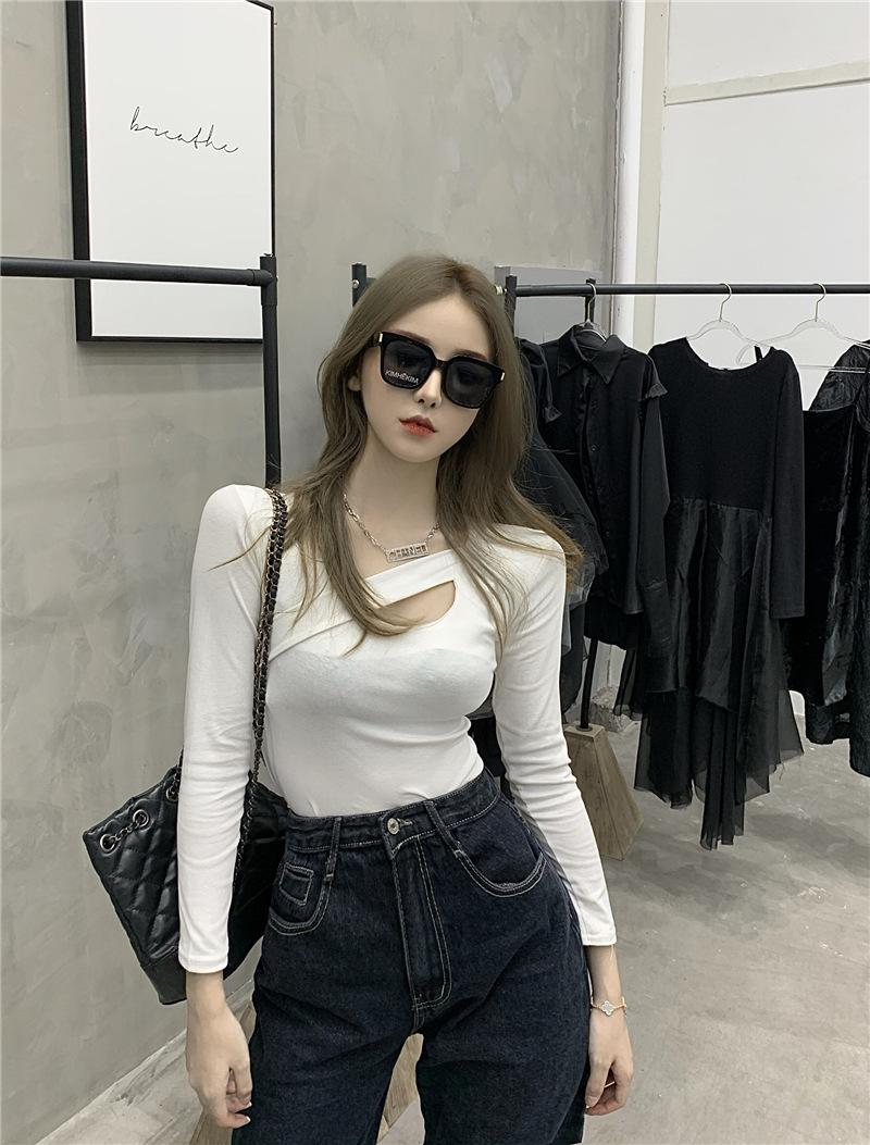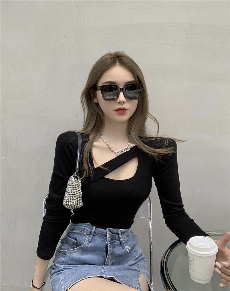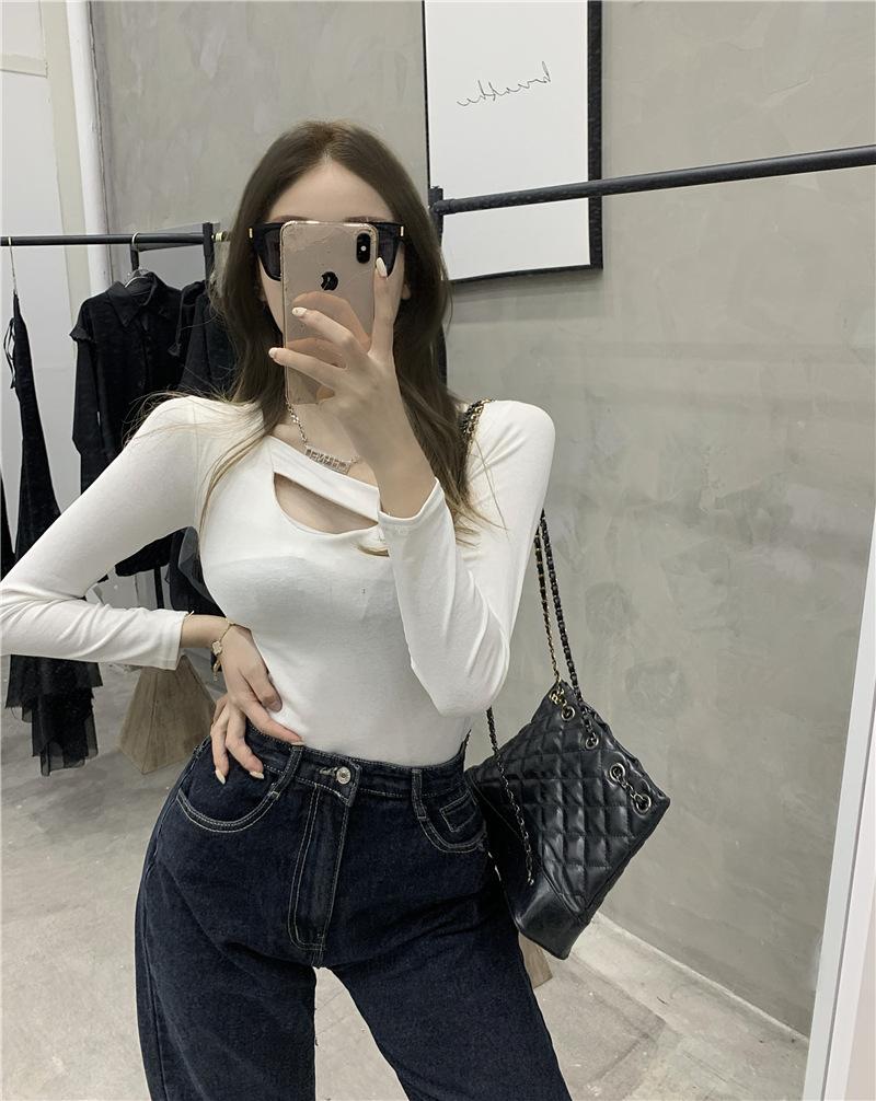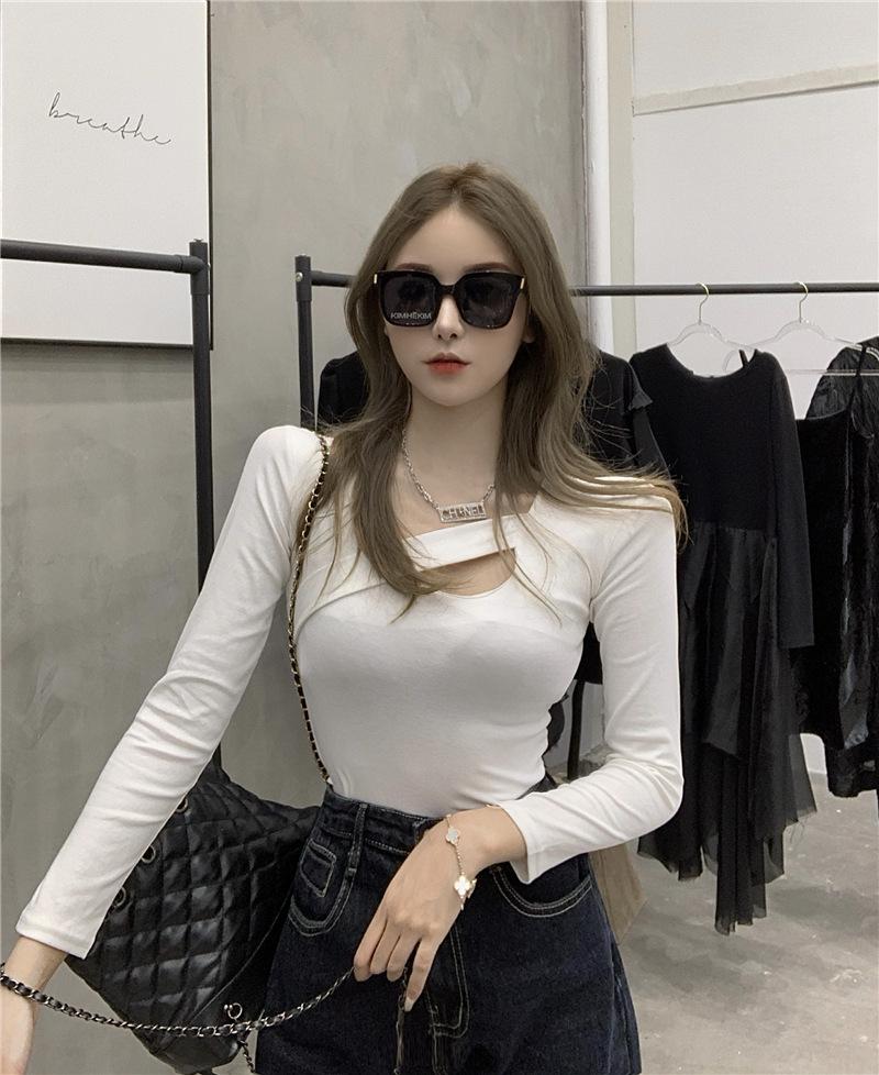 2025 Otoño Nuevo Diseño Sentido Camiseta Calada Color Sólido Versátil Ajuste Slim Manga Larga Top para Mujer Trendy