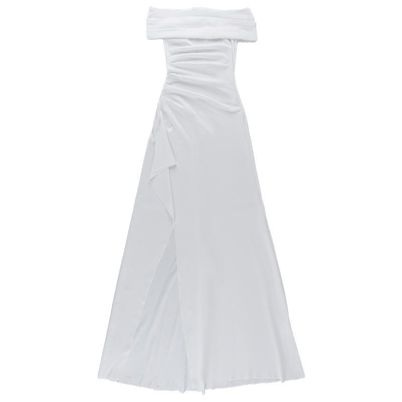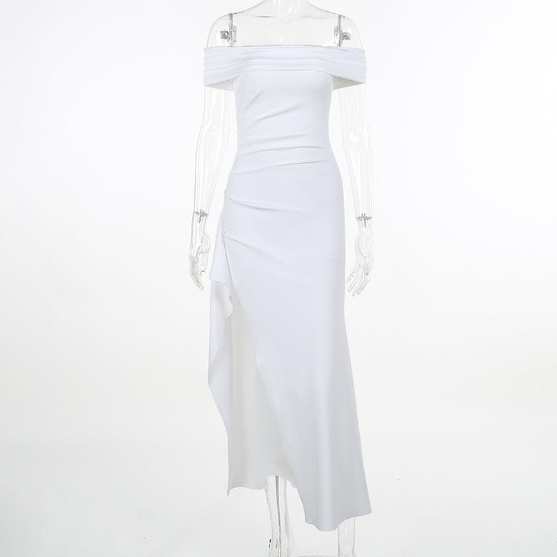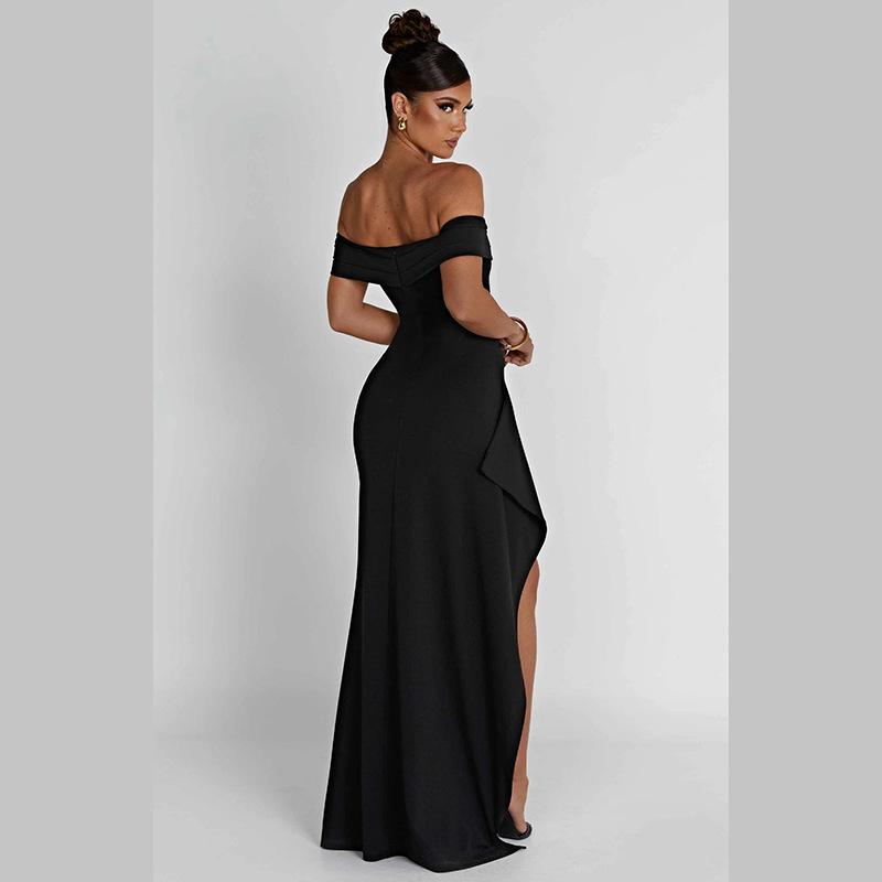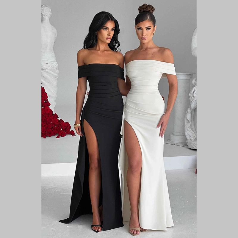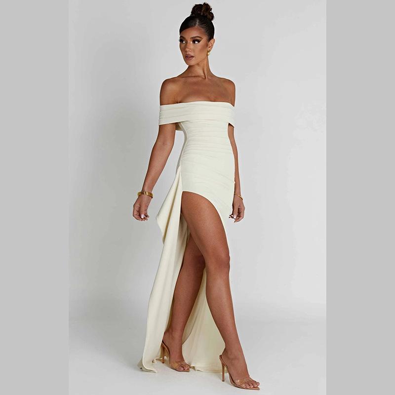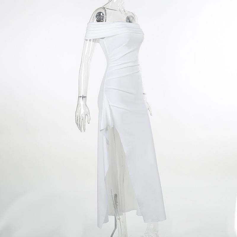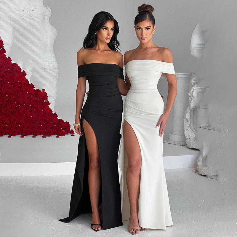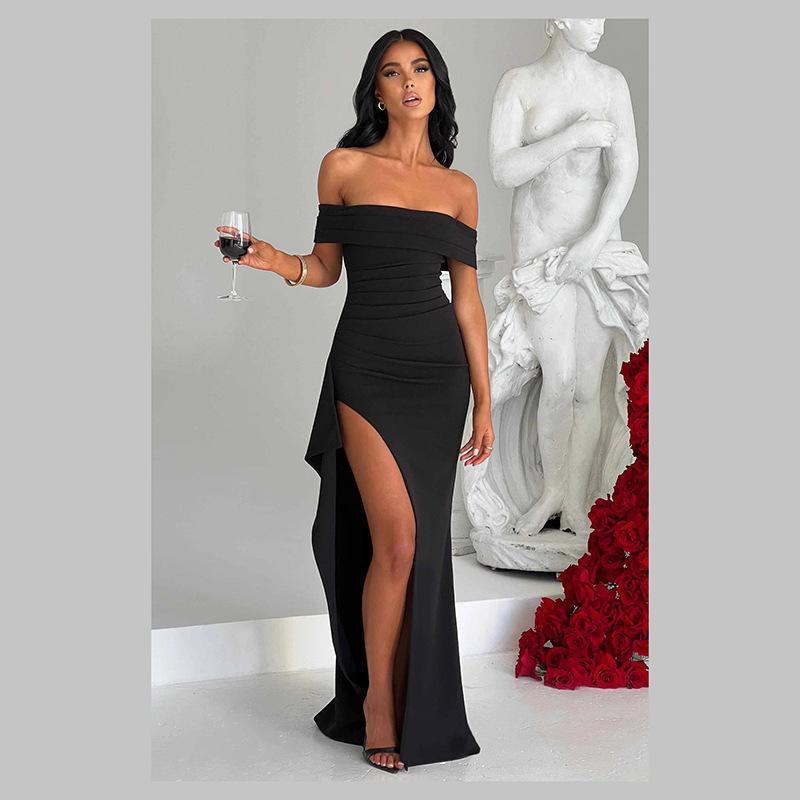 JY23452 Vestido sexy con hombros descubiertos y abertura, vestido elegante y ajustado de verano, vestido largo para mujer