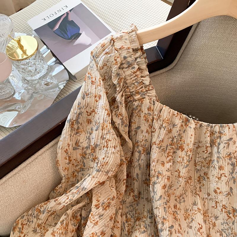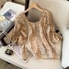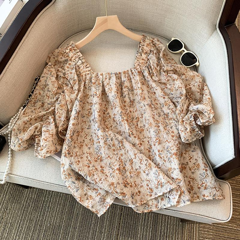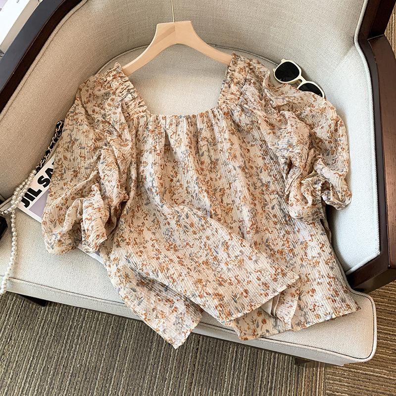 Foto real de la nueva blusa dulce de verano 2023 estilo francés que reduce la edad, retro, de cuello cuadrado y manga abullonada