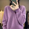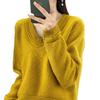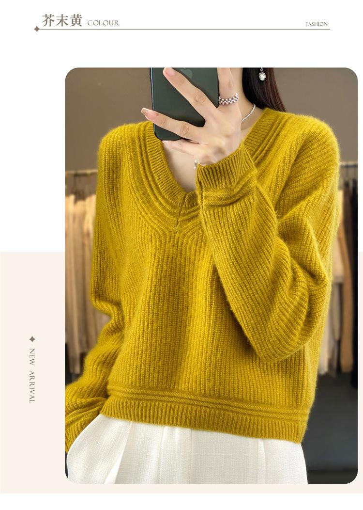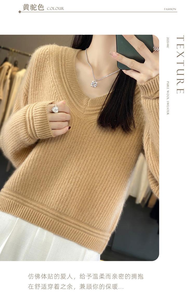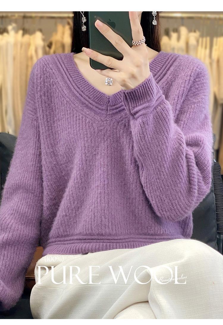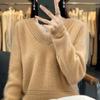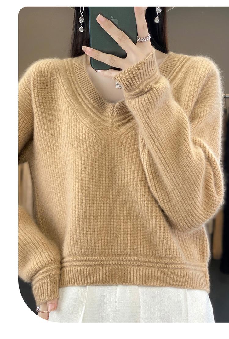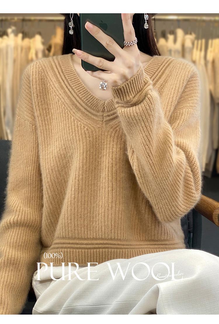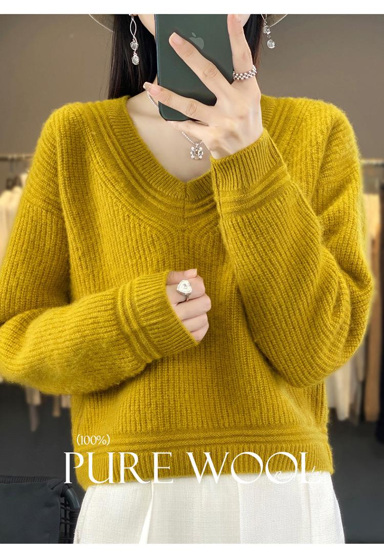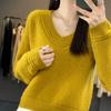 Suéter corto elegante con cuello en V y aguja de lingote de color sólido simple de estilo coreano, suéter informal holgado de lana completa para otoño e invierno para mujer