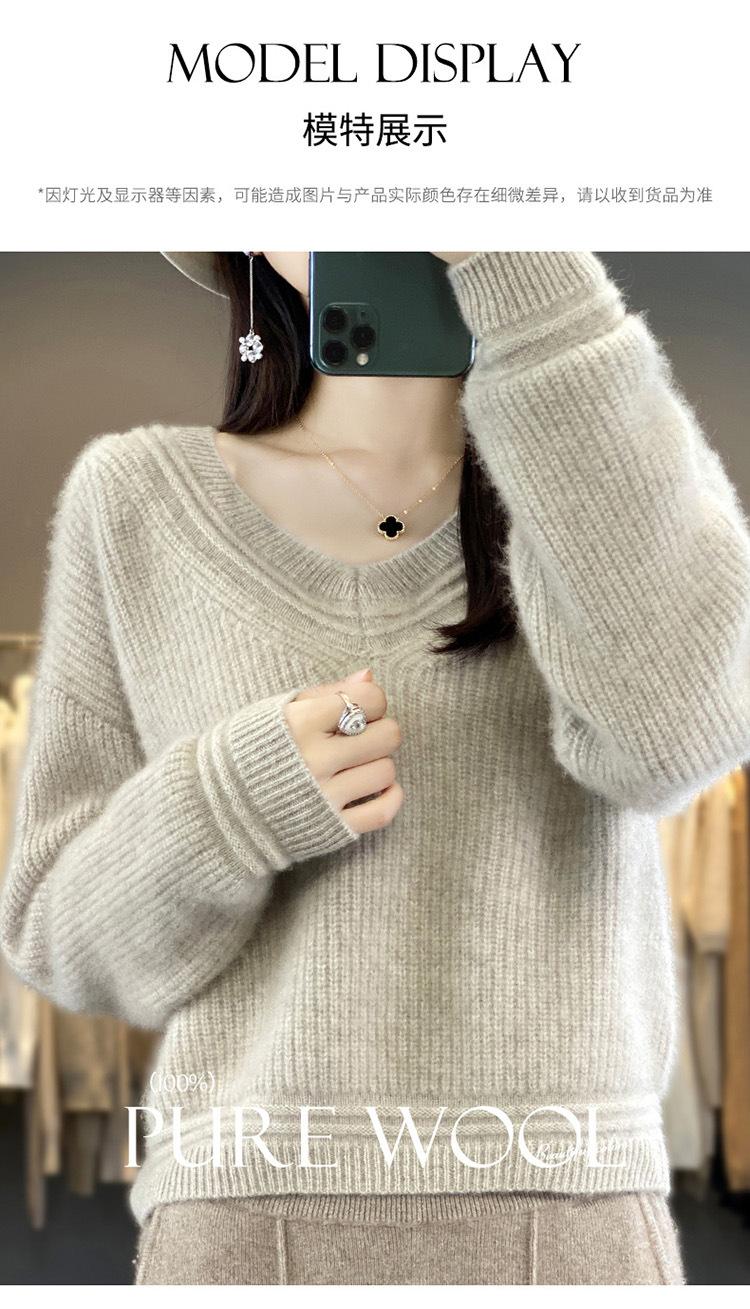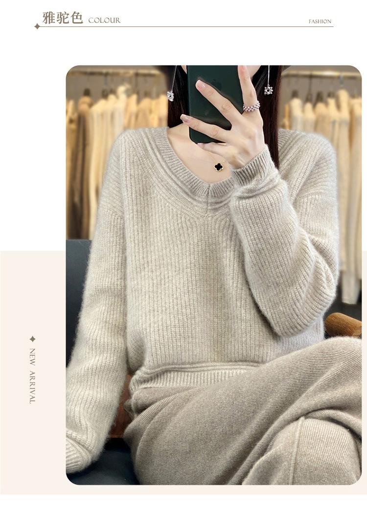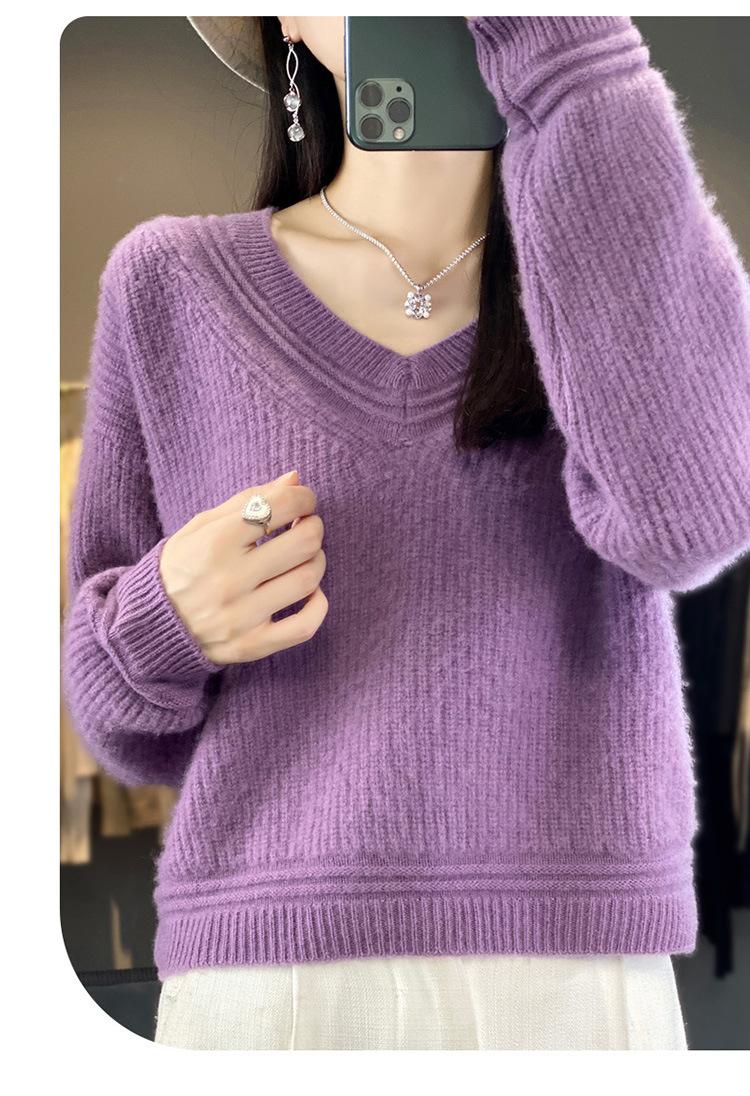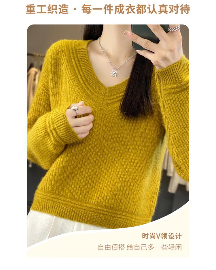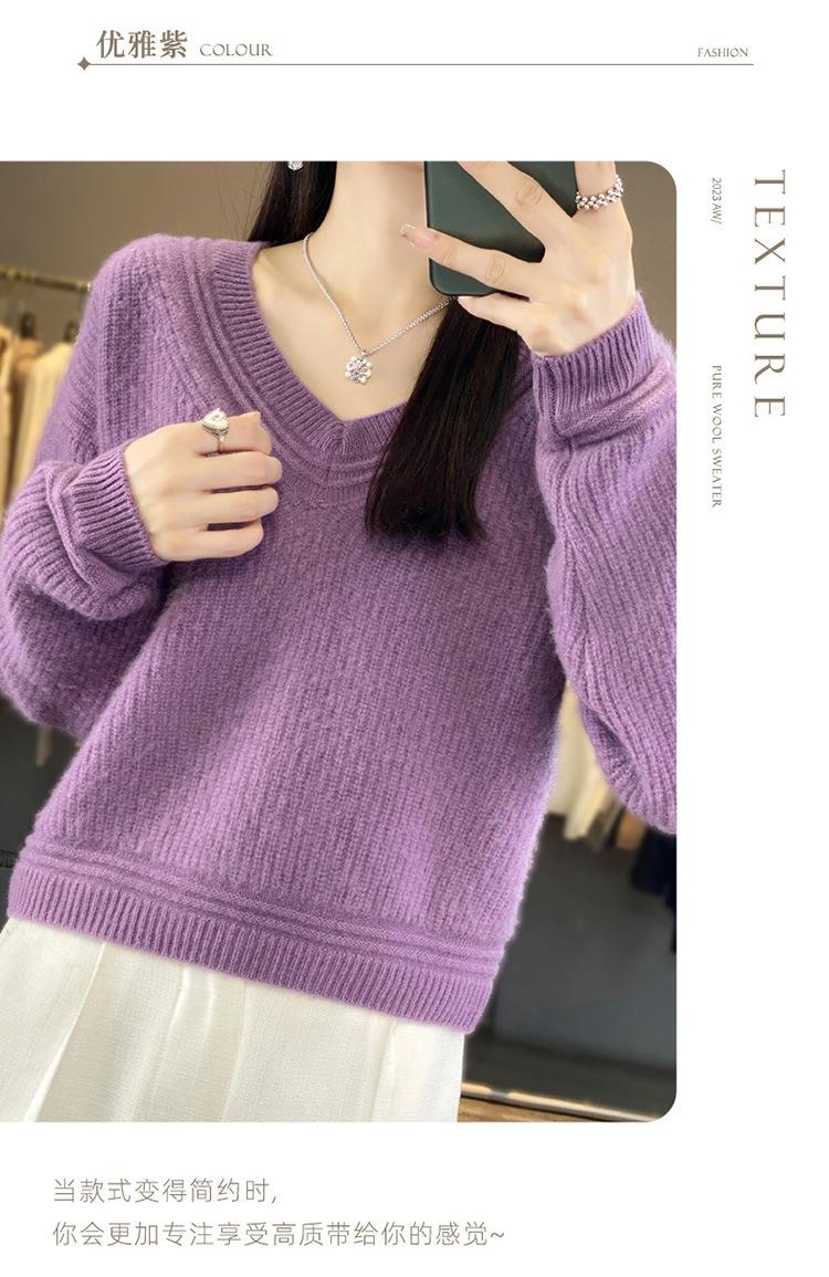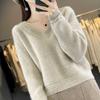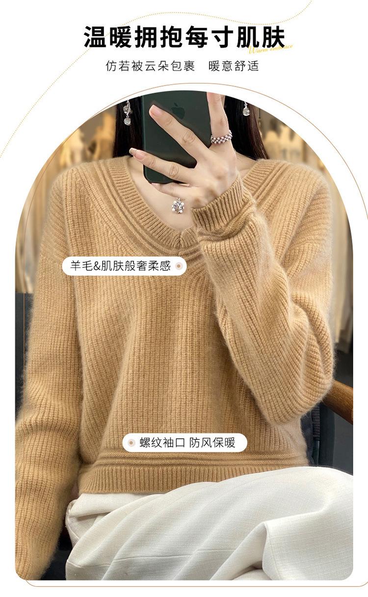 Suéter corto elegante con cuello en V y aguja de lingote de color sólido simple de estilo coreano, suéter informal holgado de lana completa para otoño e invierno para mujer