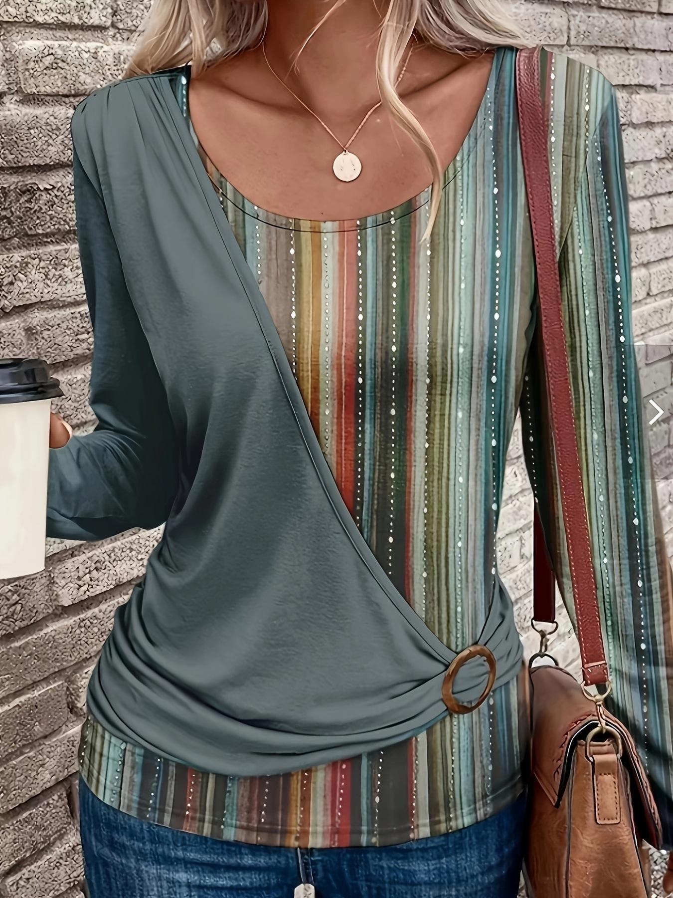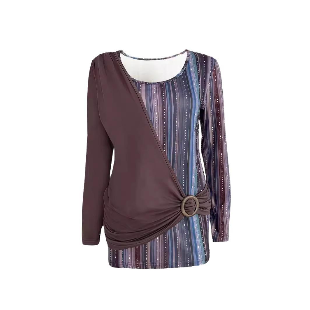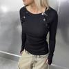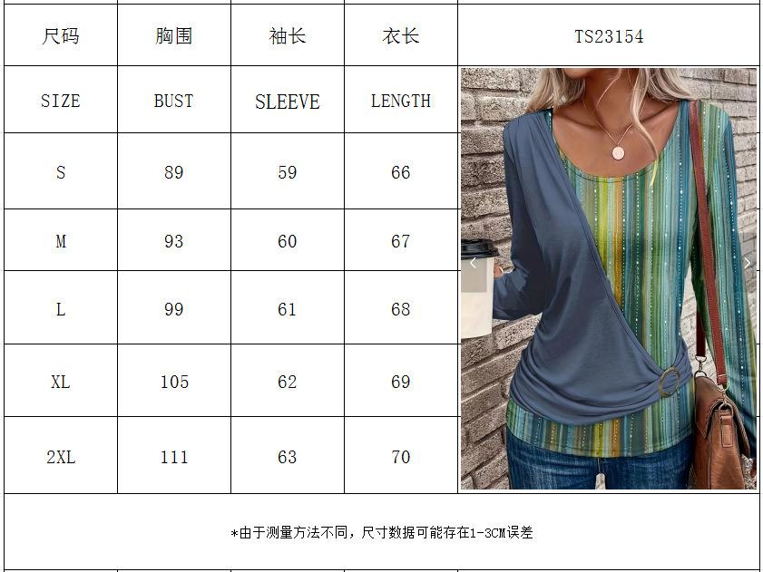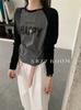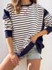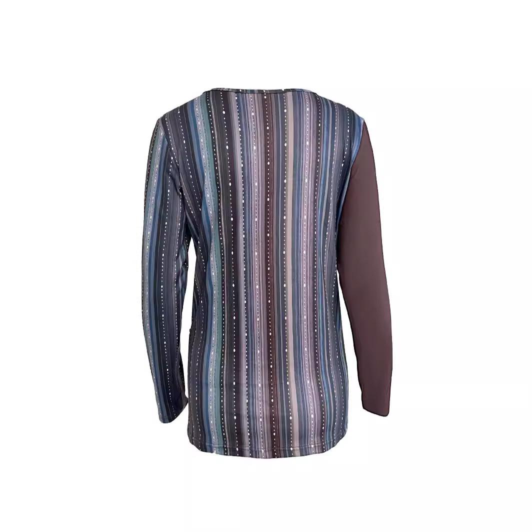 Camiseta holgada informal de manga larga con cuello redondo y estampado de costuras de color liso para mujer europea y americana de primavera y otoño de 2024