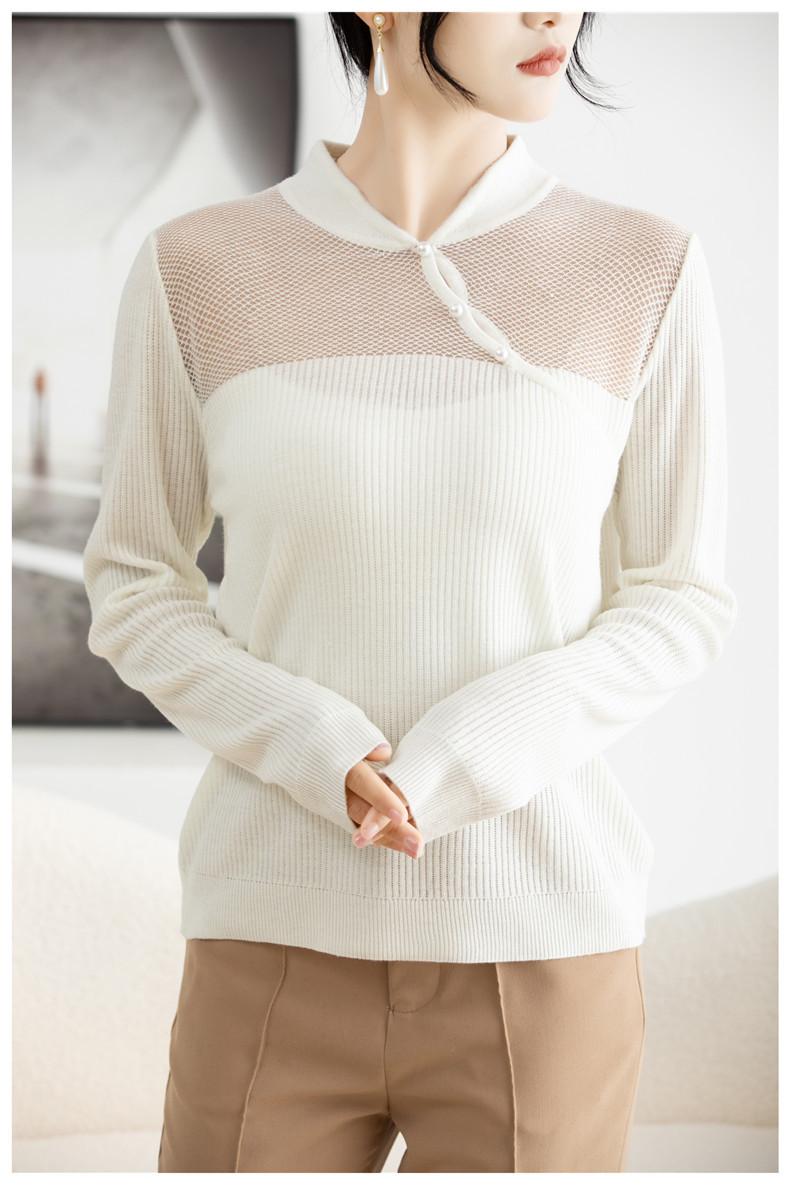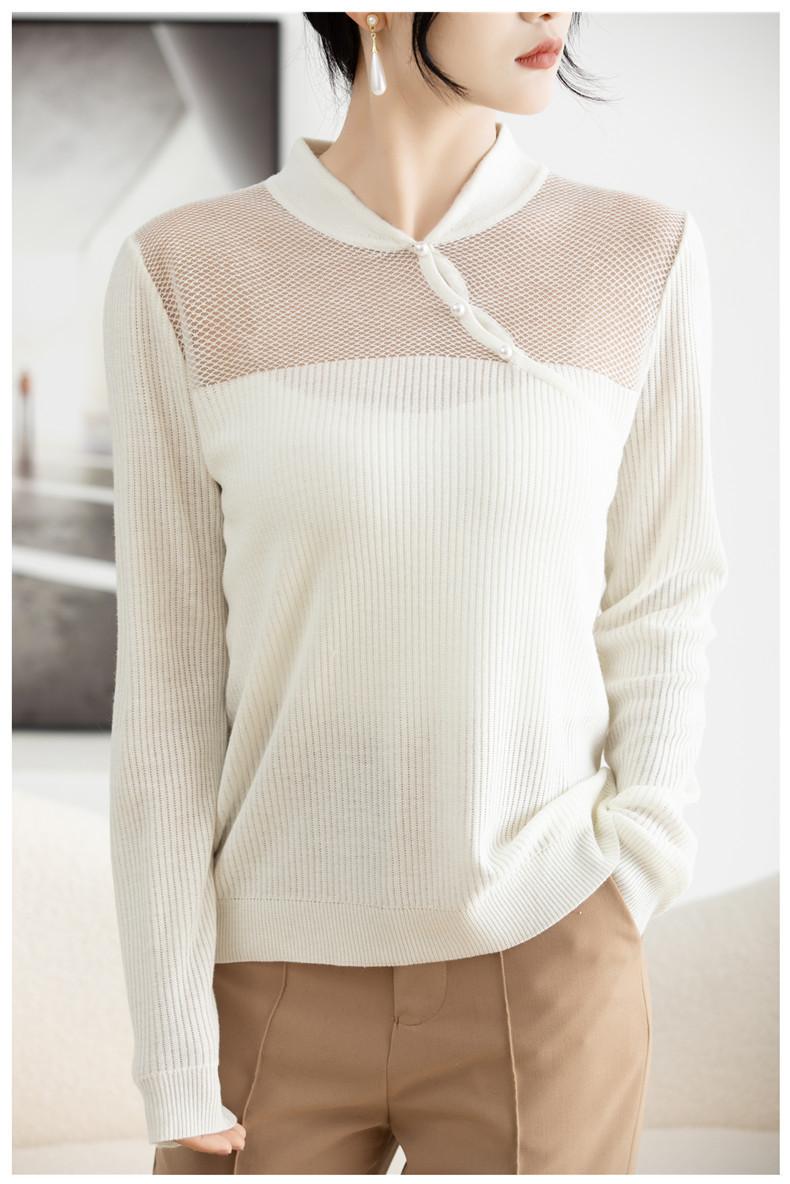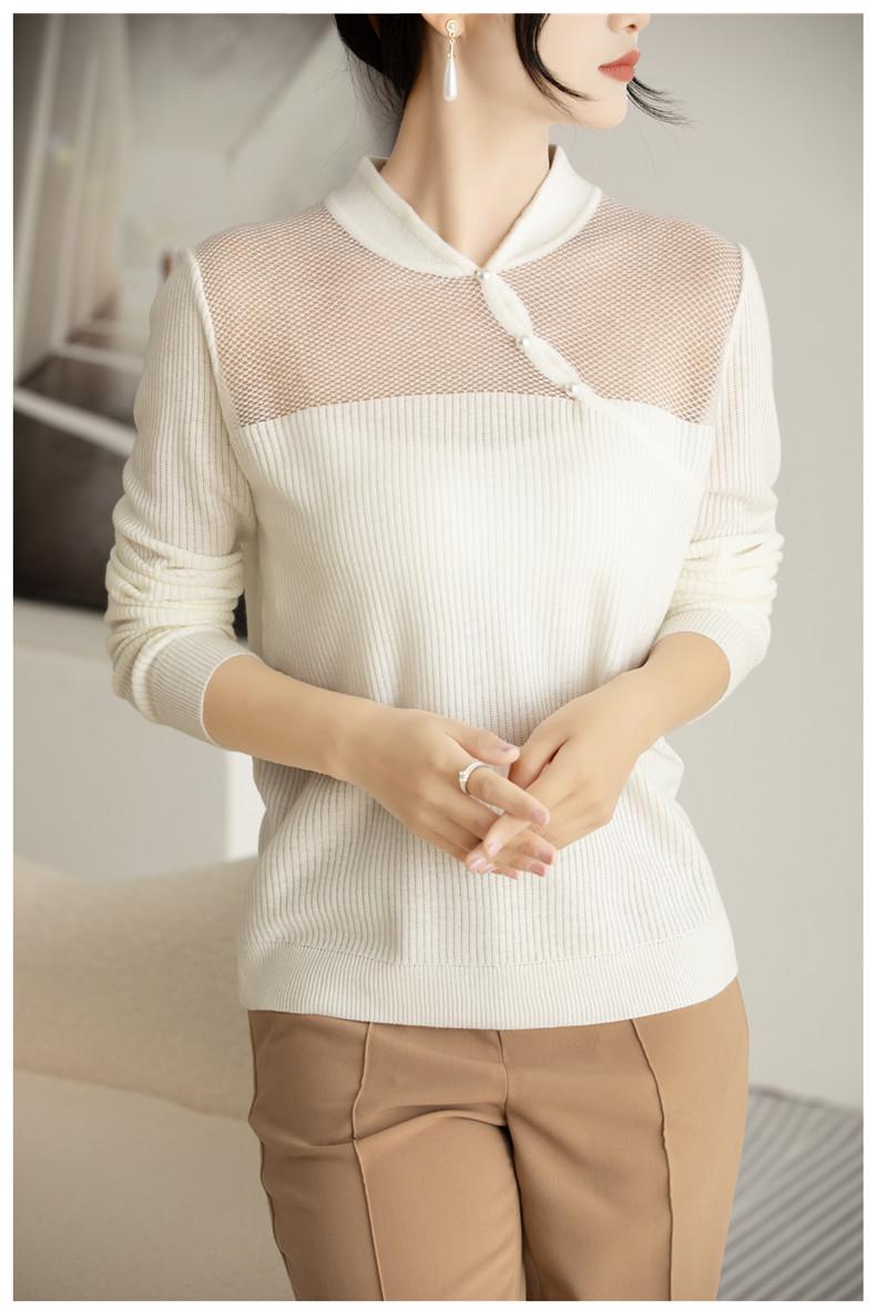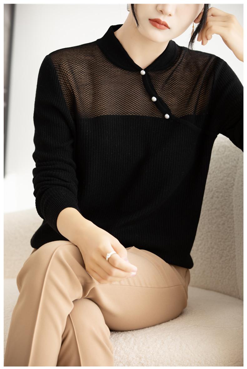 Suéter de Punto con Botones Estilo Chino para Mujer, Delgado Modelo Nuevo de Otoño, Suéter Camisa Base de Lana Organza Calado para Mujer