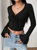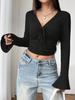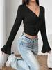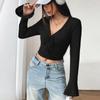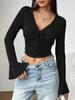 Camiseta de manga corta con cuello en V y mangas abullonadas para mujer, estilo europeo y americano, elegante, de color liso, para verano