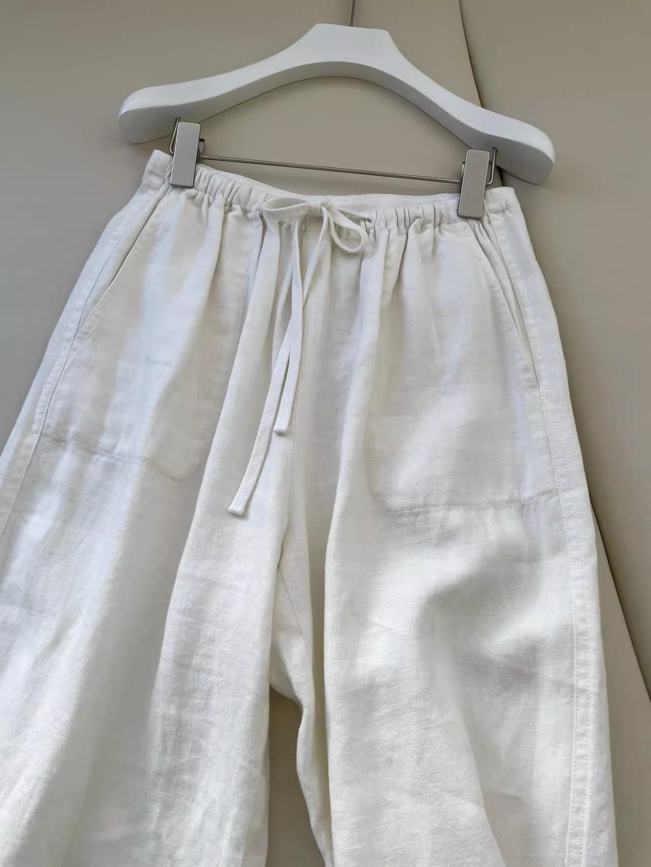 Pantalones Blancos de Algodón y Lino para Mujer Verano Delgados Estilo Japonés Holgazán Dosis Casuales Pantalones Rectos Lino Pantalones de Pierna Ancha