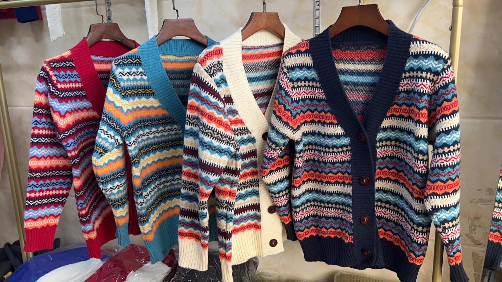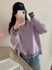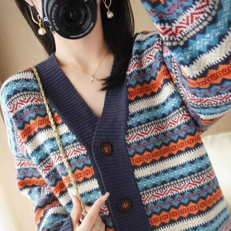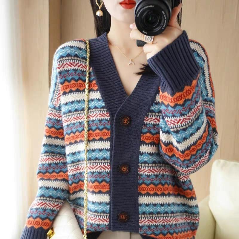 Suéter de Otoño e Invierno Estilo Coreano para Mujer, Moderno, Cuello en V, Holgado, a Rayas, Combinable con Todo, Cárdigan de Punto Casual con Contraste para Mujer