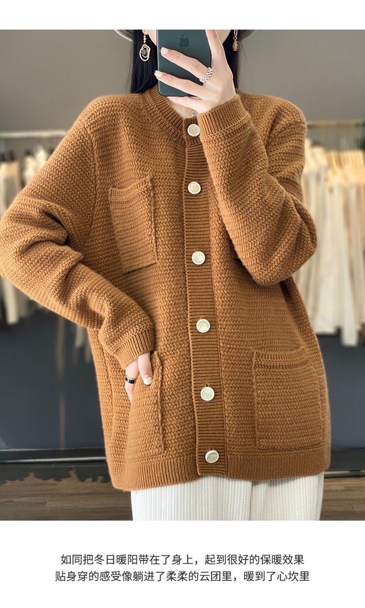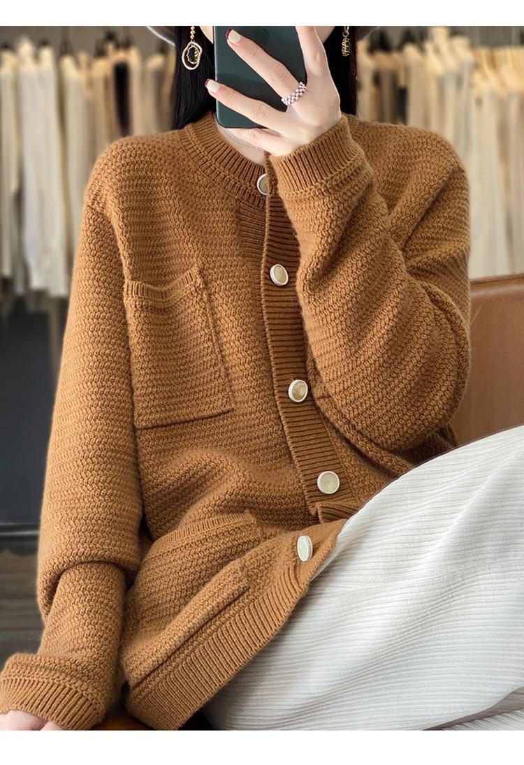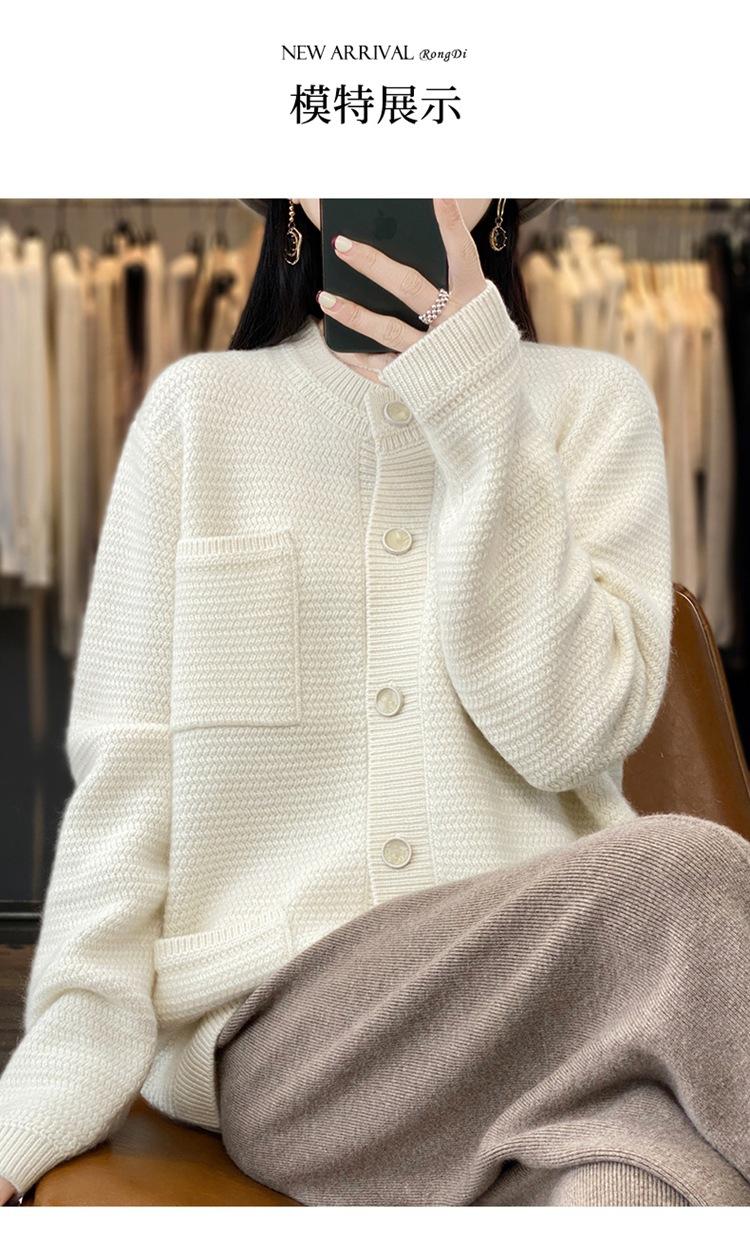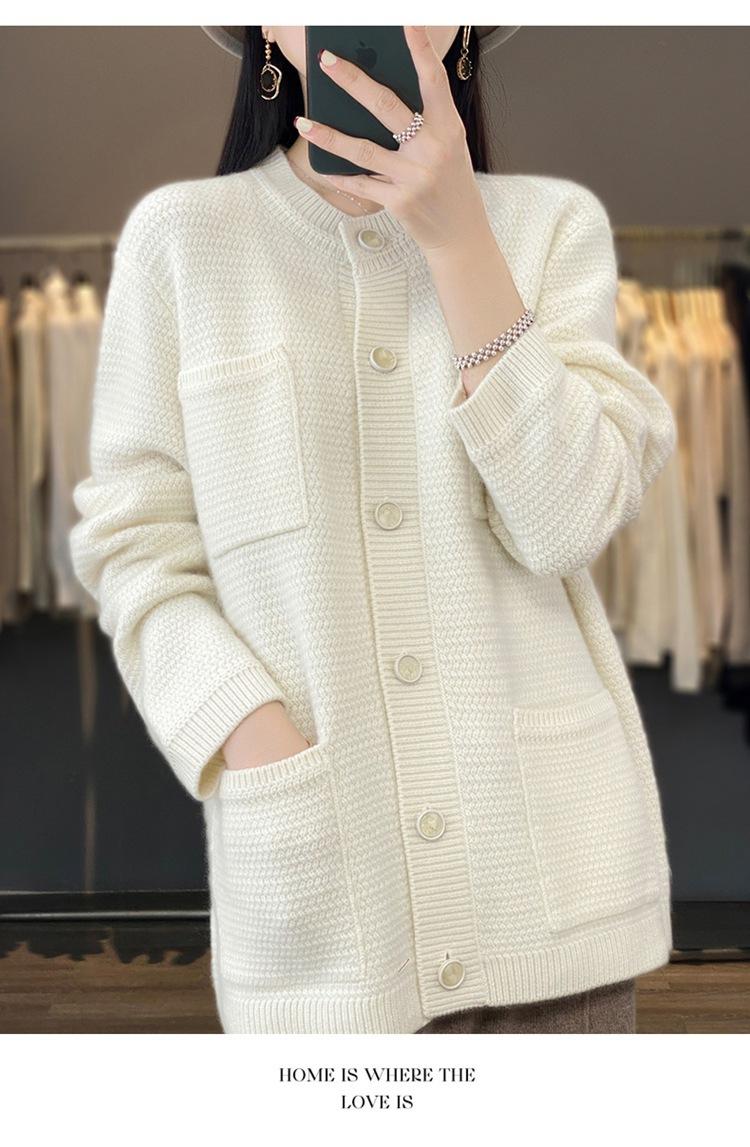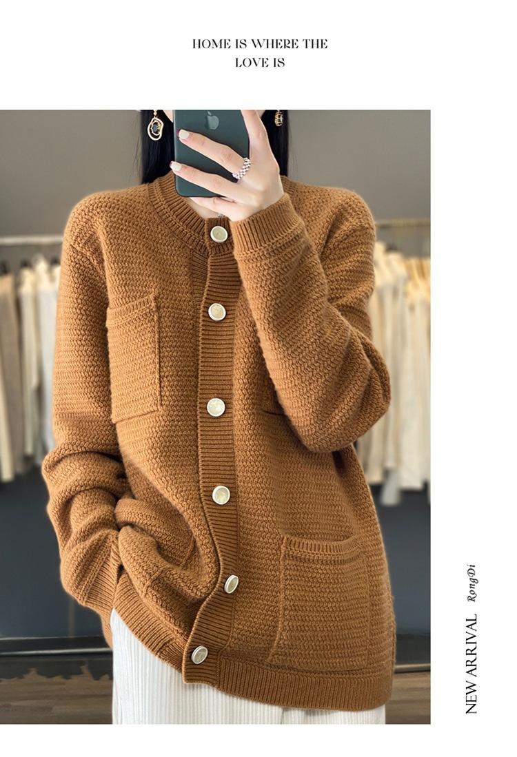 Otoño e invierno nuevo 2023 cárdigan de lana para mujer cuello redondo color sólido suelto con bolsillo abrigo suéter top de punto de cachemira