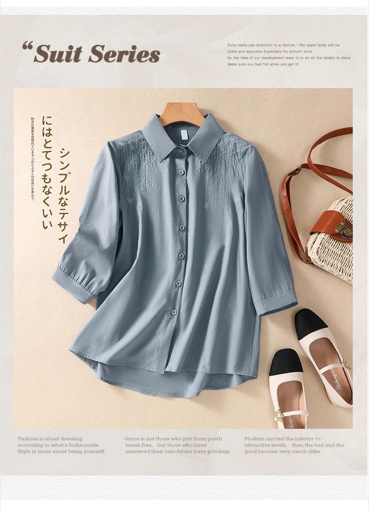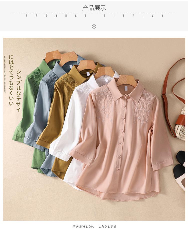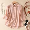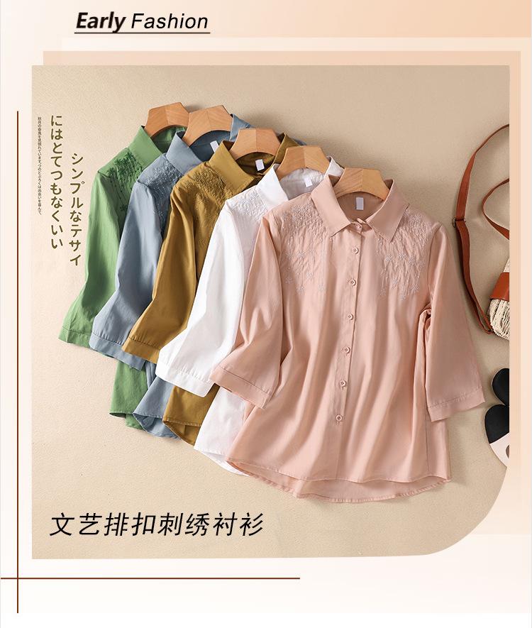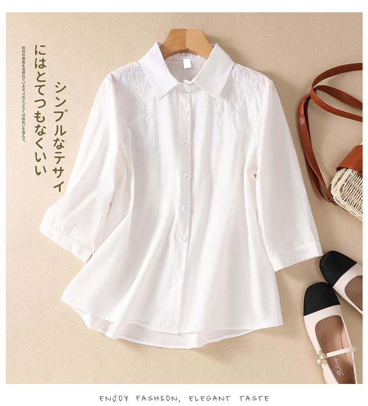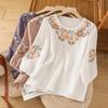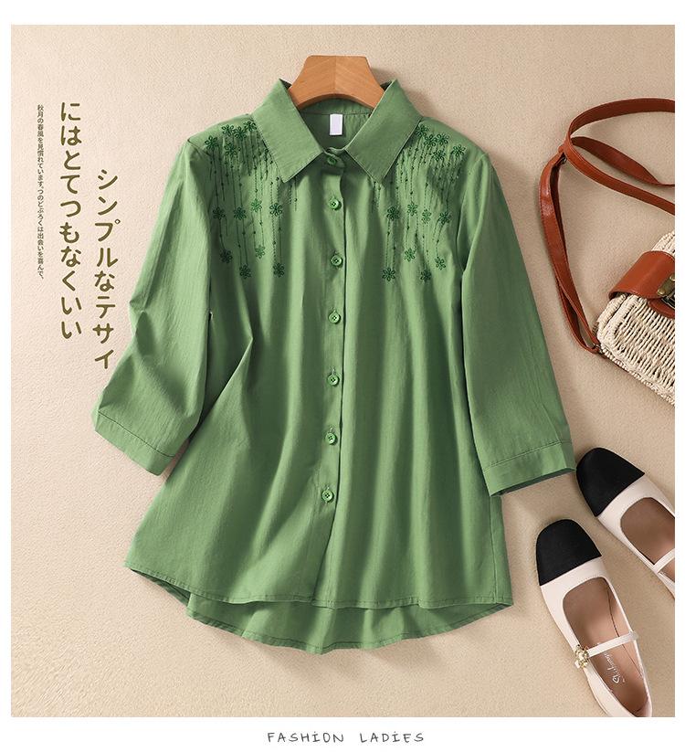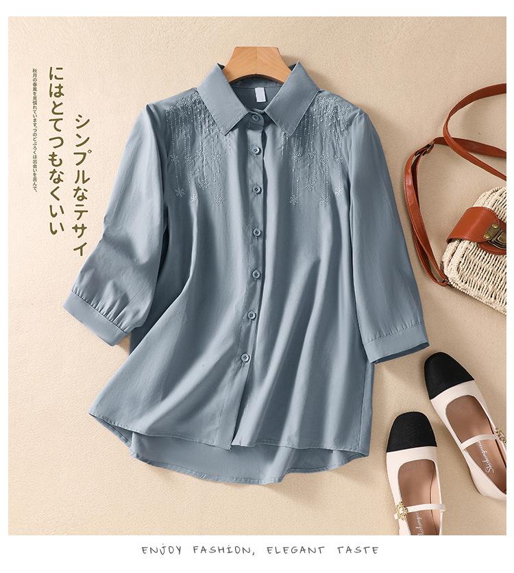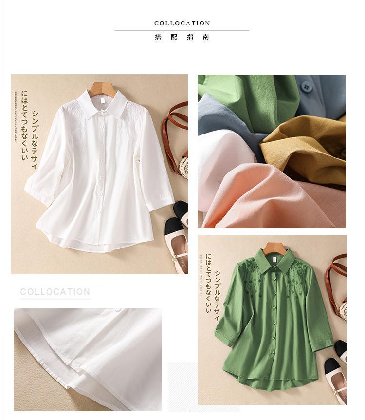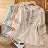 Camisa de Algodón y Lino Suelta Bordada de Tiro Real para Mujer, Literaria Retro Suelta Casual de Manga Tres Cuartos, Verano 2025 Nuevo Estilo
