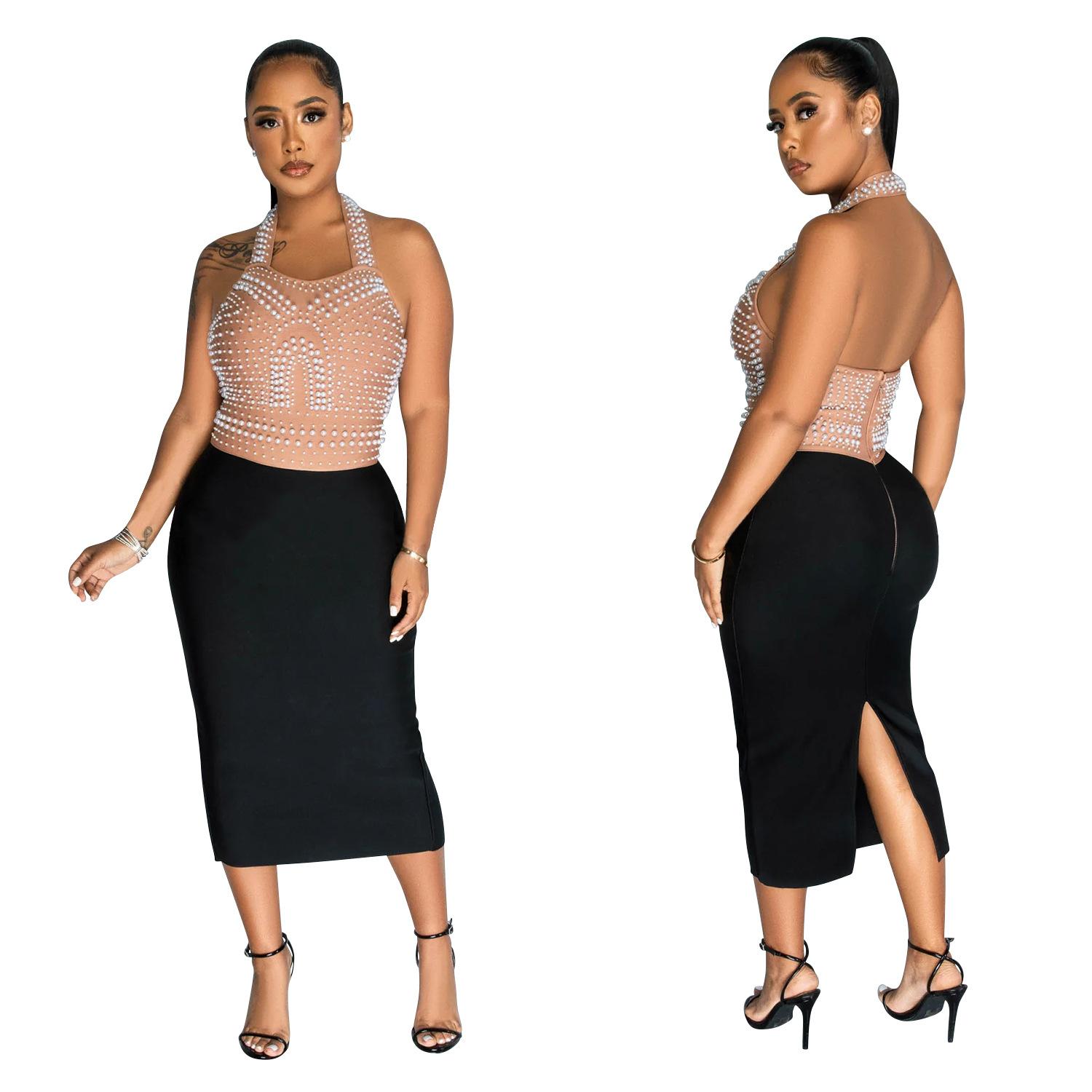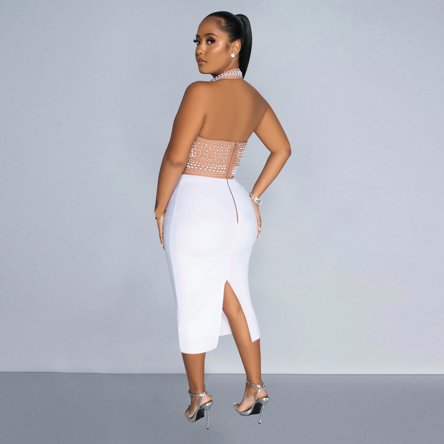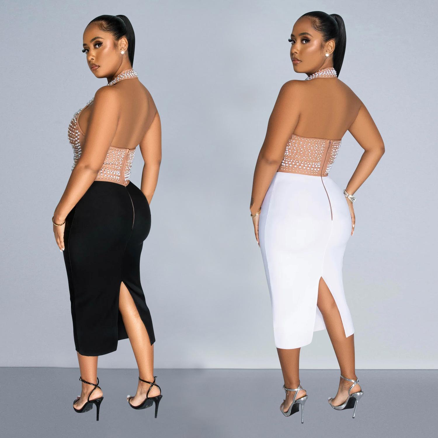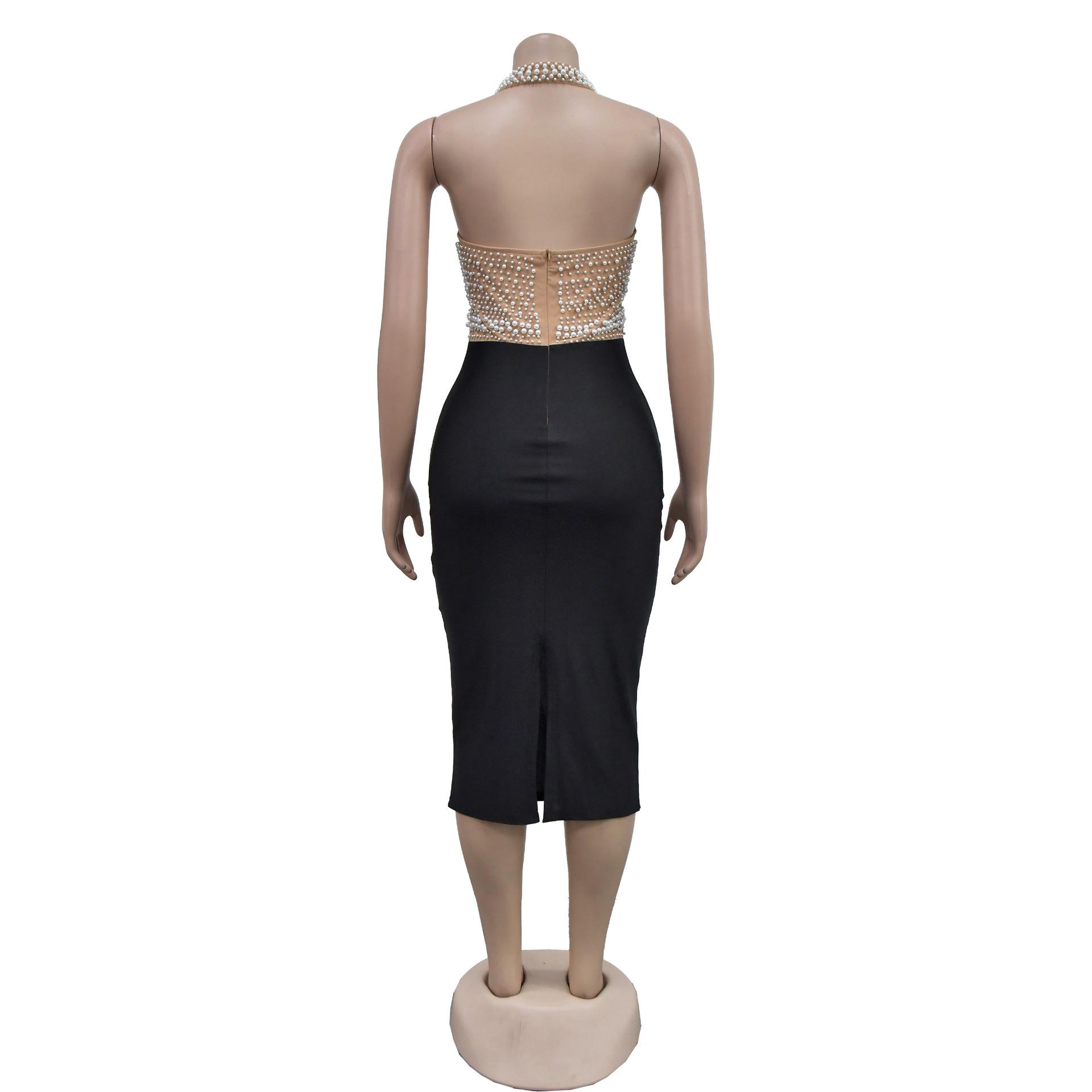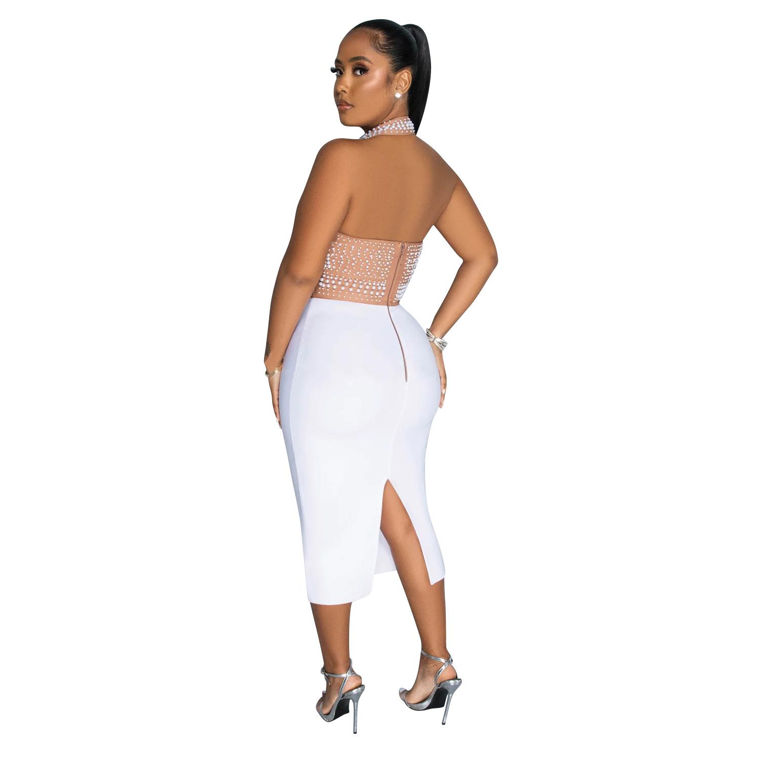 C6873 Transfronterizo Aliexpress Amazon Moda Europea y Americana Vestido de Falda Larga Halter de Malla de Color Sólido con Diamantes Calientes para Mujer