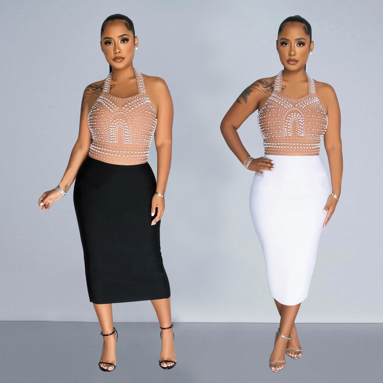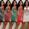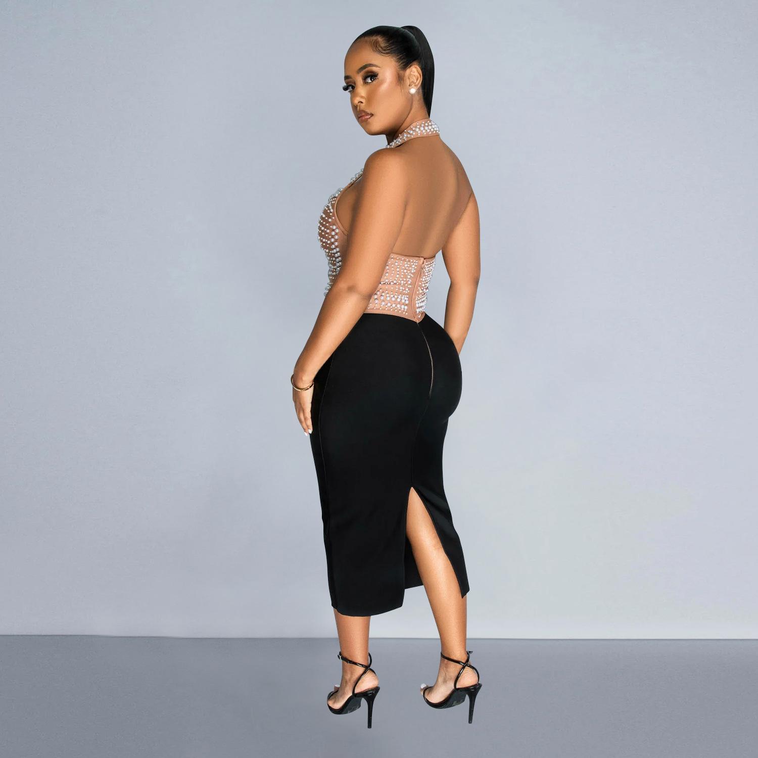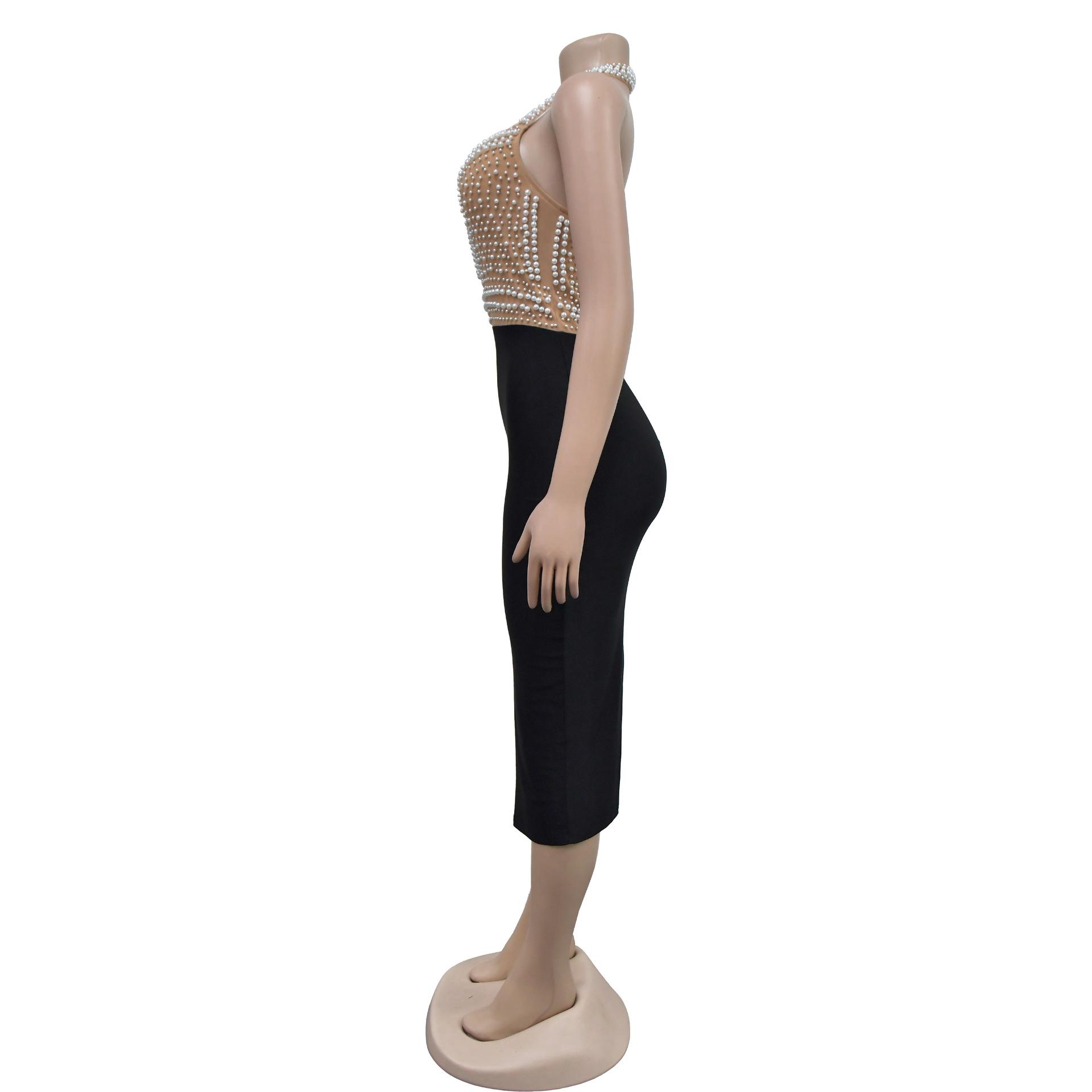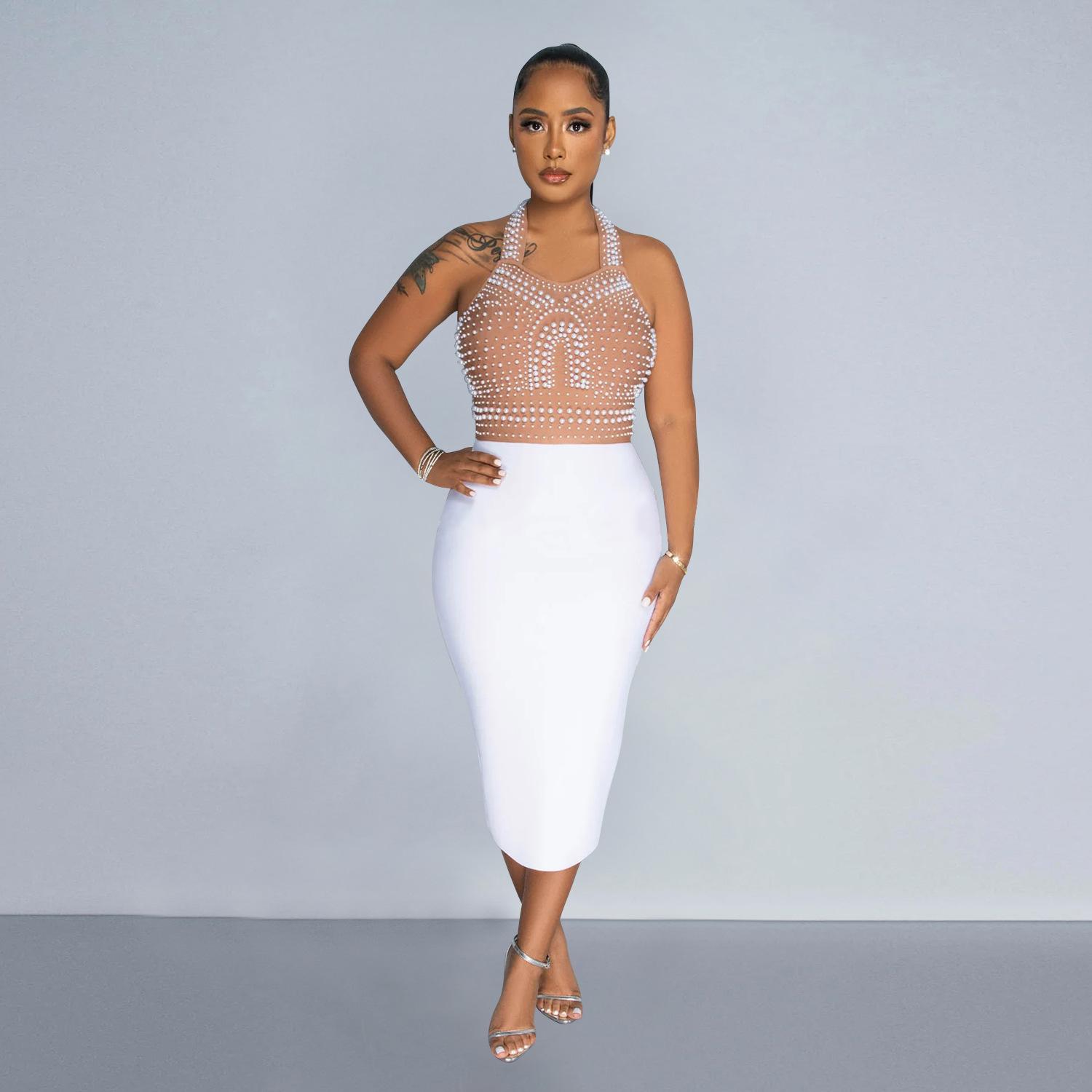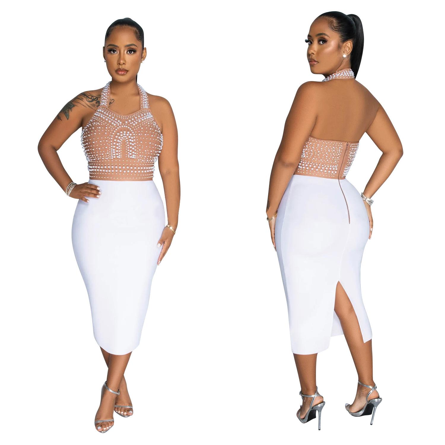 C6873 Transfronterizo Aliexpress Amazon Moda Europea y Americana Vestido de Falda Larga Halter de Malla de Color Sólido con Diamantes Calientes para Mujer