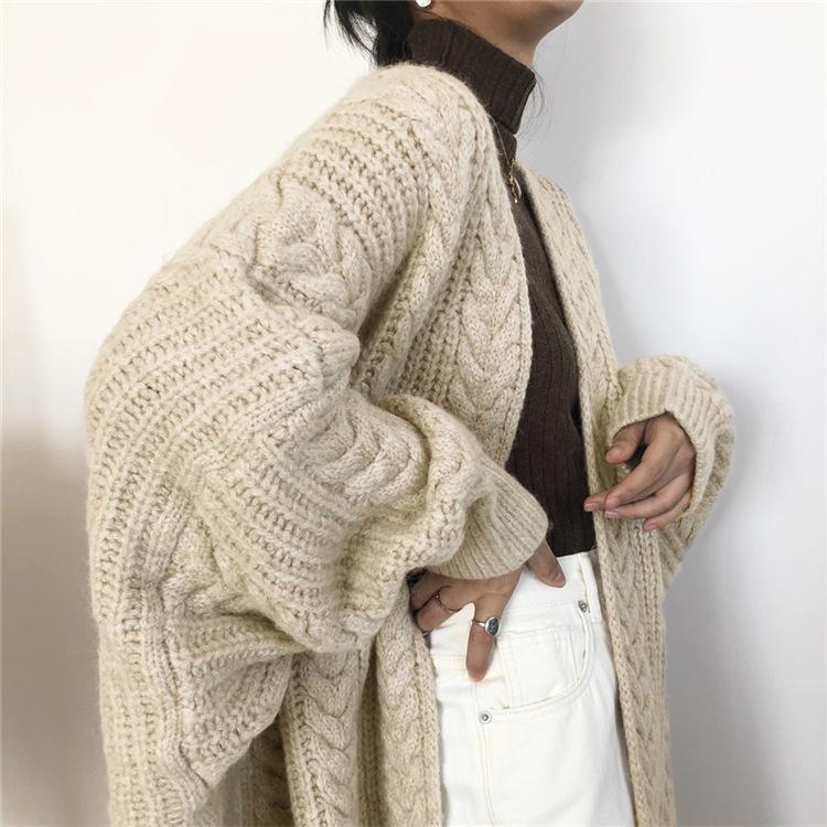 Nuevo atuendo de otoño e invierno: cárdigan de punto de longitud media, moda vintage, suéter holgado y grueso con giro para mujer.