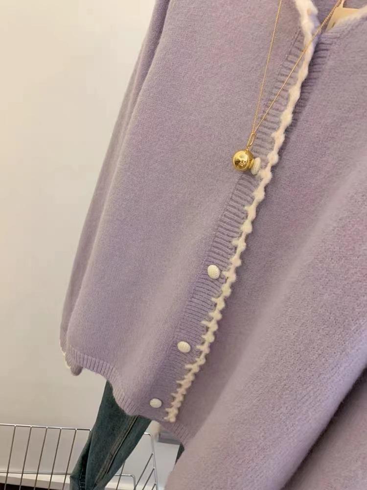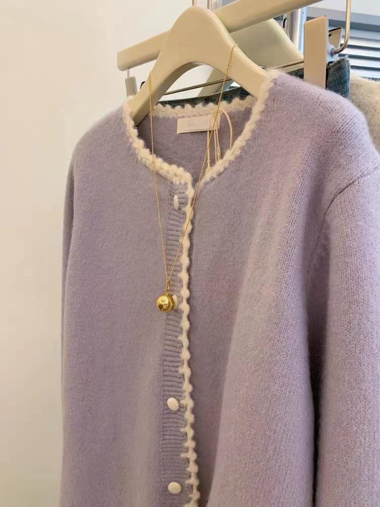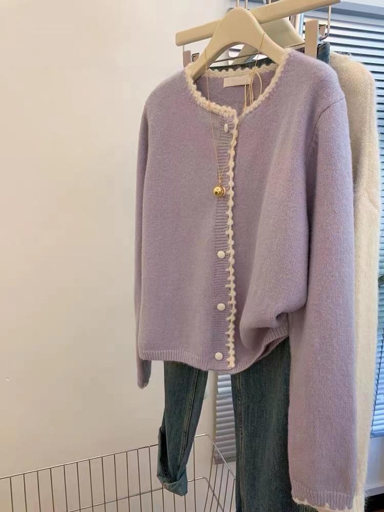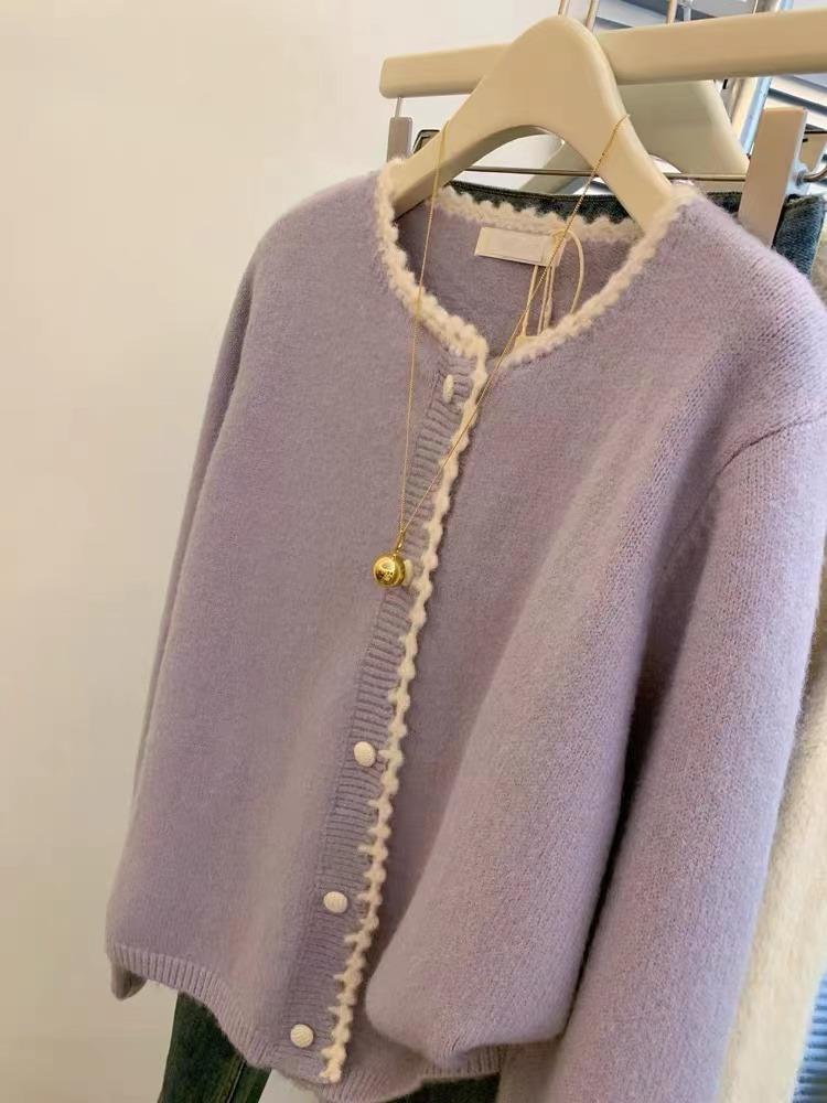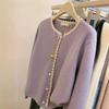 Cárdigan de Punto Estilo Chanel de Primavera 2024 con Cuello Redondo y Encaje Morado para Mujer, Diseño de Abrigo
