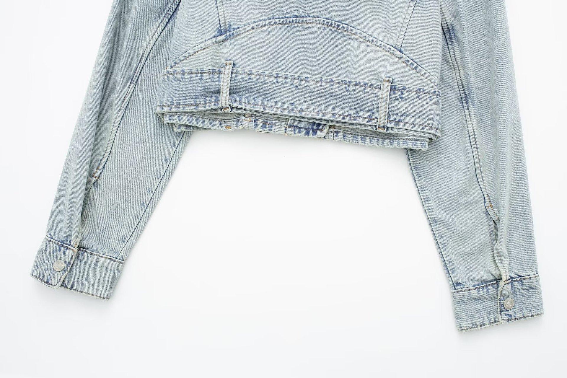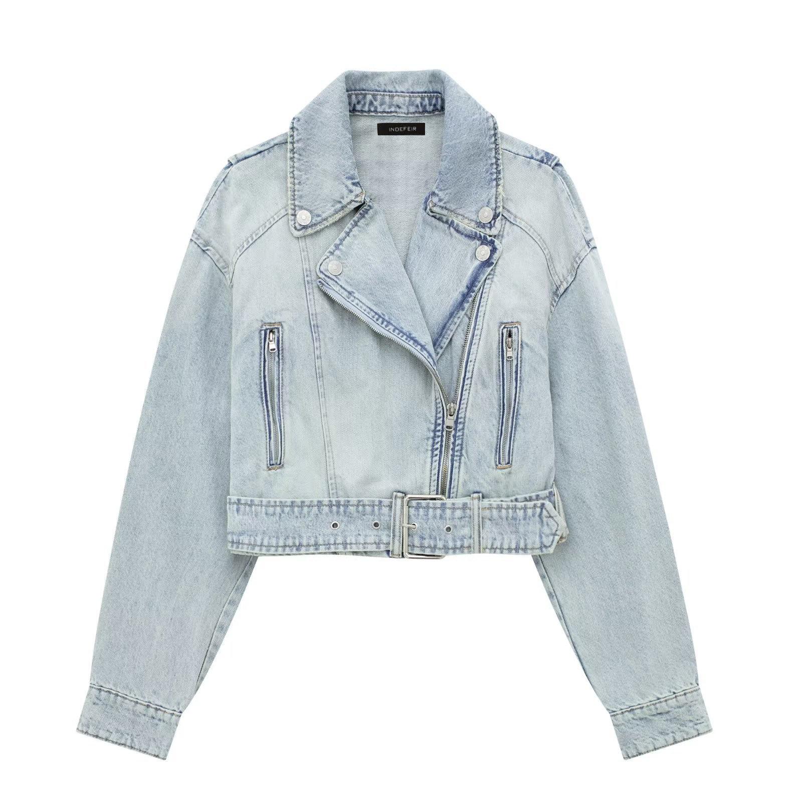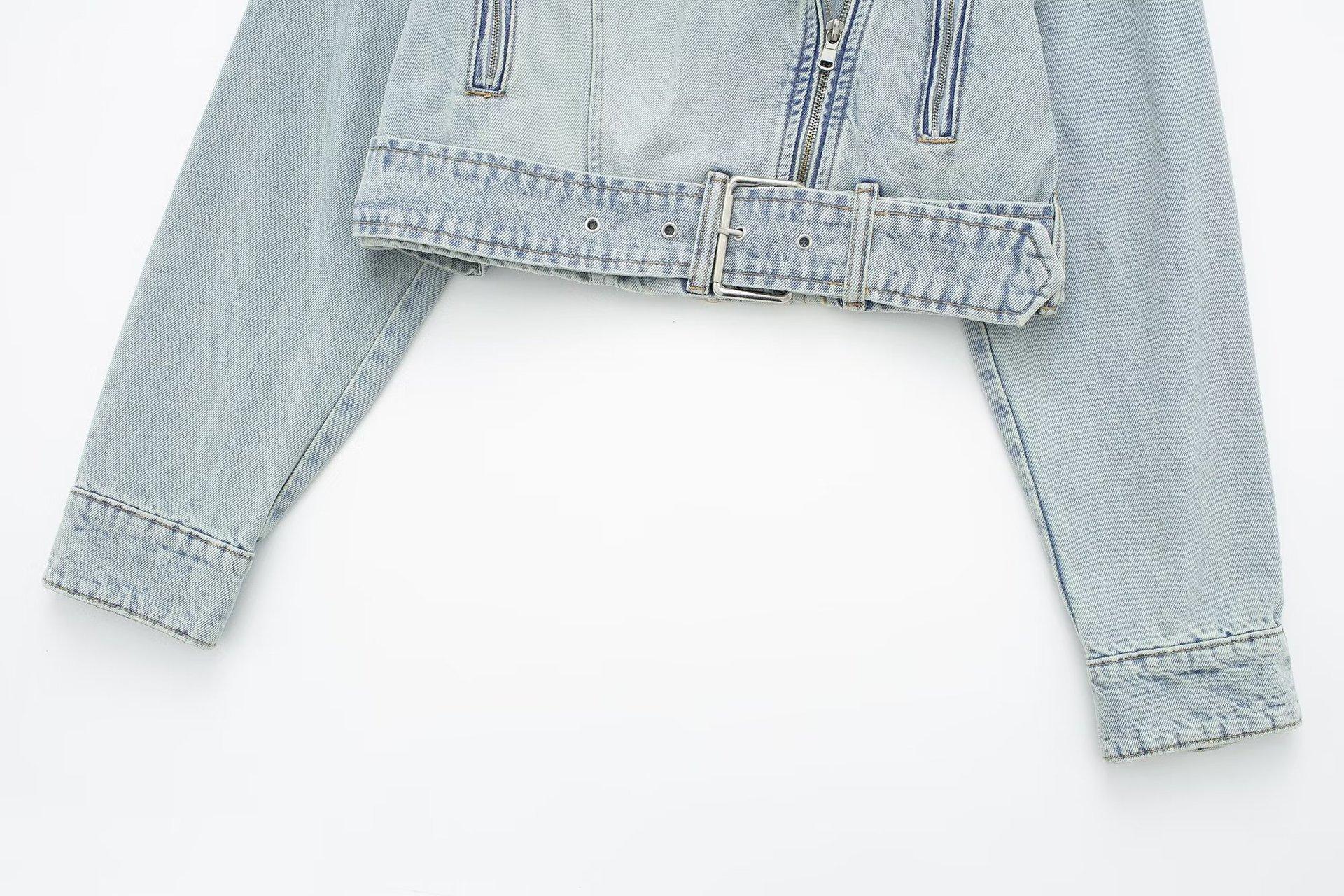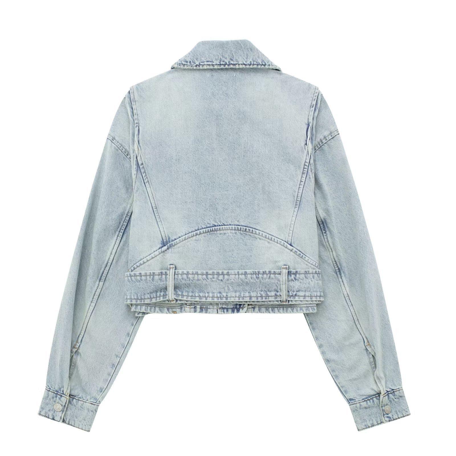 Otoño 2023 Nueva Chaqueta Corta de Mezclilla Estilo Herramientas de Motocicleta para Mujer Estilo Europeo y Americano Picante Solapas Manga Larga Chaqueta con Cinturón
