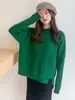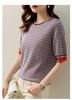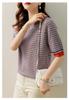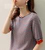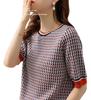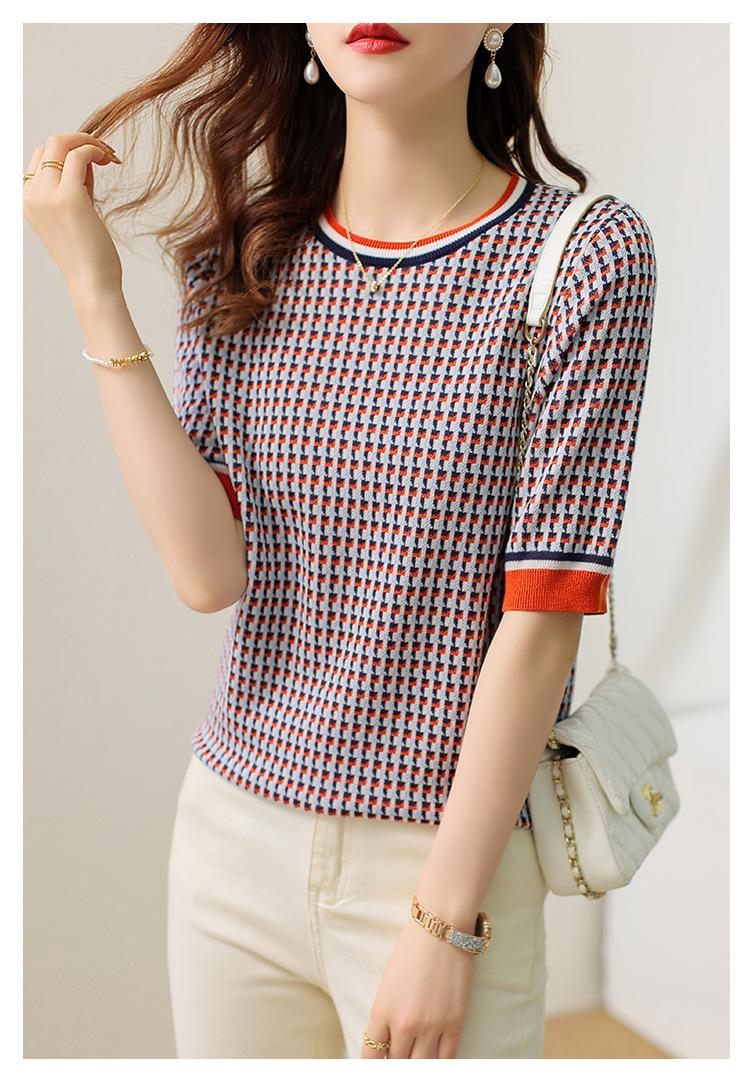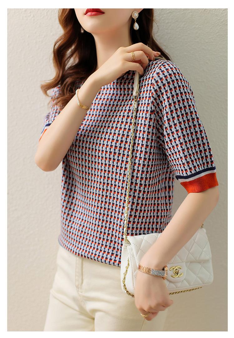 Suéter de manga media de primavera para mujer, suéter vintage con base de jacquard, suéter holgado de cuello redondo y media manga a cuadros.