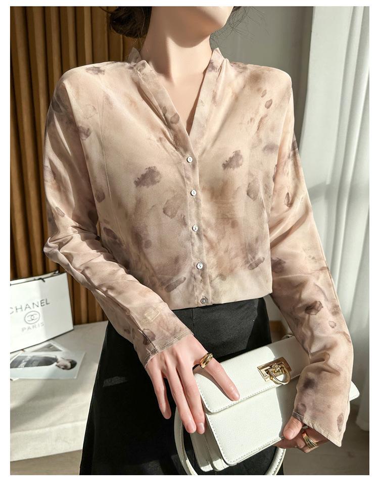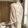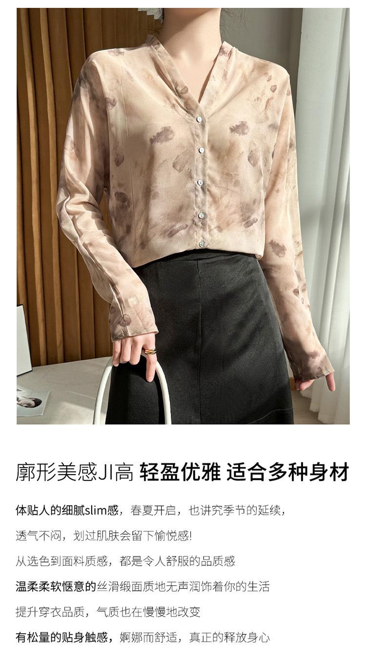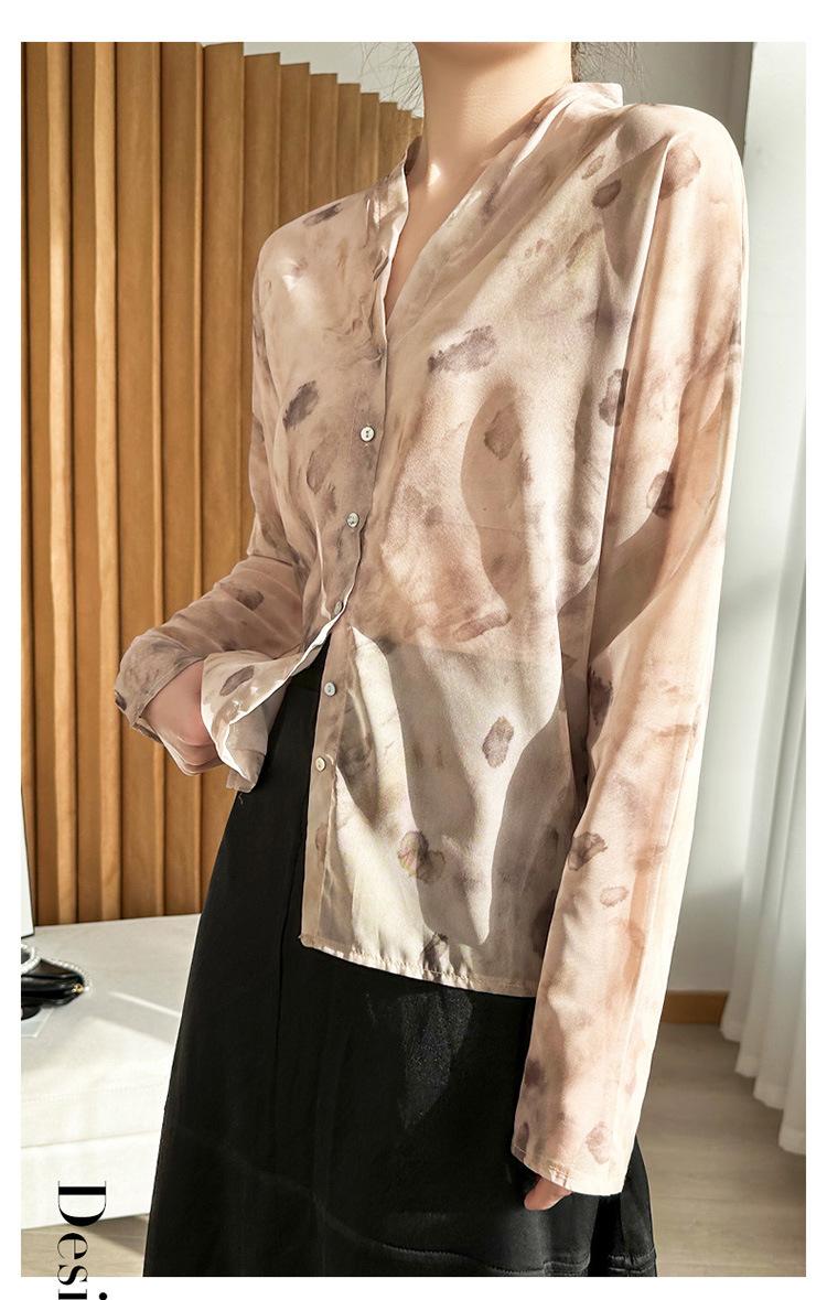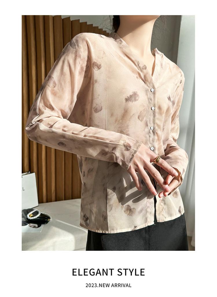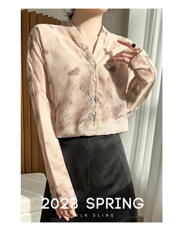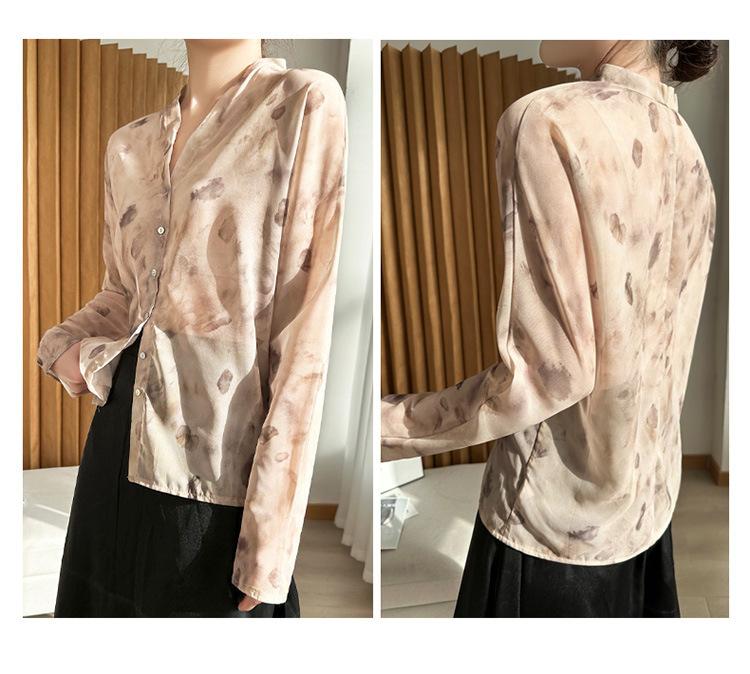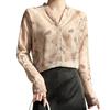 Camisa de satén para mujer, cárdigan con cuello en V, novedad de verano 23, blusa holgada adelgazante con estampado, camisa de manga larga estilo occidental