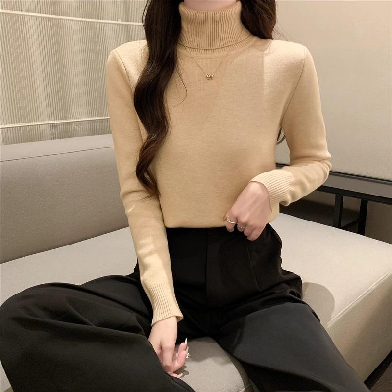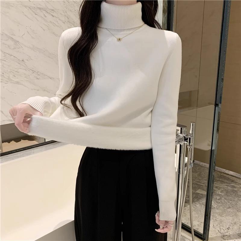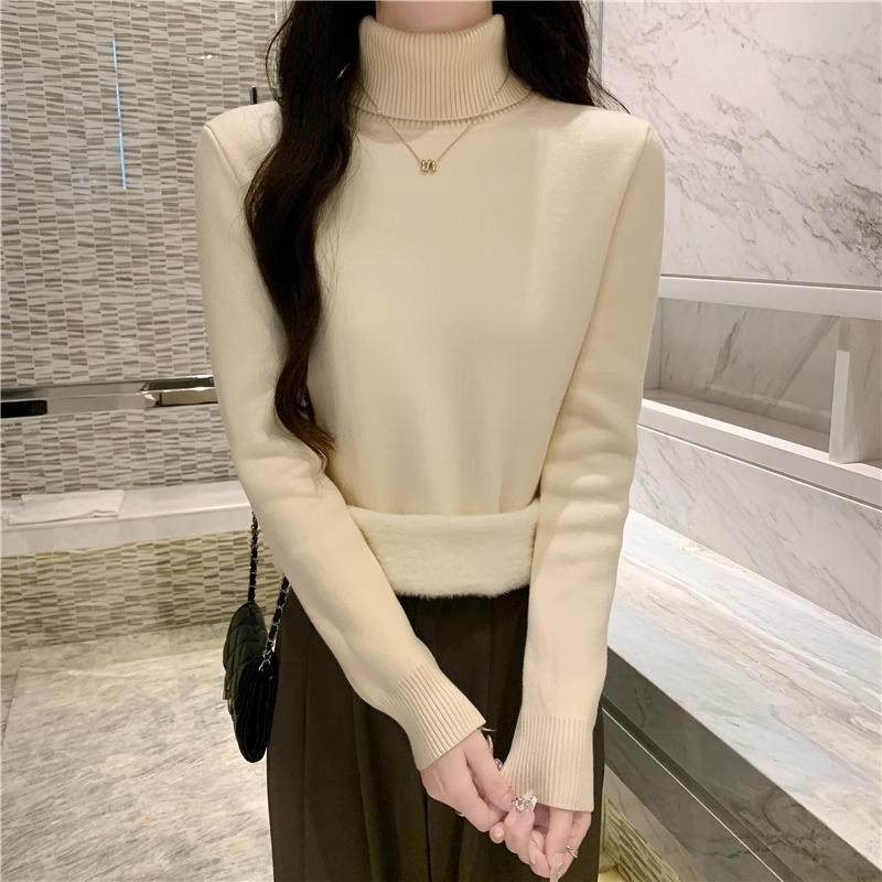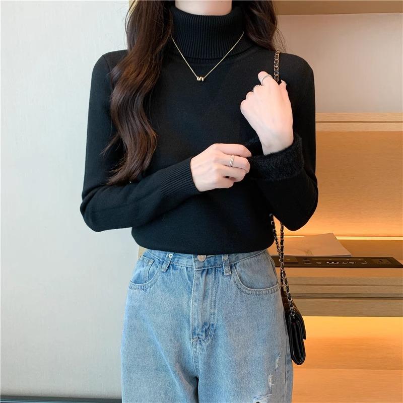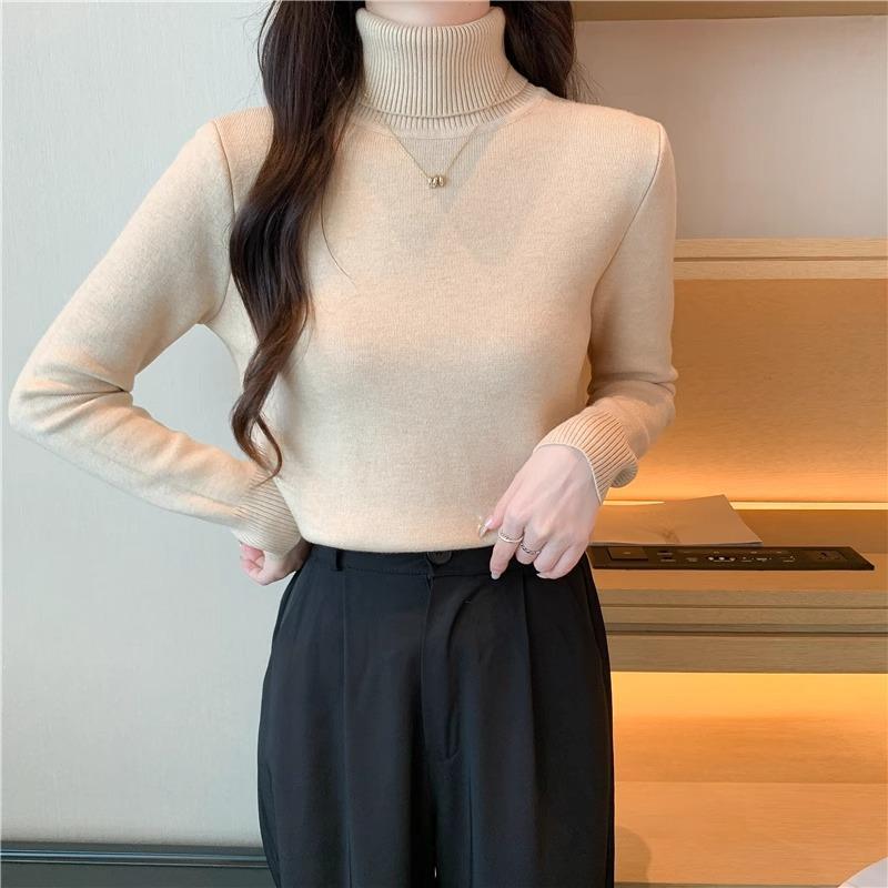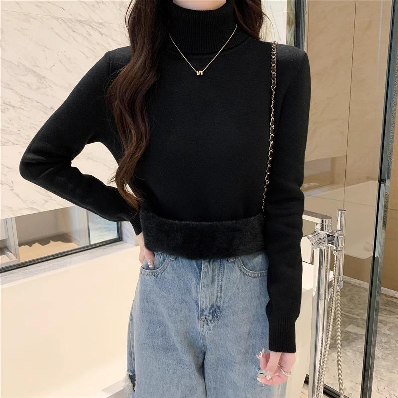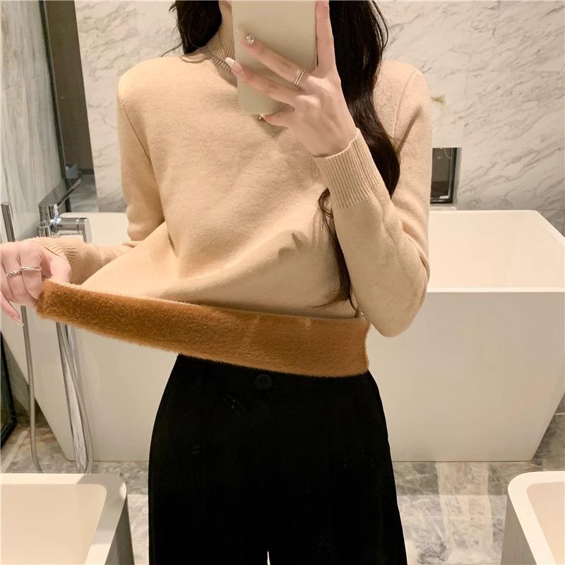 Estilo Otoño e Invierno Tejido de Punto de Fondo de Manga Larga de Fondo Alto con Cuello Alto y Cálido Forrado de Felpa y Grueso Tejido de Punto de Terciopelo de Una Pieza para Mujer