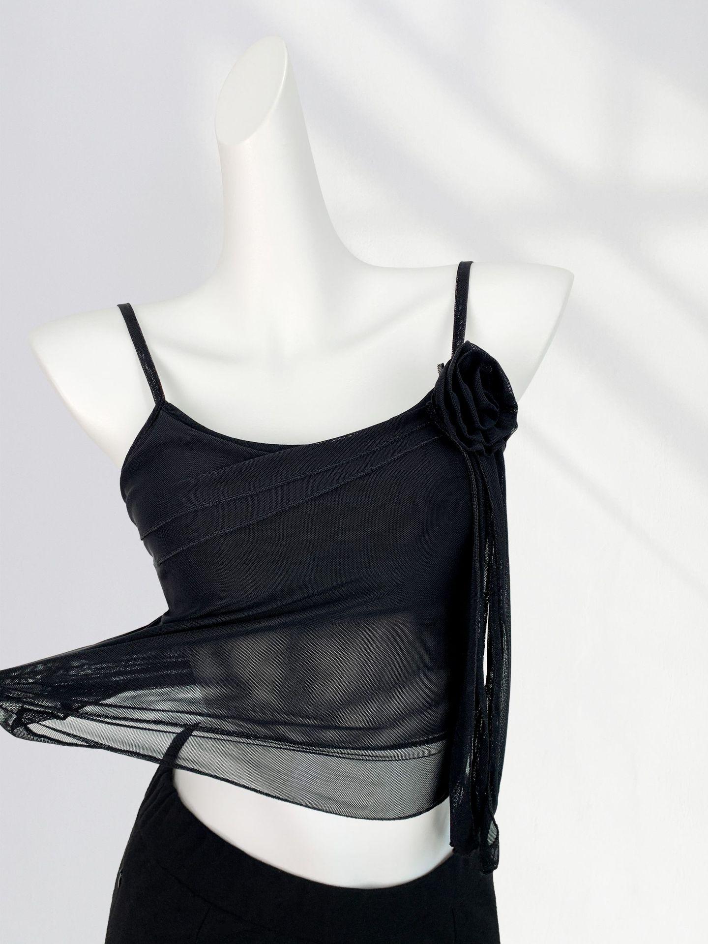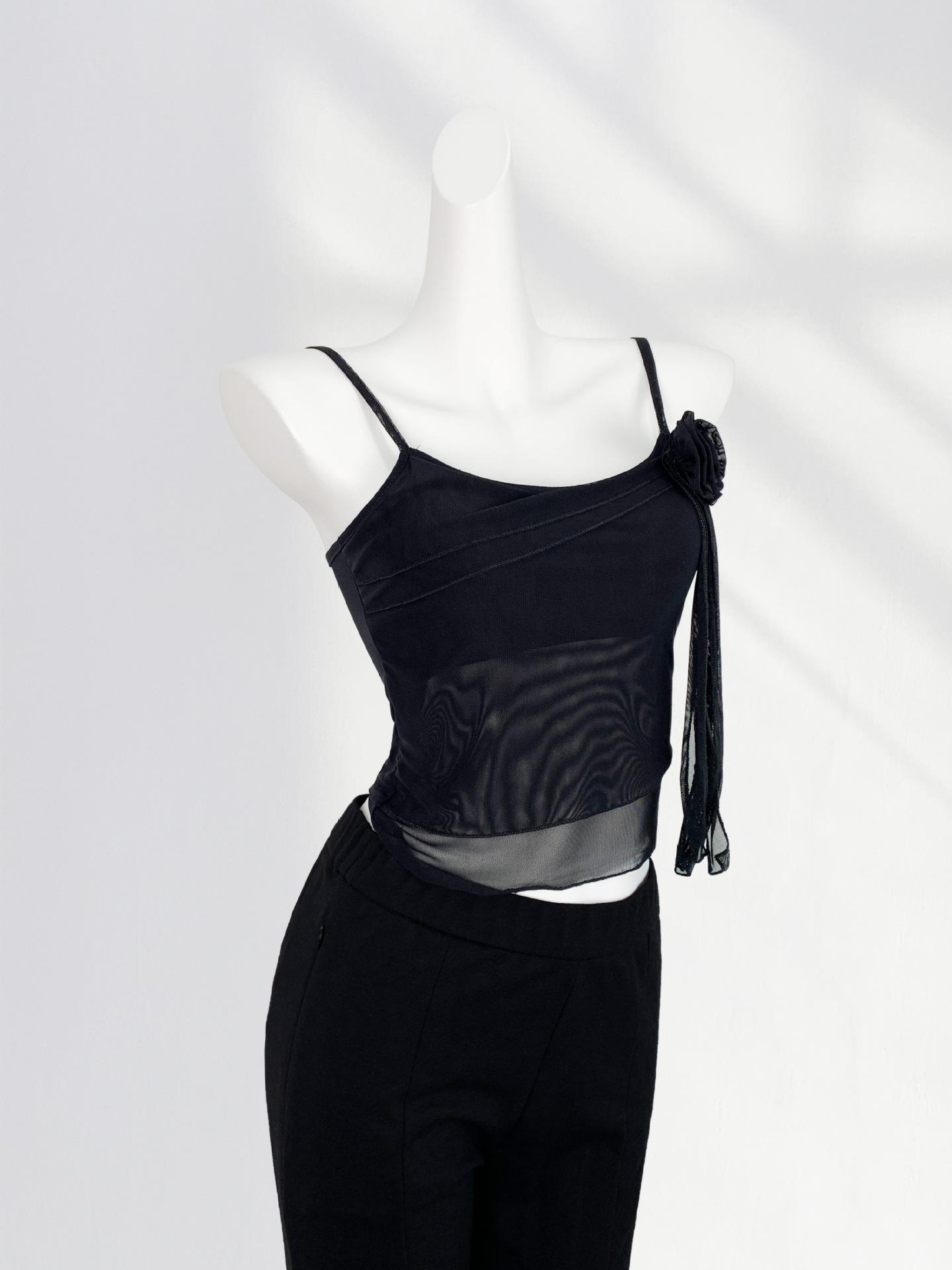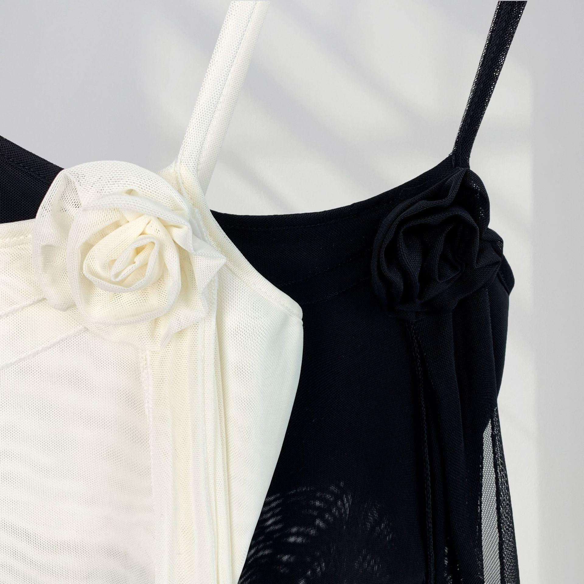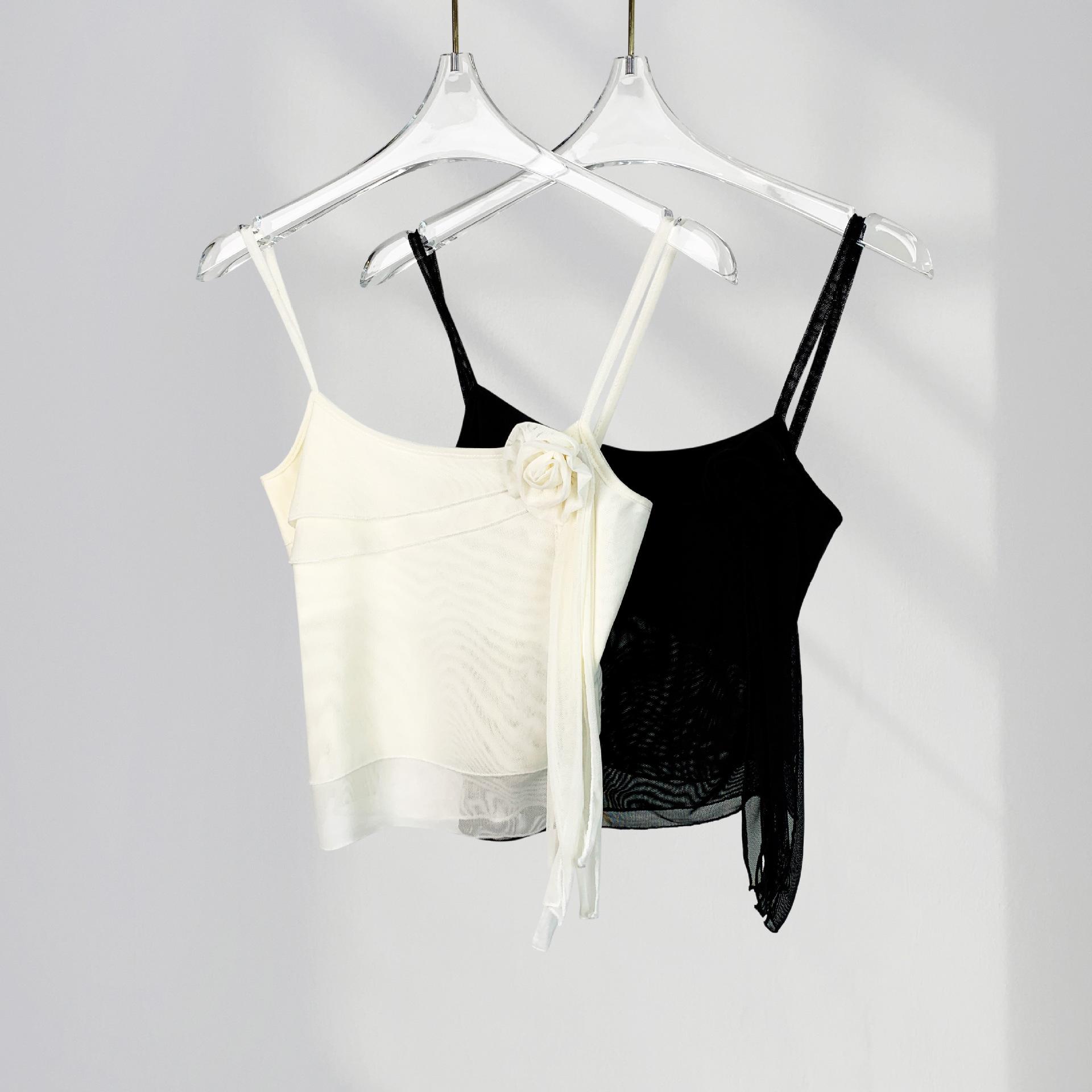 Verano ~ top de tirantes de malla doble con flor rosa dulce y picante estilo puro deseo para mujer chaleco de verano para exterior