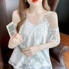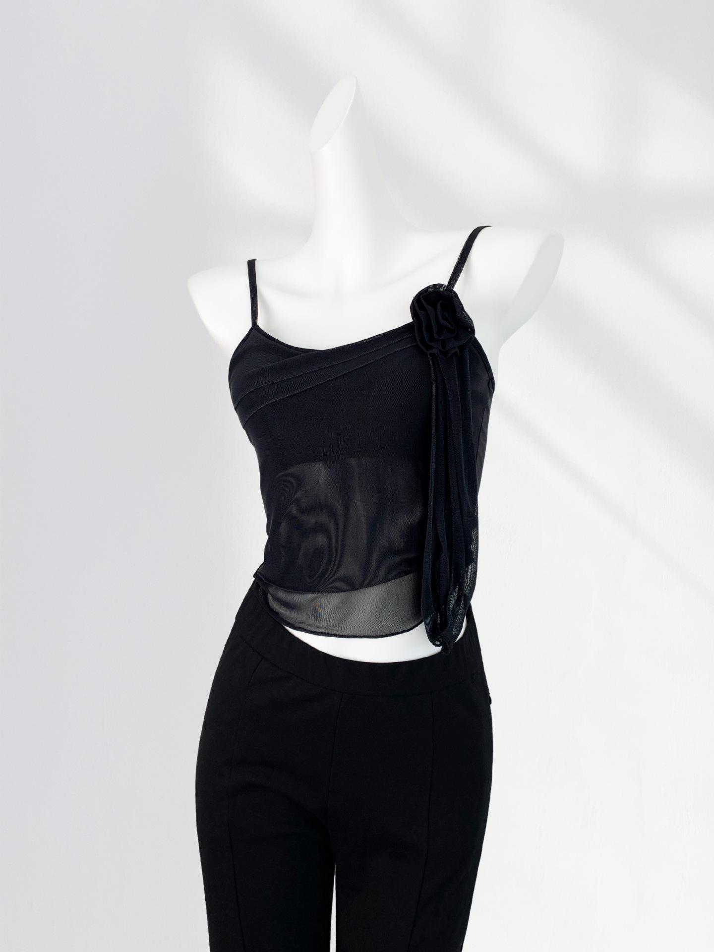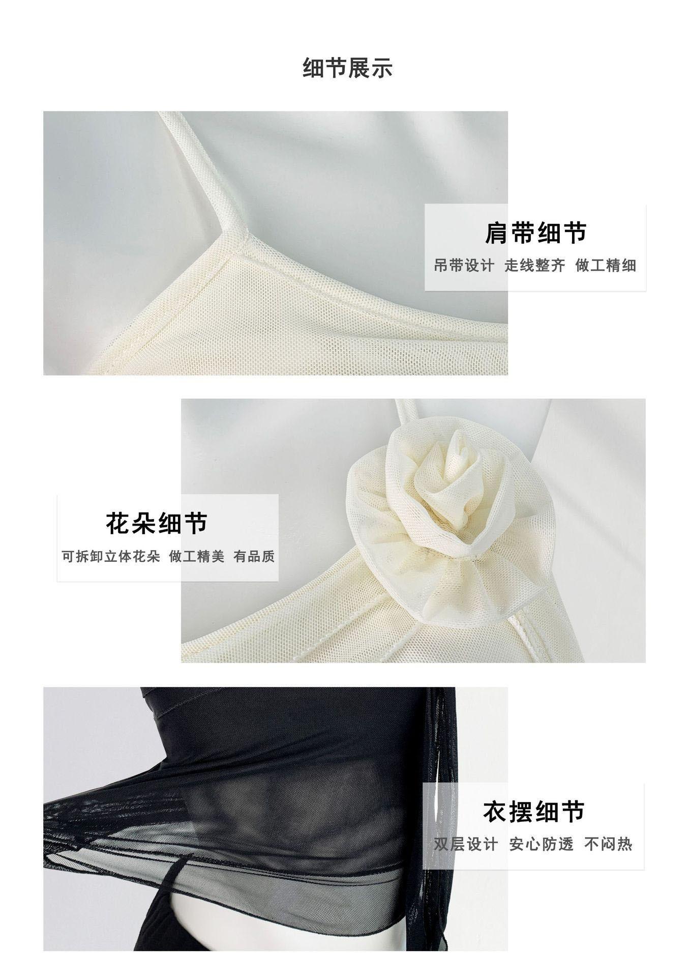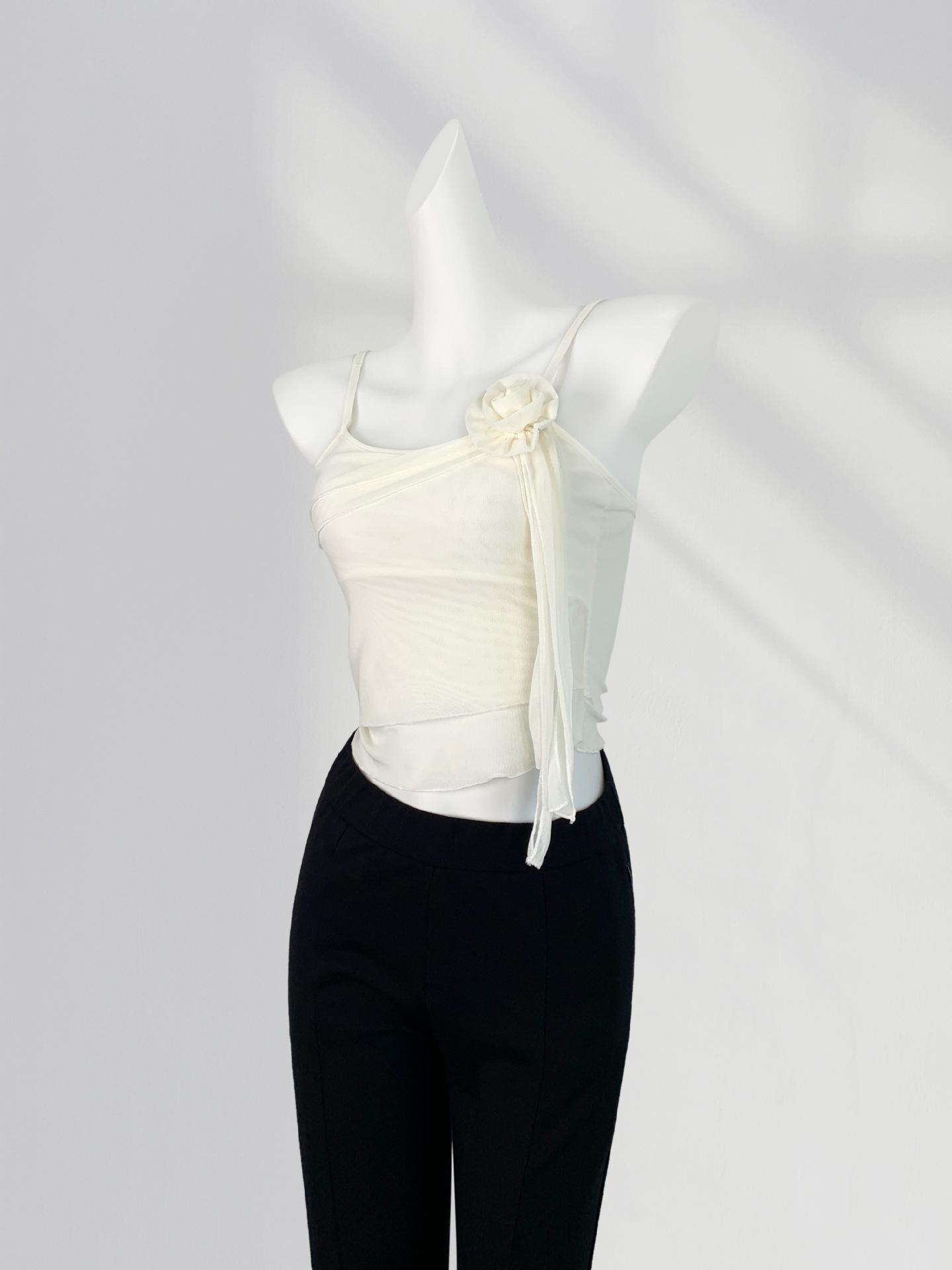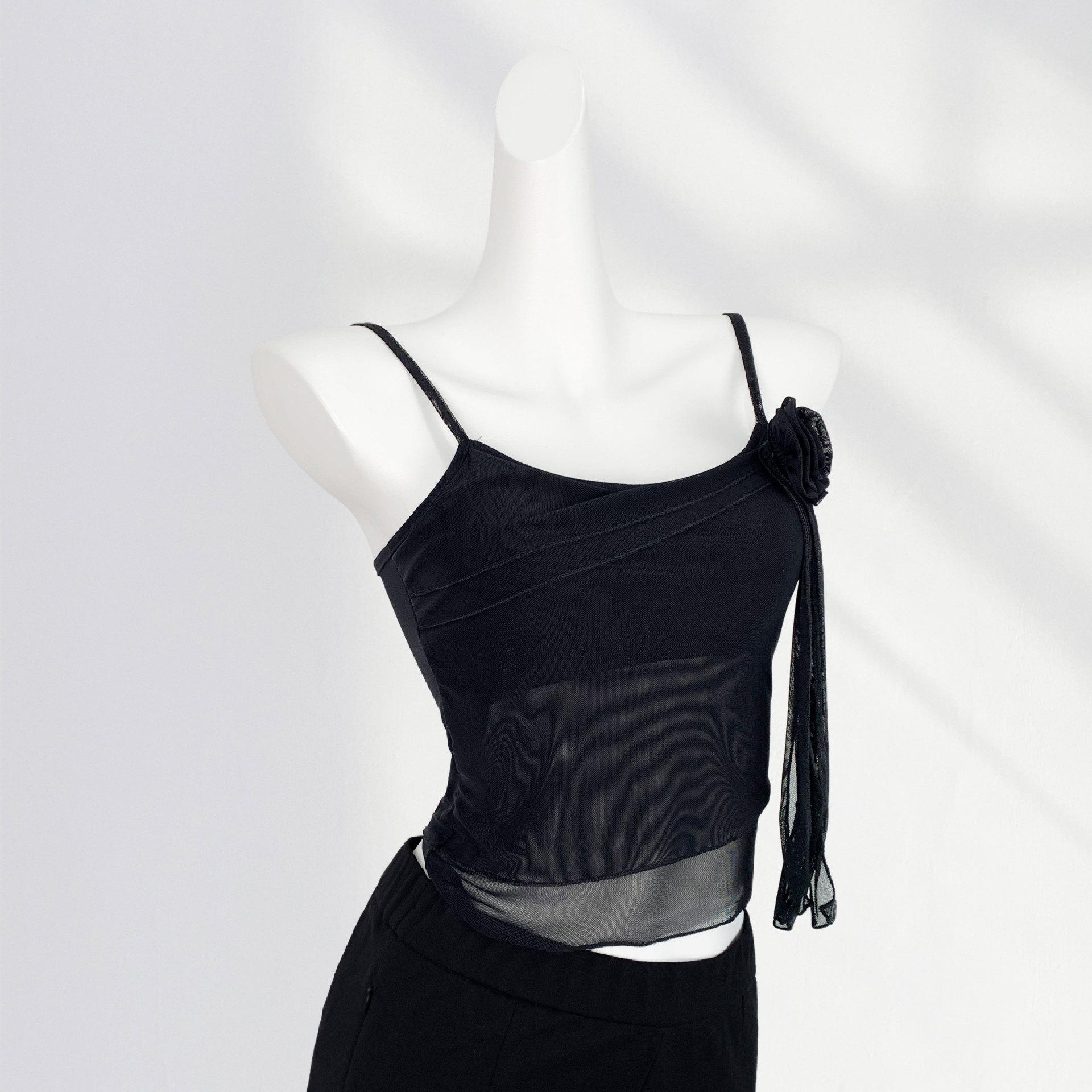 Verano ~ top de tirantes de malla doble con flor rosa dulce y picante estilo puro deseo para mujer chaleco de verano para exterior