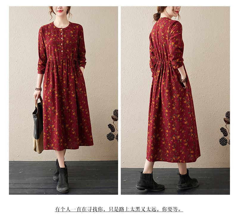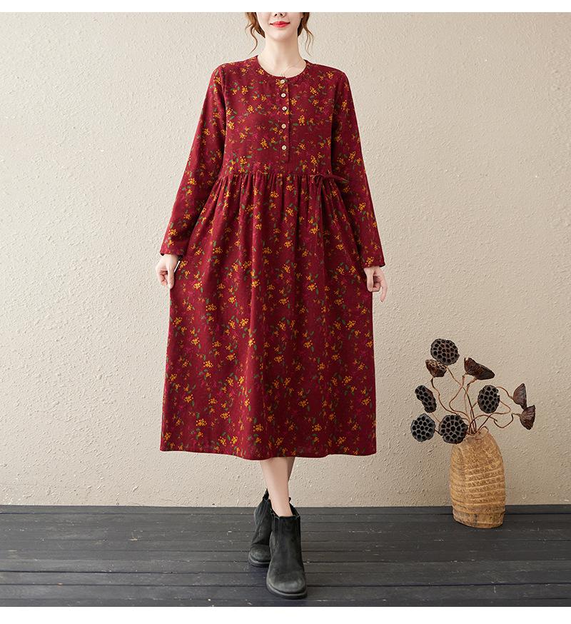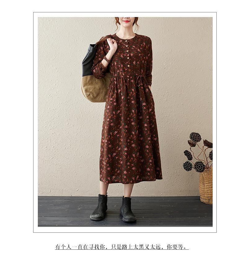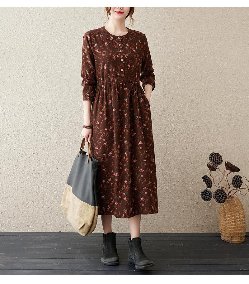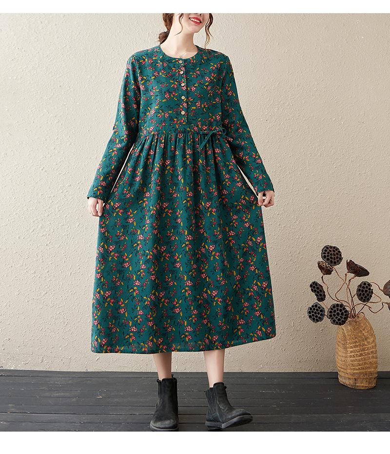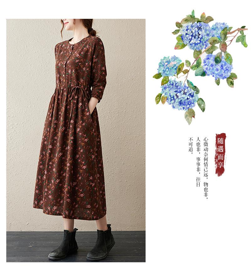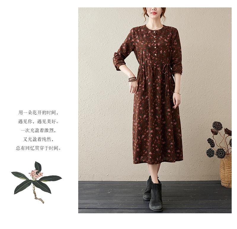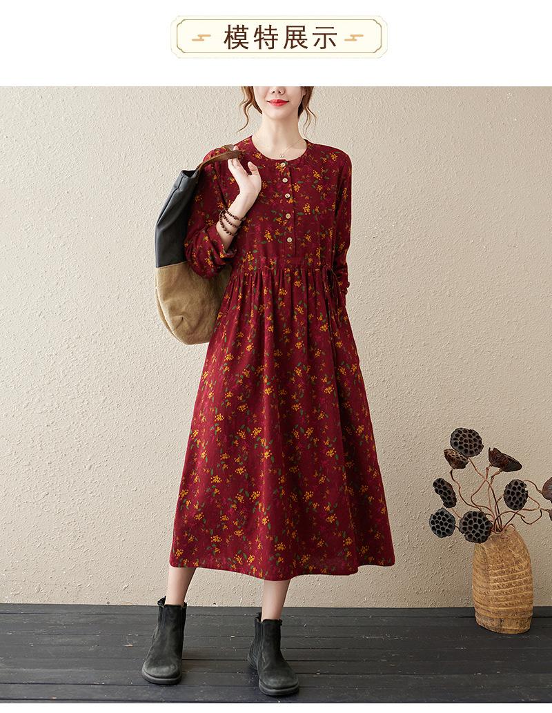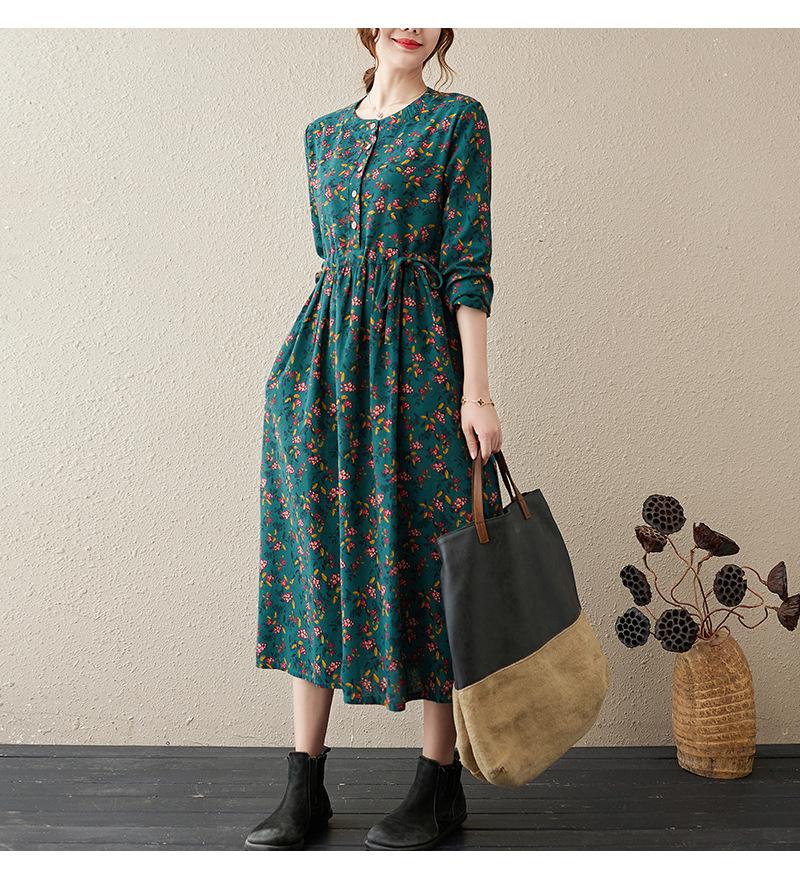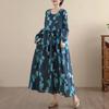 Vestido largo de lino y algodón con estampado floral retro artístico, de manga larga, ajustado, con cordones, holgado y adelgazante, para mujer