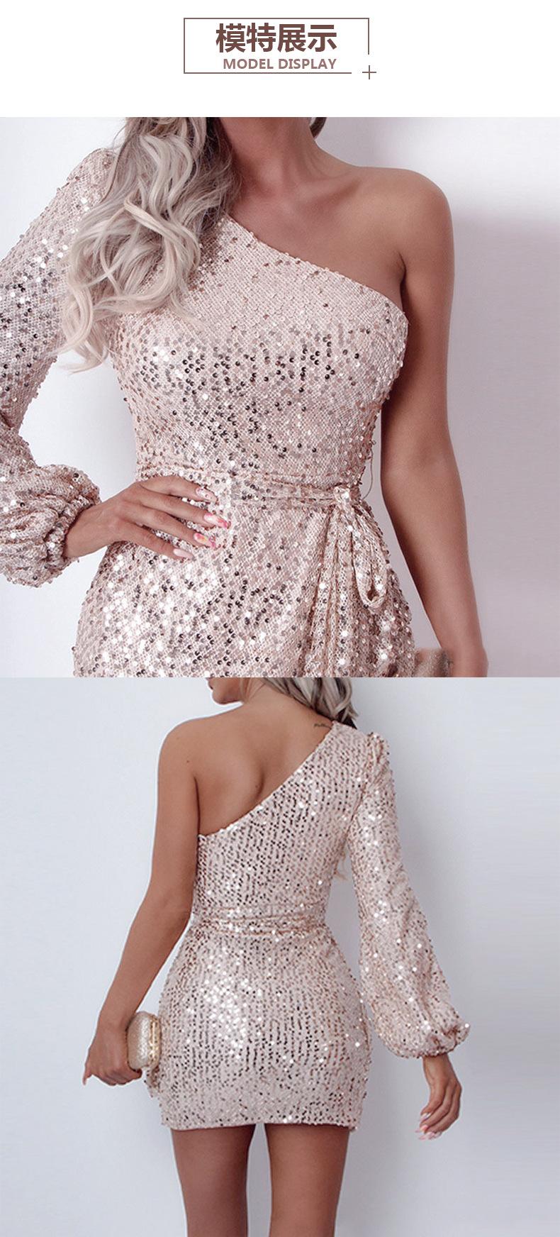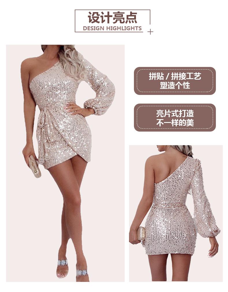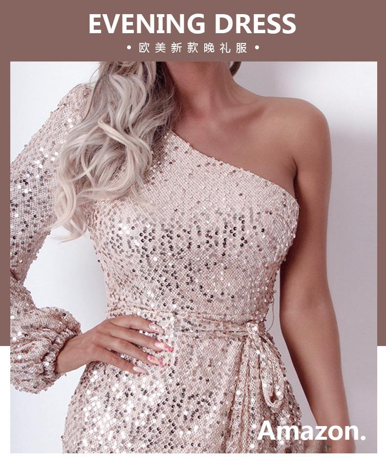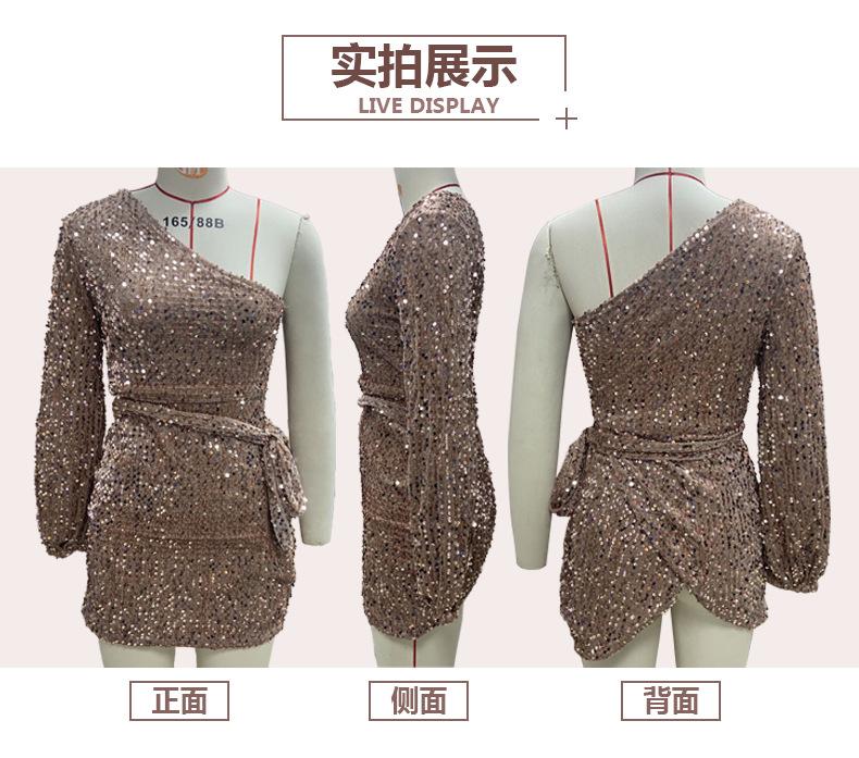 2025 Nuevo Vestido Europeo y Americano Transfronterizo de Amazon con Lentejuelas de Manga Larga con Un Hombro Descubierto y Falda Asimétrica con Lentejuelas