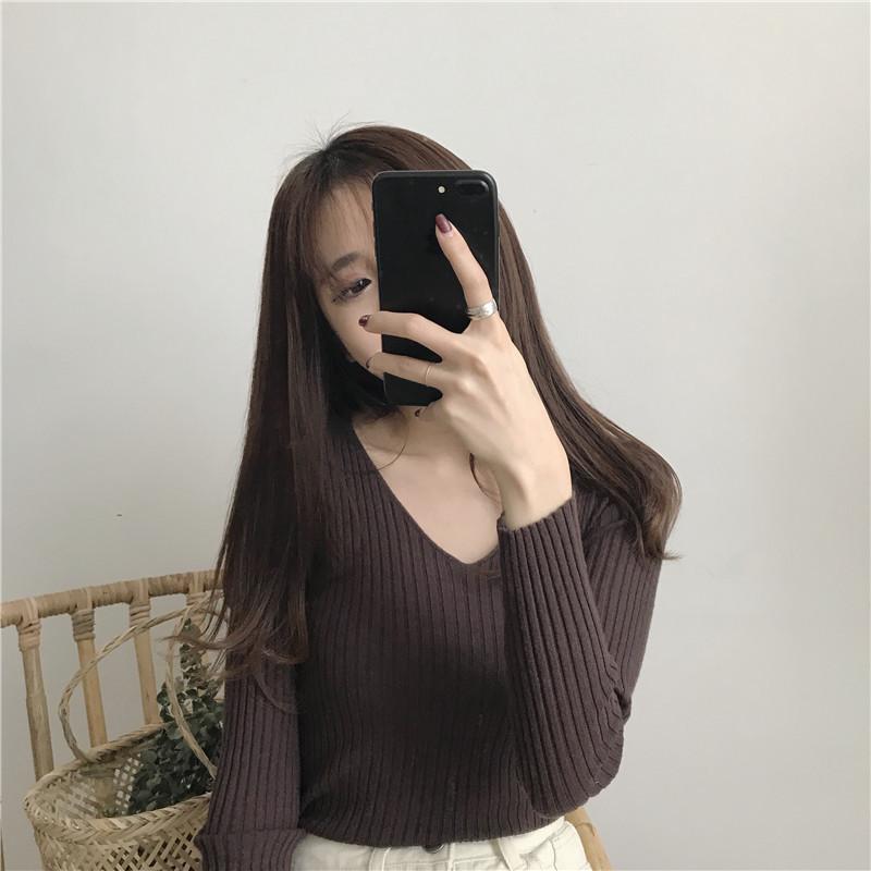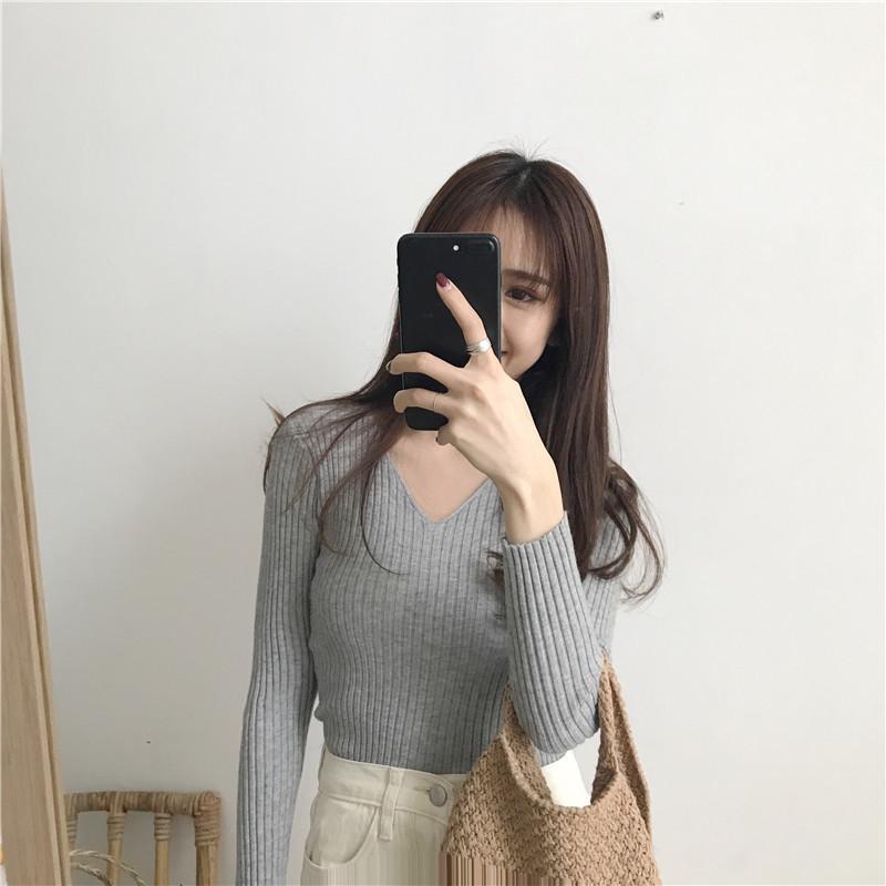 Suéter de punto de estilo coreano de otoño para mujer, jersey de cuello en V de color liso que combina con todo, camisa básica de manga larga ajustada, top informal para estudiantes