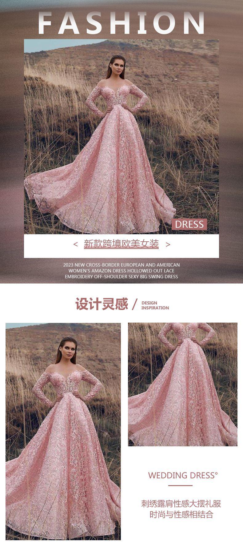 2025 Nuevo Ropa Europea y Americana Transfronteriza Vestido Amazon Encaje Calado Bordado Hombro Descubierto Sexy Vestido Swing