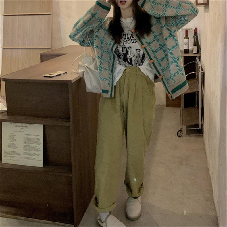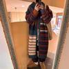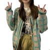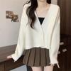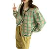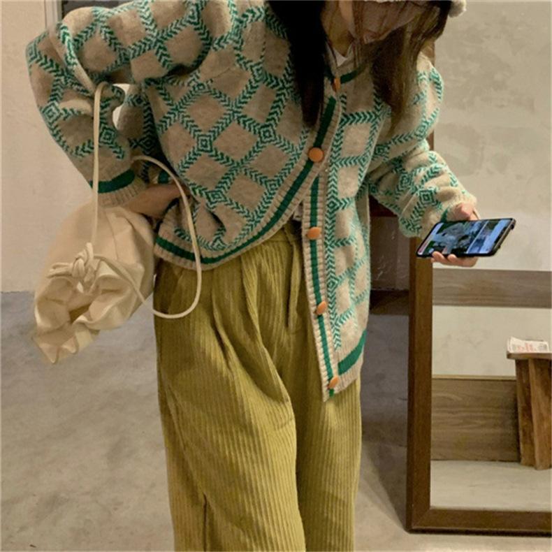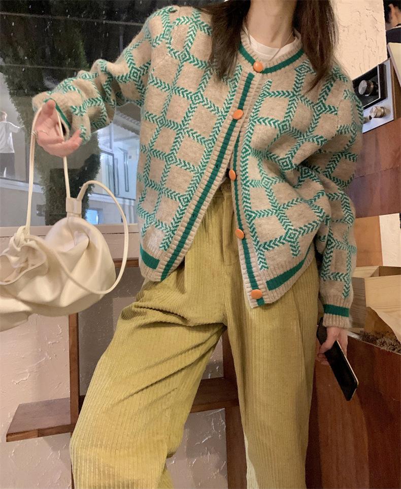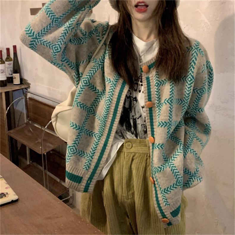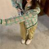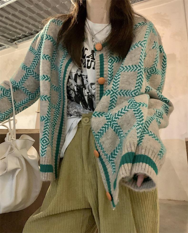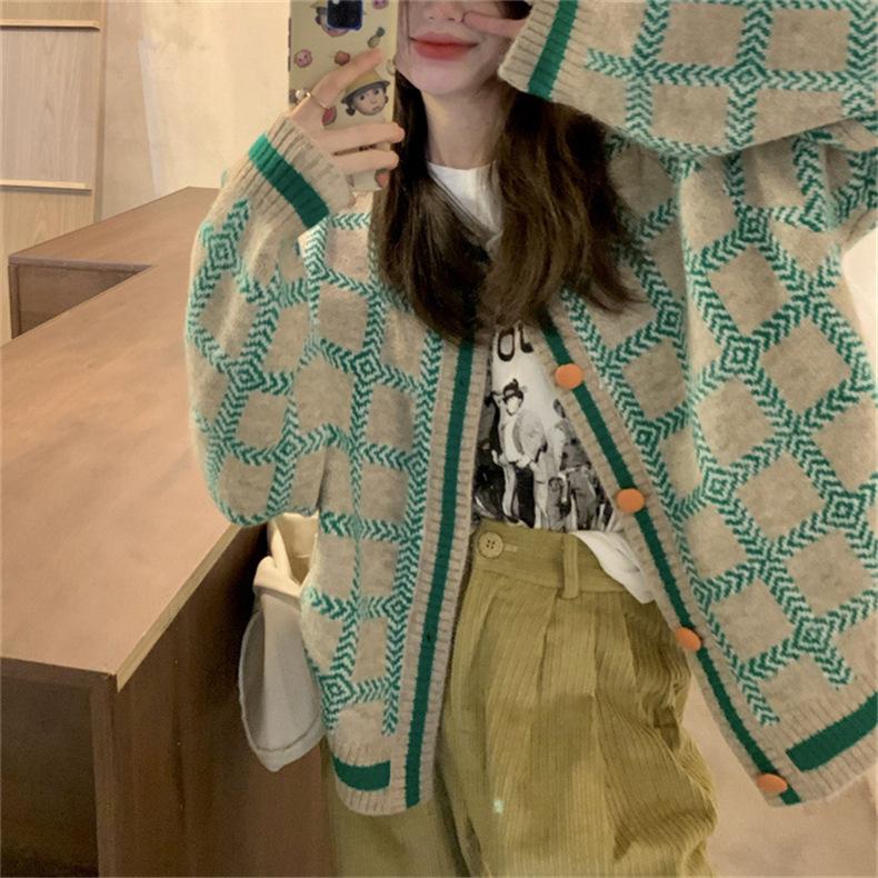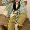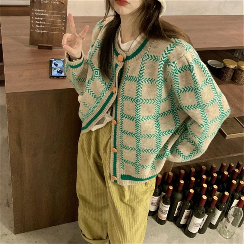 Suéter a cuadros japonés tipo cárdigan para mujer, abrigo de punto retro holgado con contraste, top corto holgado y grueso para otoño e invierno.