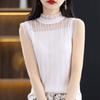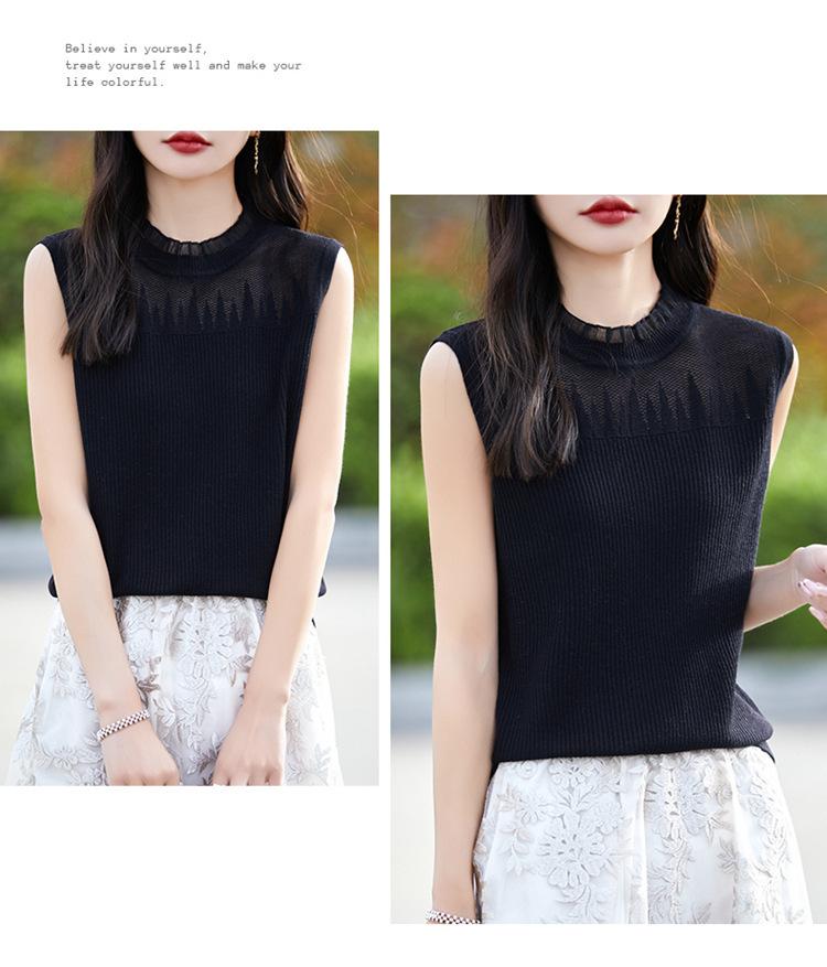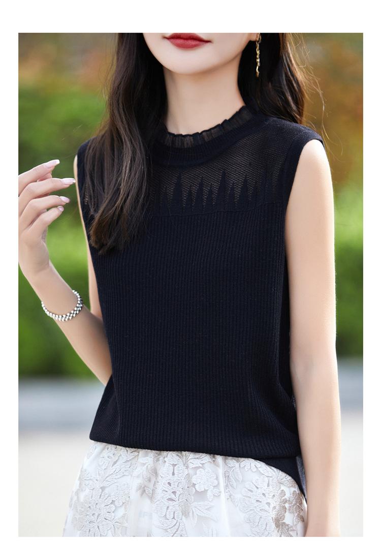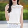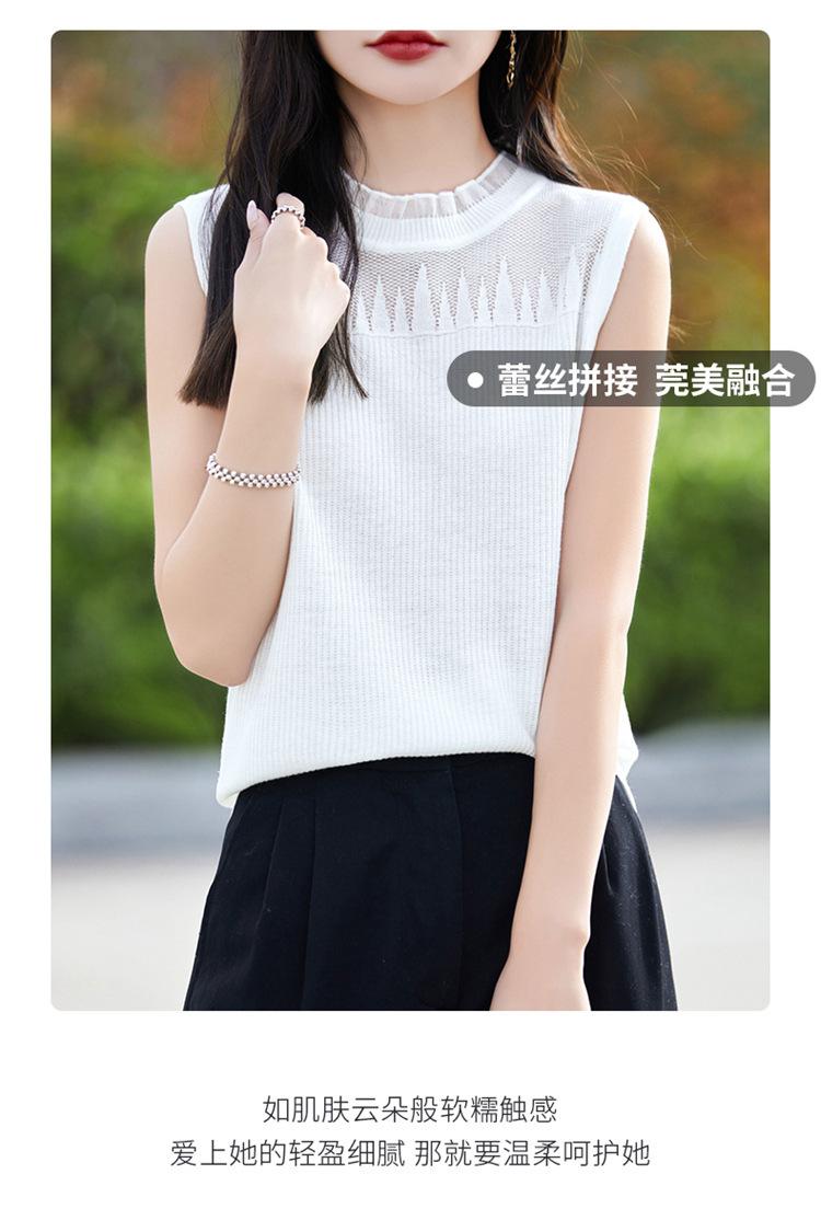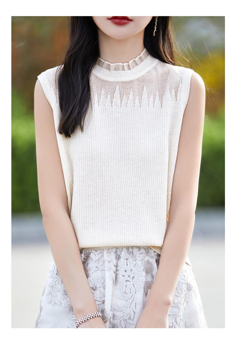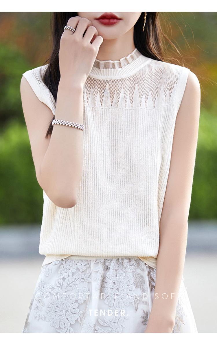 Chaleco sin mangas de lana peinada estilo francés con cuello de encaje para las orejas para mujer, verano nuevo, camiseta interior de punto calado de manga corta para mujer