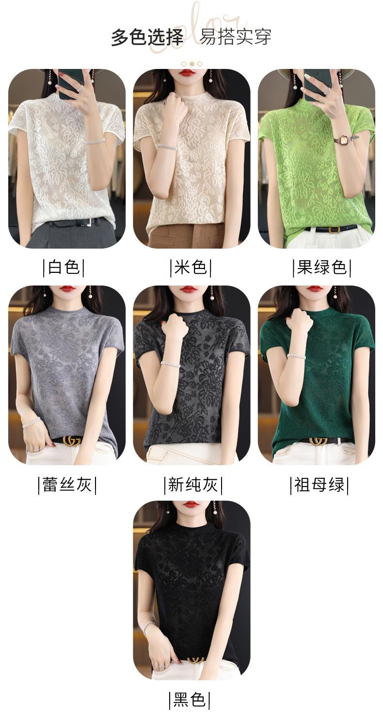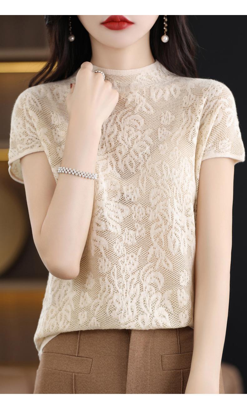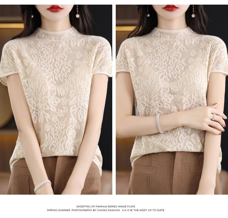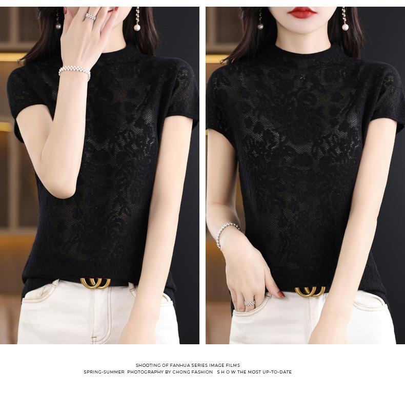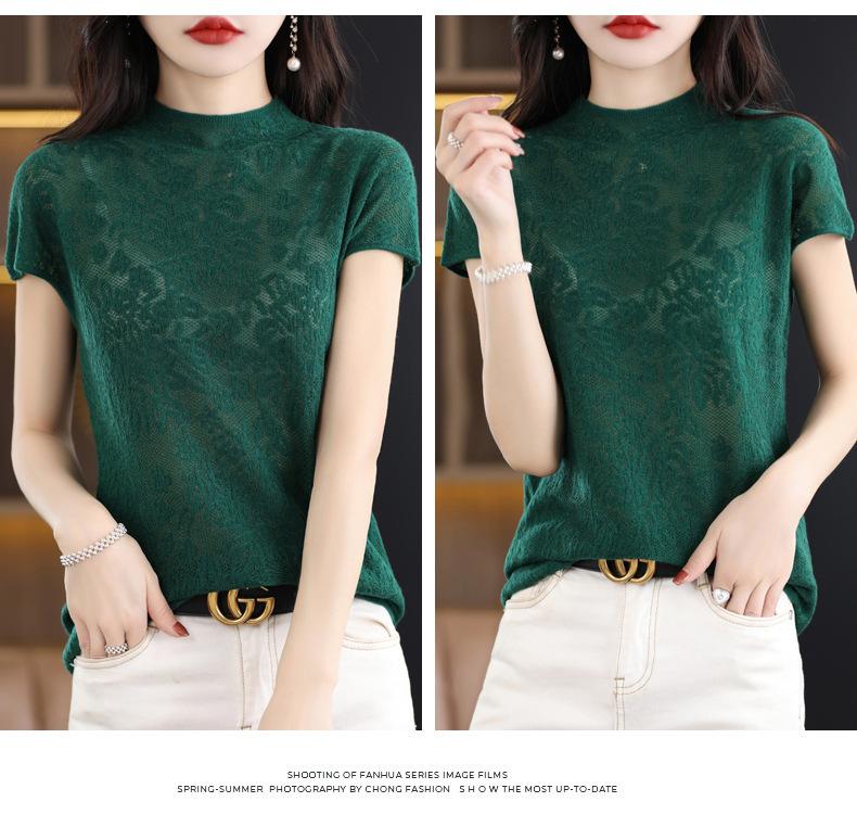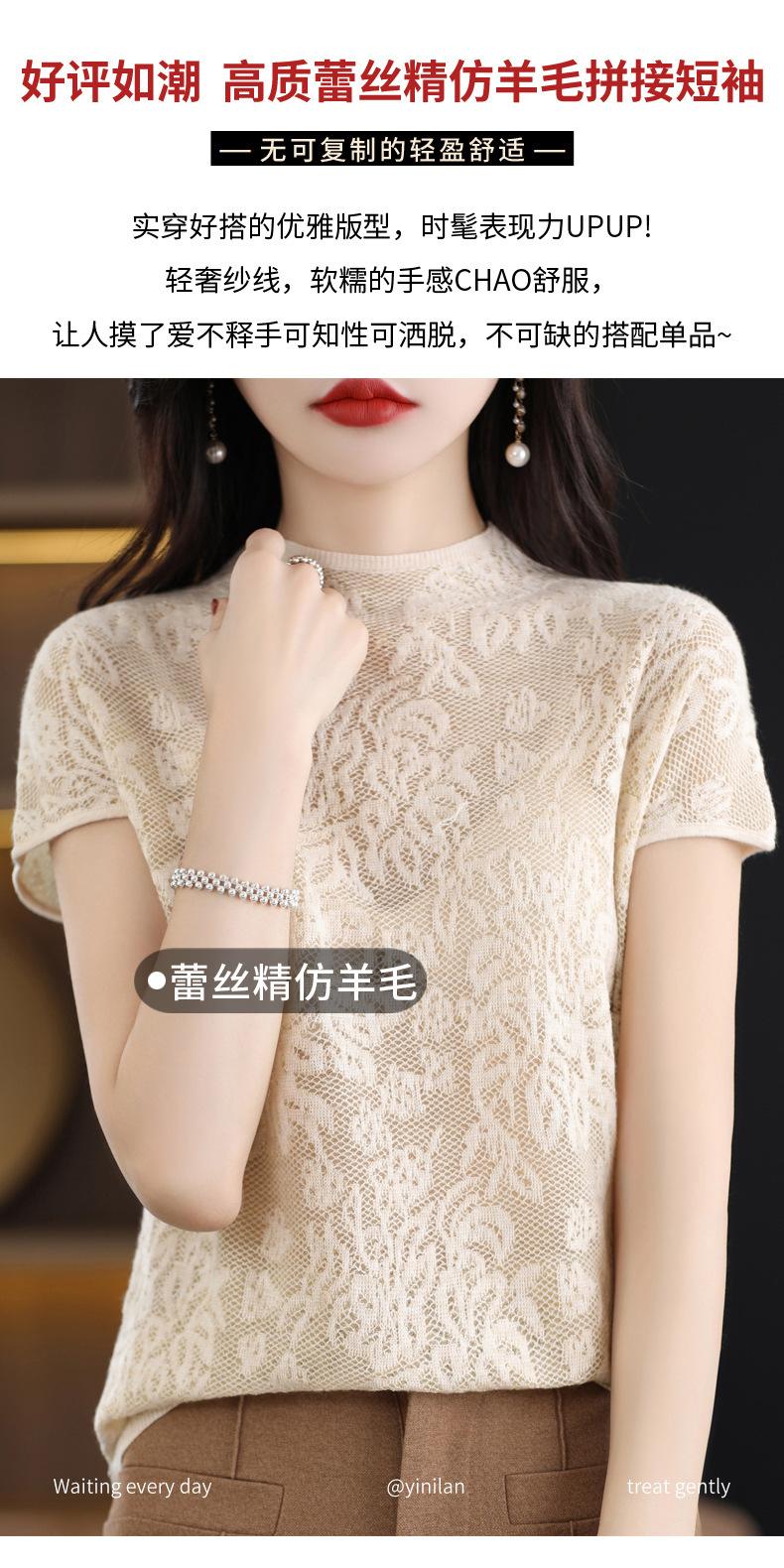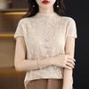 Suéter de lana peinada para mujer, novedad de verano 2023, camiseta de encaje de cuello medio alto y manga corta de estilo dulce