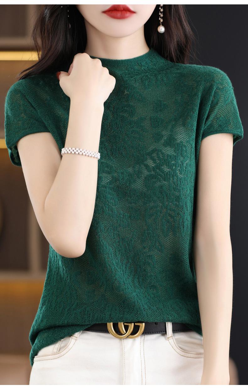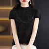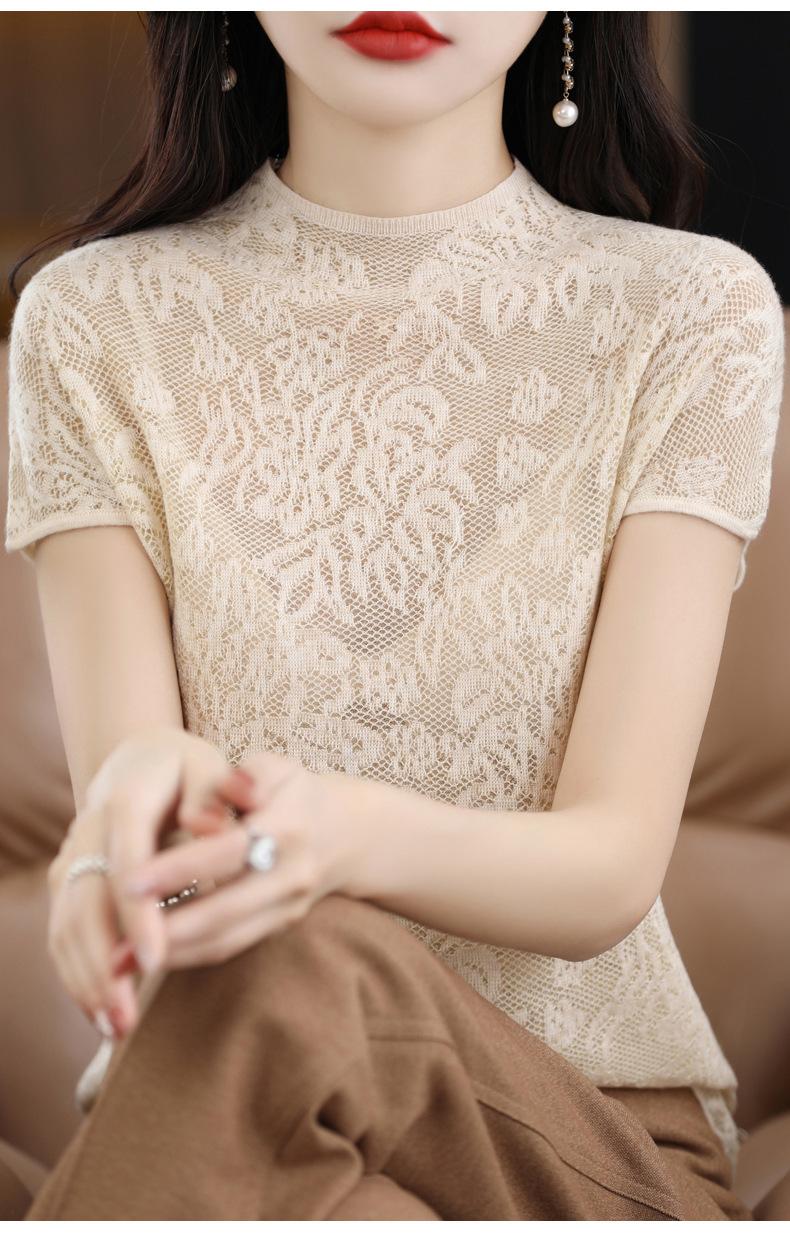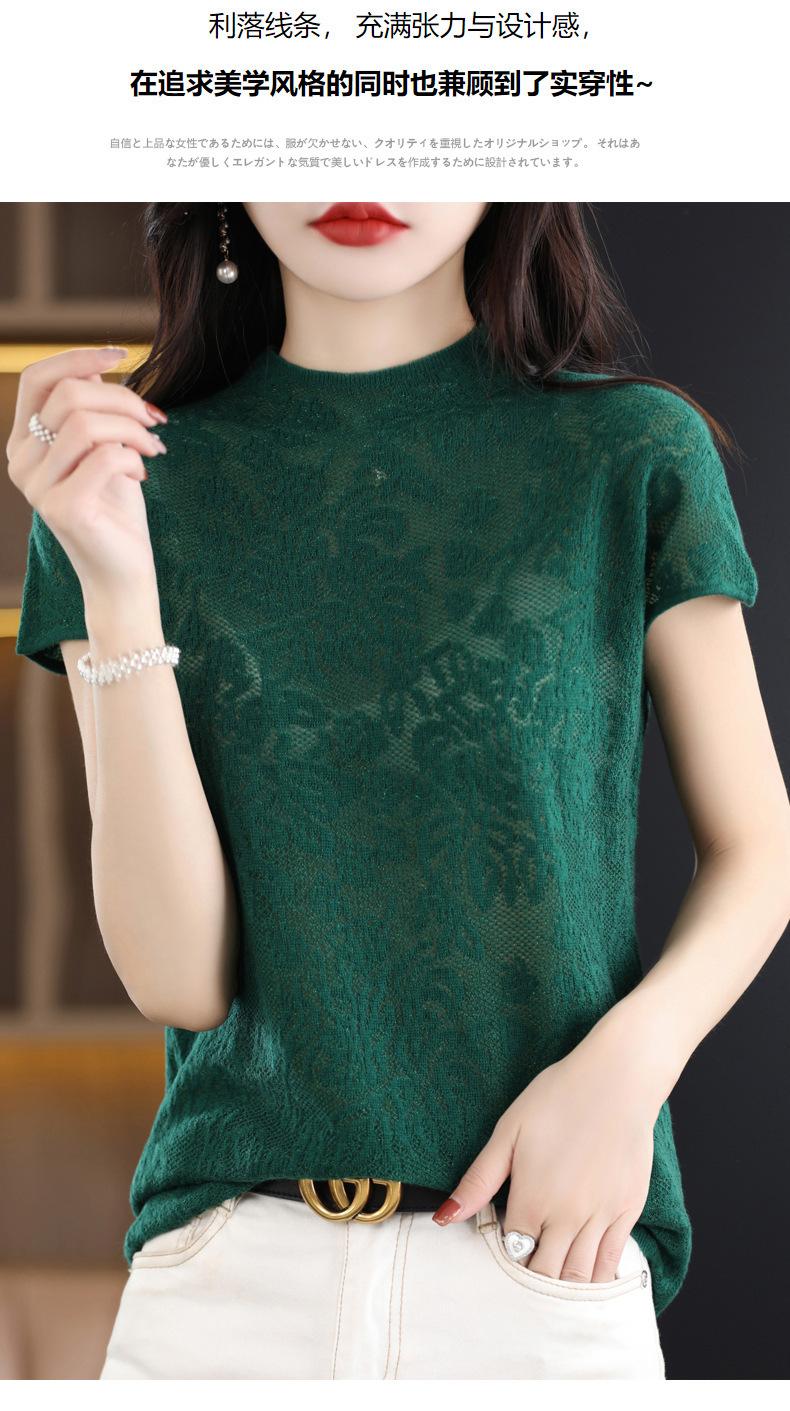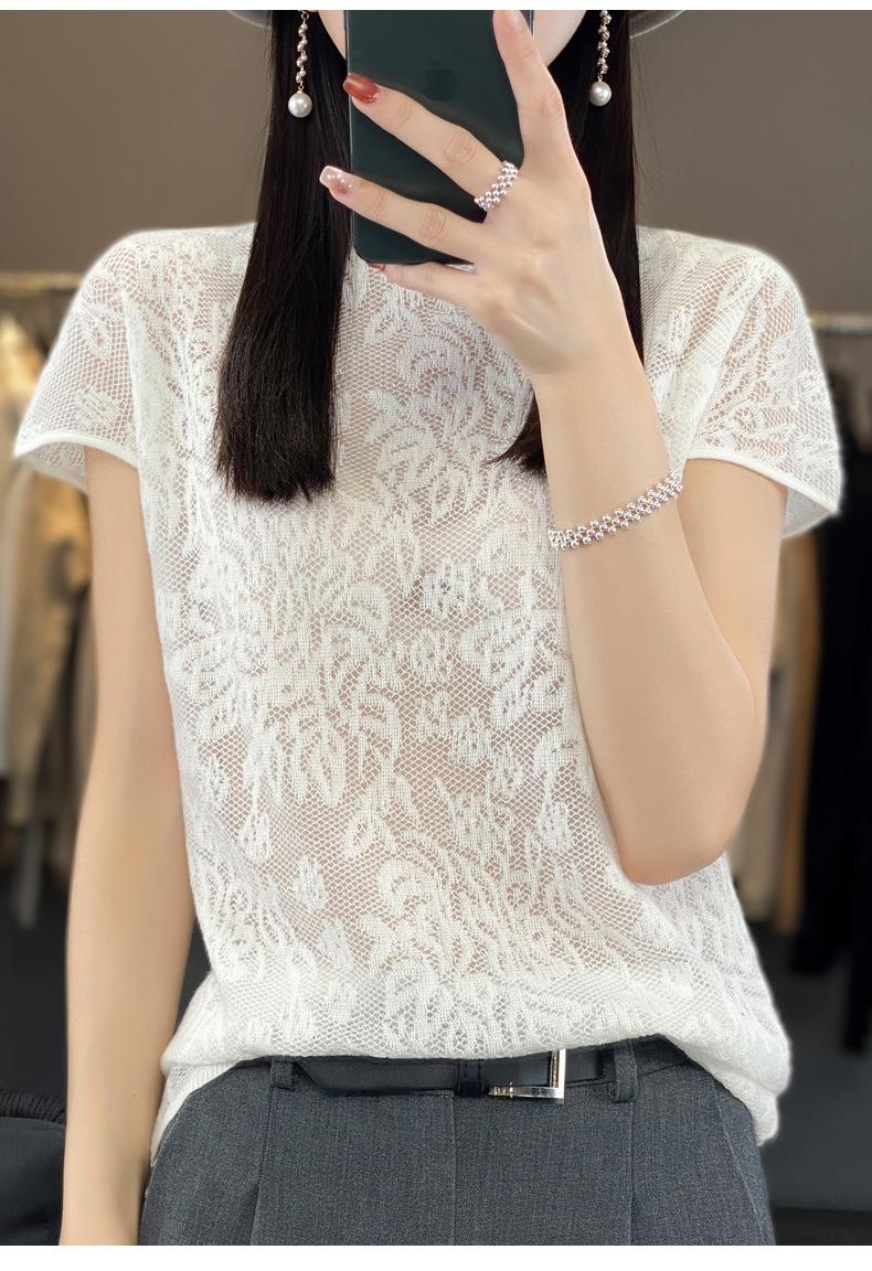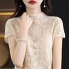 Suéter de lana peinada para mujer, novedad de verano 2023, camiseta de encaje de cuello medio alto y manga corta de estilo dulce